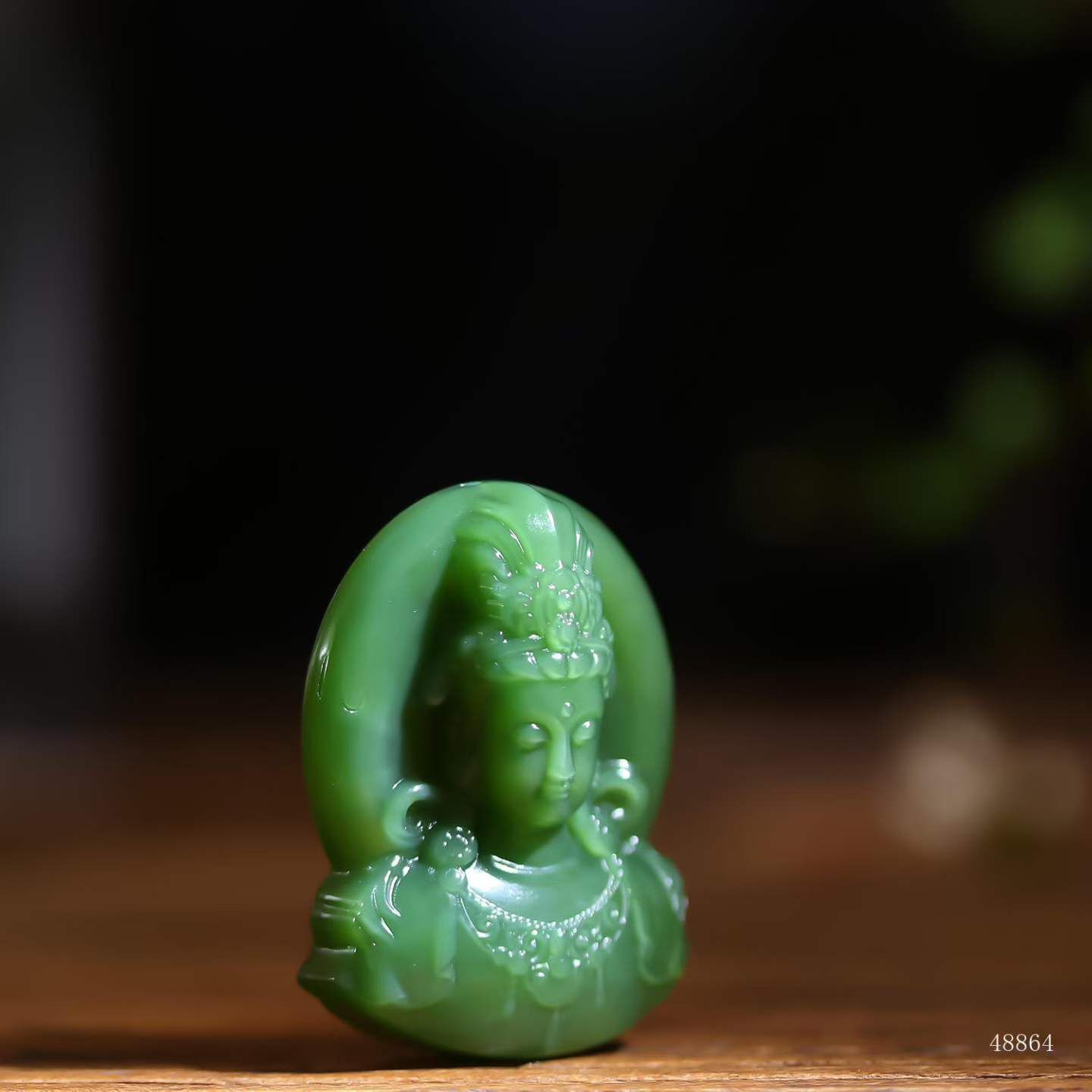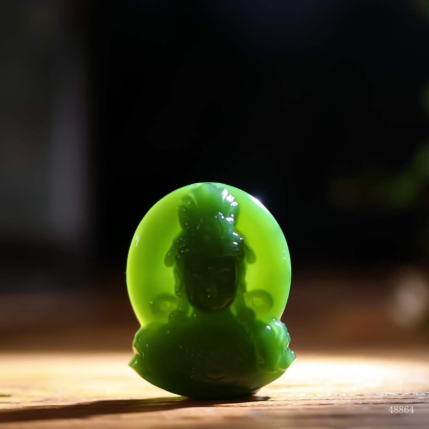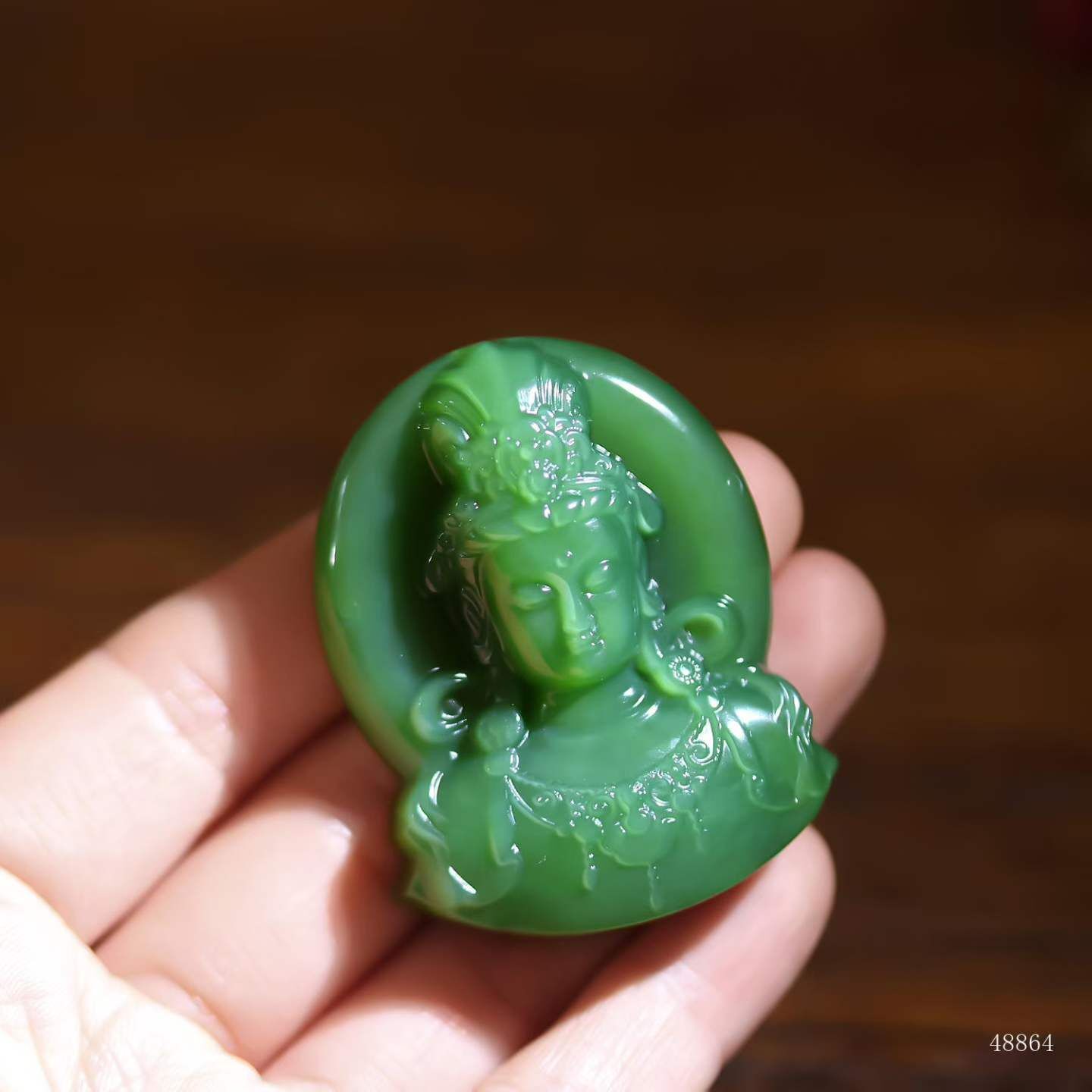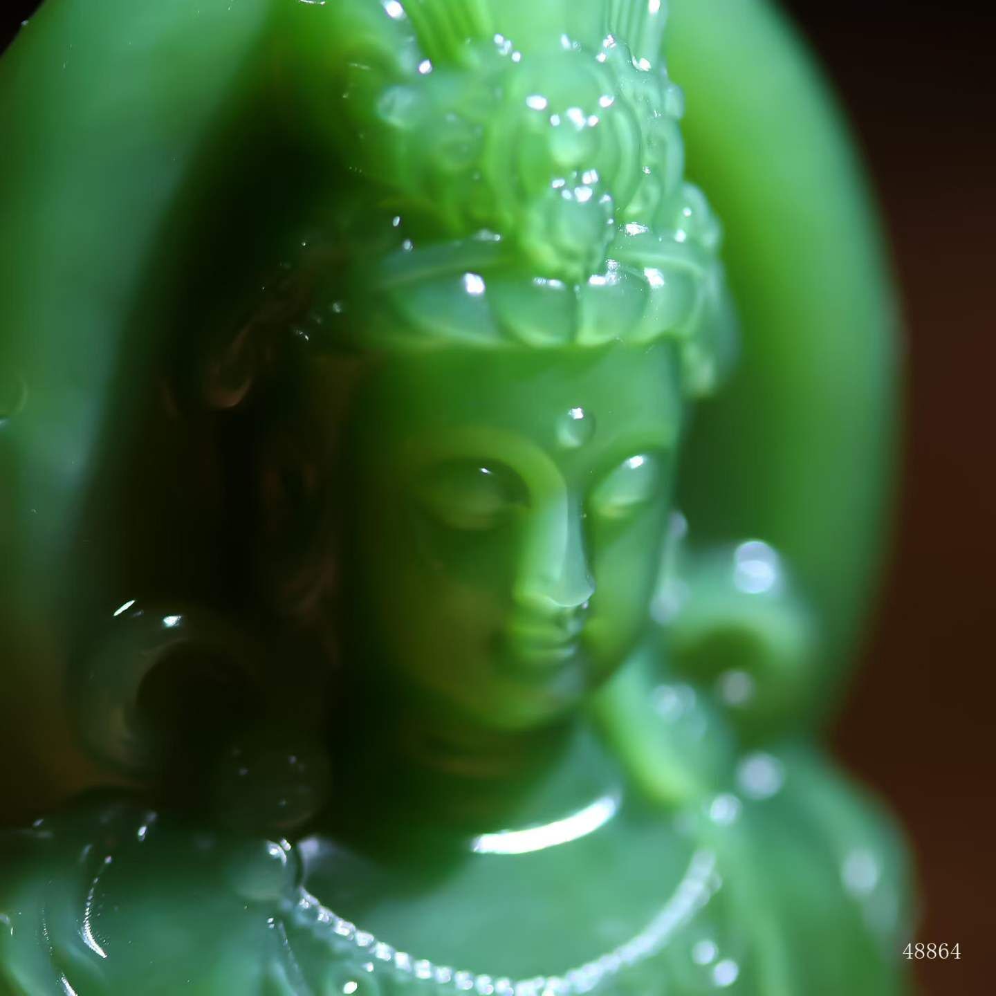 天然和田玉,碧玉青潤若深林靜水,玉脂凝光似膏脂初融。觀音寶相如滿月映雪,眉目低垂含無量慈悲,面容秀美如初月出霧,肩披天衣似流雲垂落。