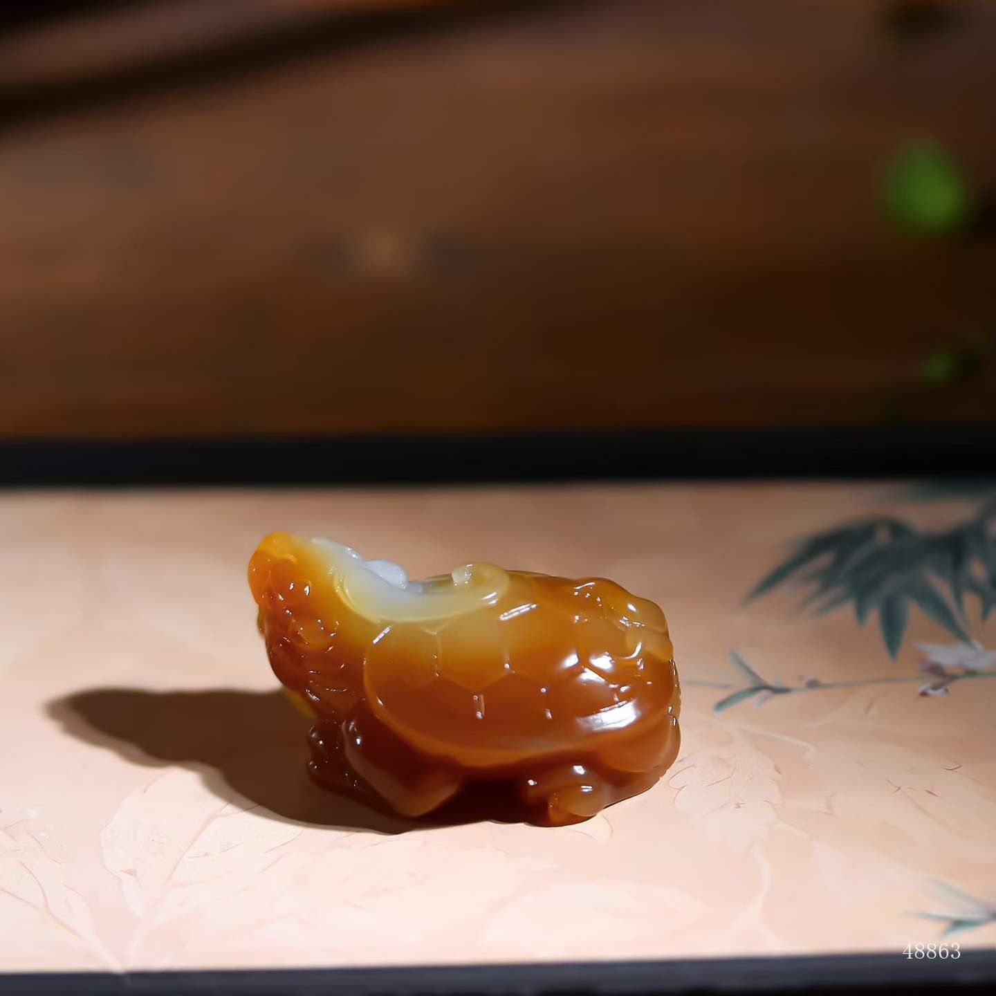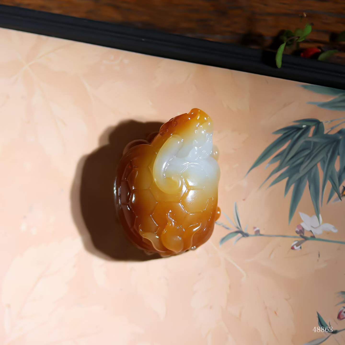 天然和田玉,且末金山糖白料,玉脂潤生光,糖色醇若蜜珀,糖白交融處似流霞漫卷。龍龜伏地蓄勢昂首拓海,龜首承糖色俏色,似煙霞暈染。
