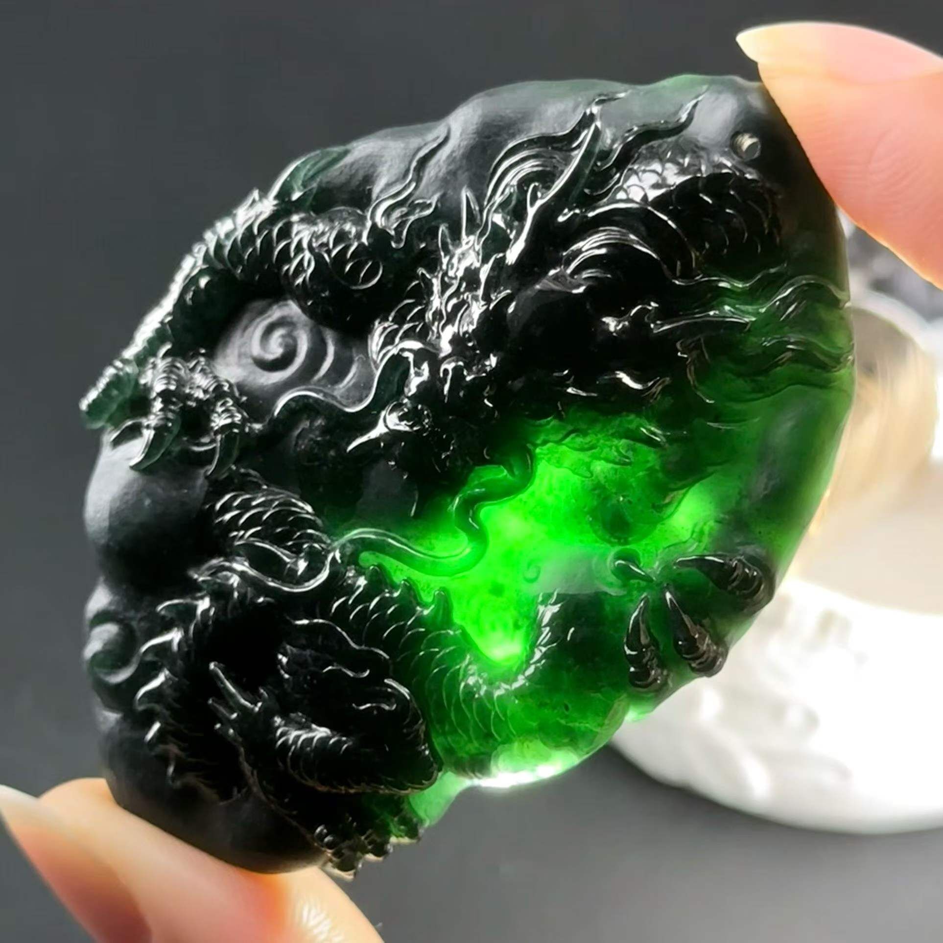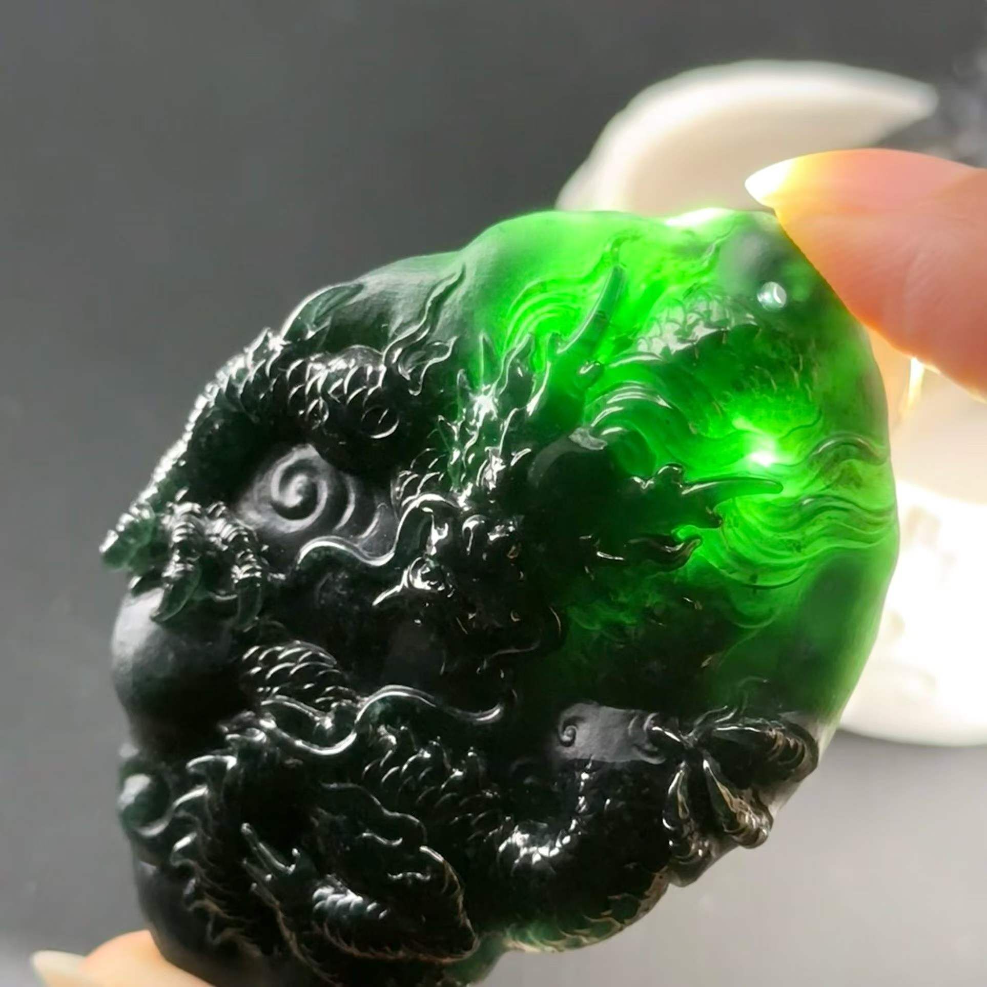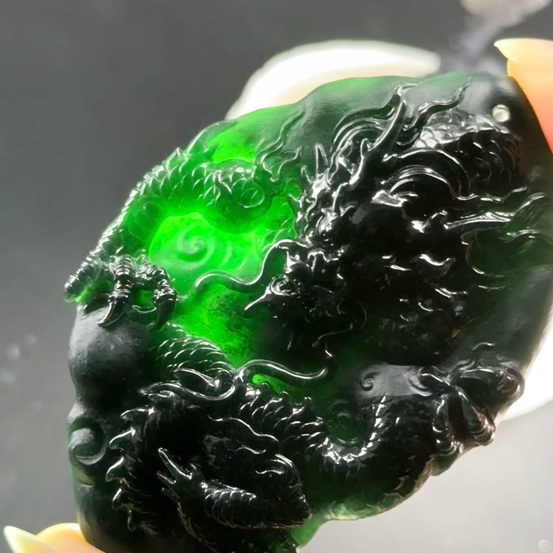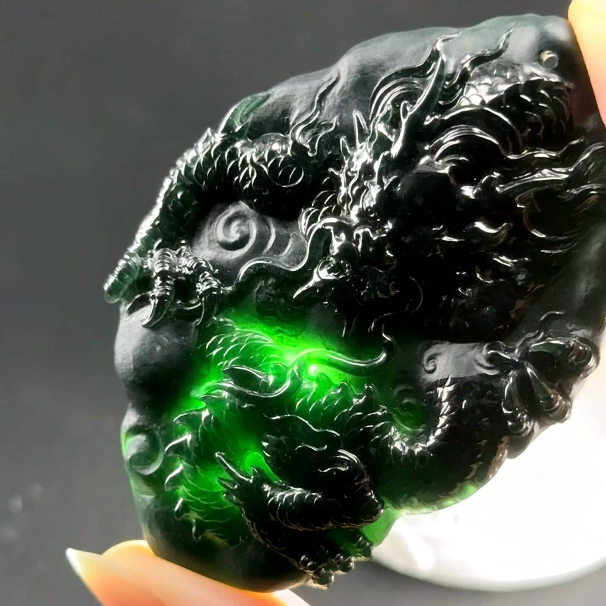 天然翡翠A玉,燈照透綠,雕工精美。
