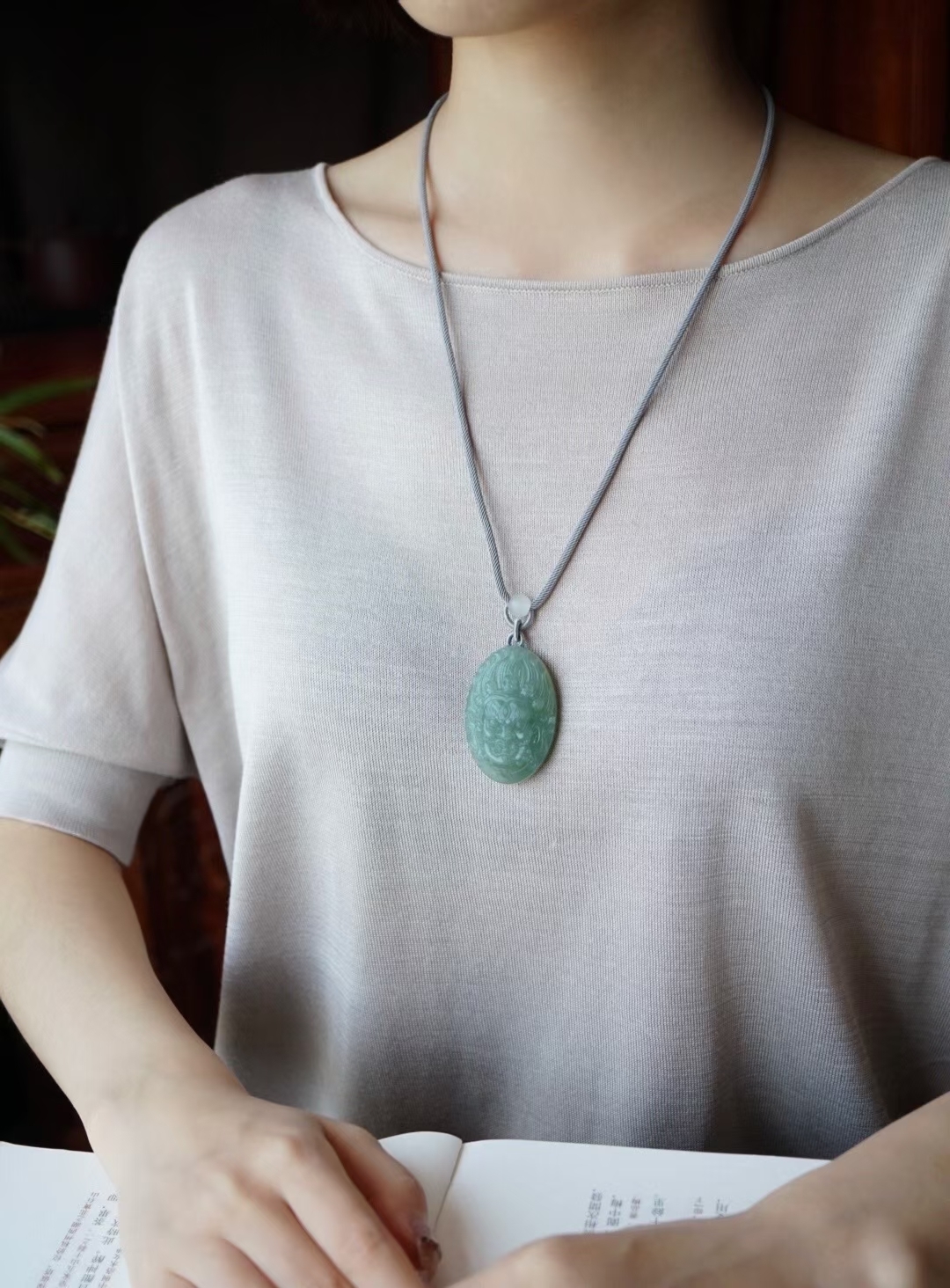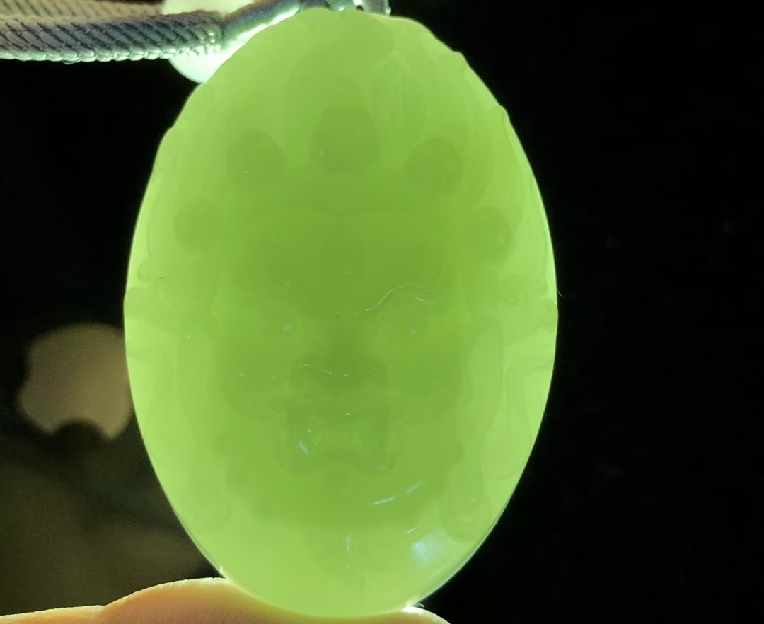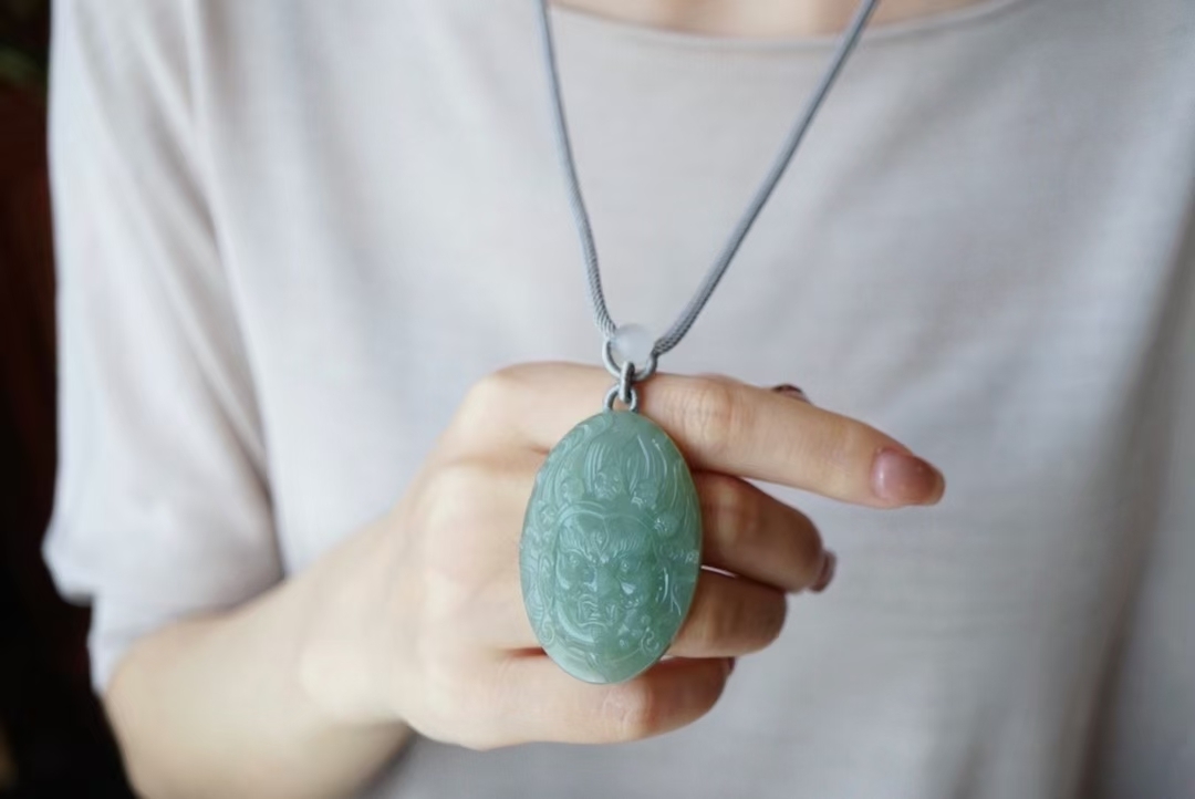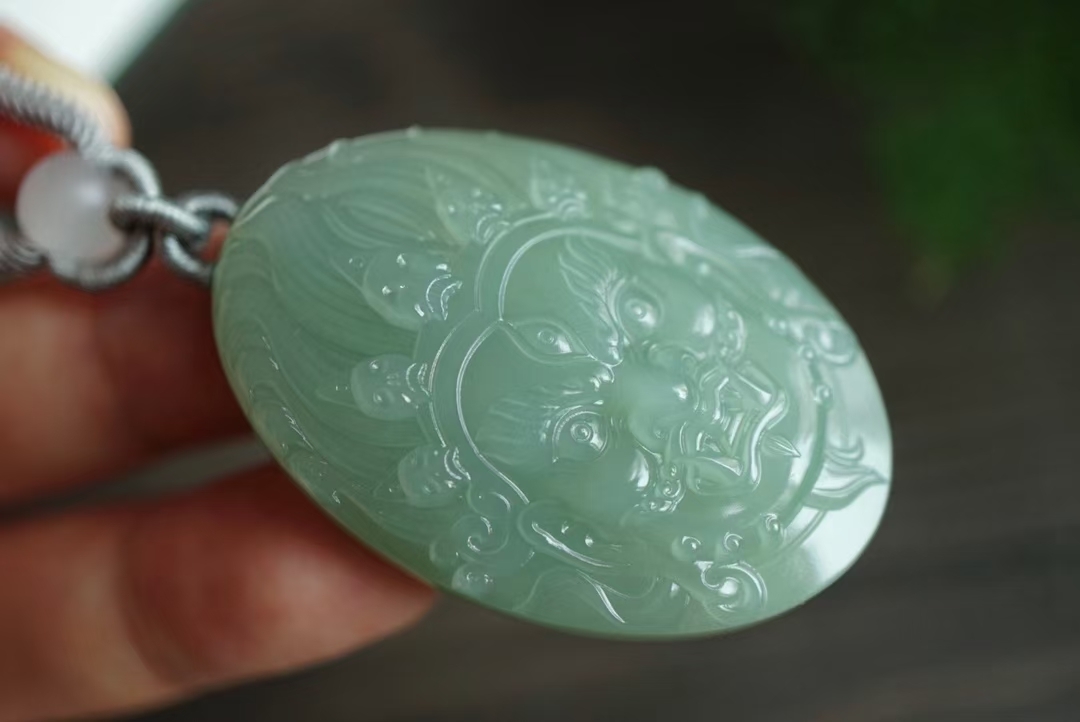 和田玉碧玉粉青,顏色清雅不發暗,老料高密度,玉質細膩脂粉足,過燈非常純淨,近乎無棉無水線,無雜無裂完美品相。蘇工純手工立體精雕大黑天守護神一尊,三目怒睜,赤發衝天,火熾濃眉,忿恨皺眉,捲舌露牙,頭戴五骷髏冠,代表“五智”,五官衣褶等纖微畢現,大黑天是藏傳佛教中眾護法之首,是健康之神與財富之神,可以護持修行者,能滿足佩戴者的財富以及健康平安的願望。
