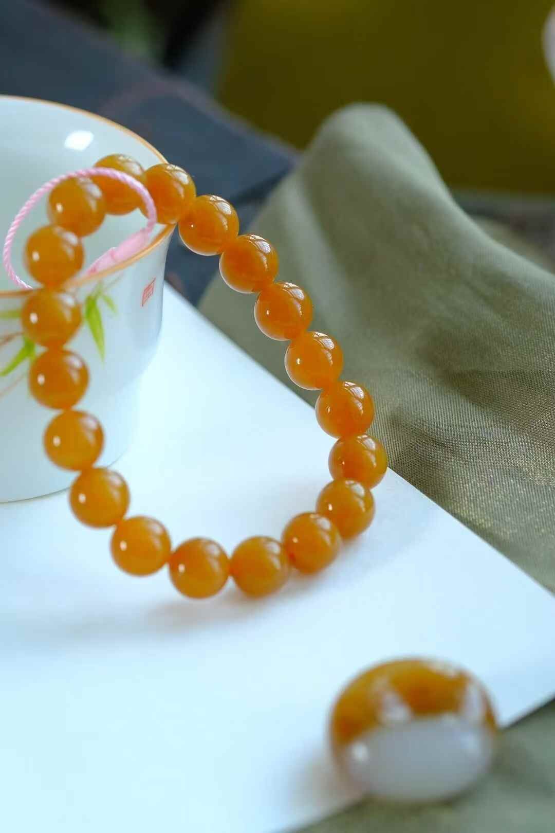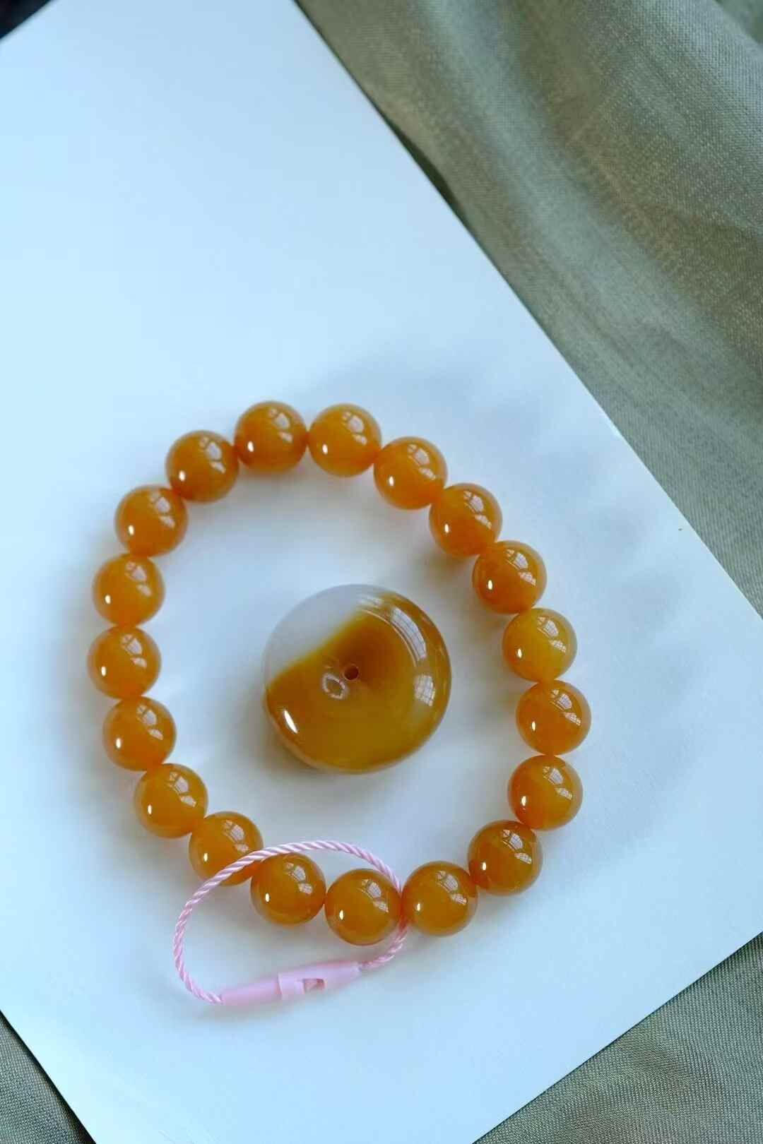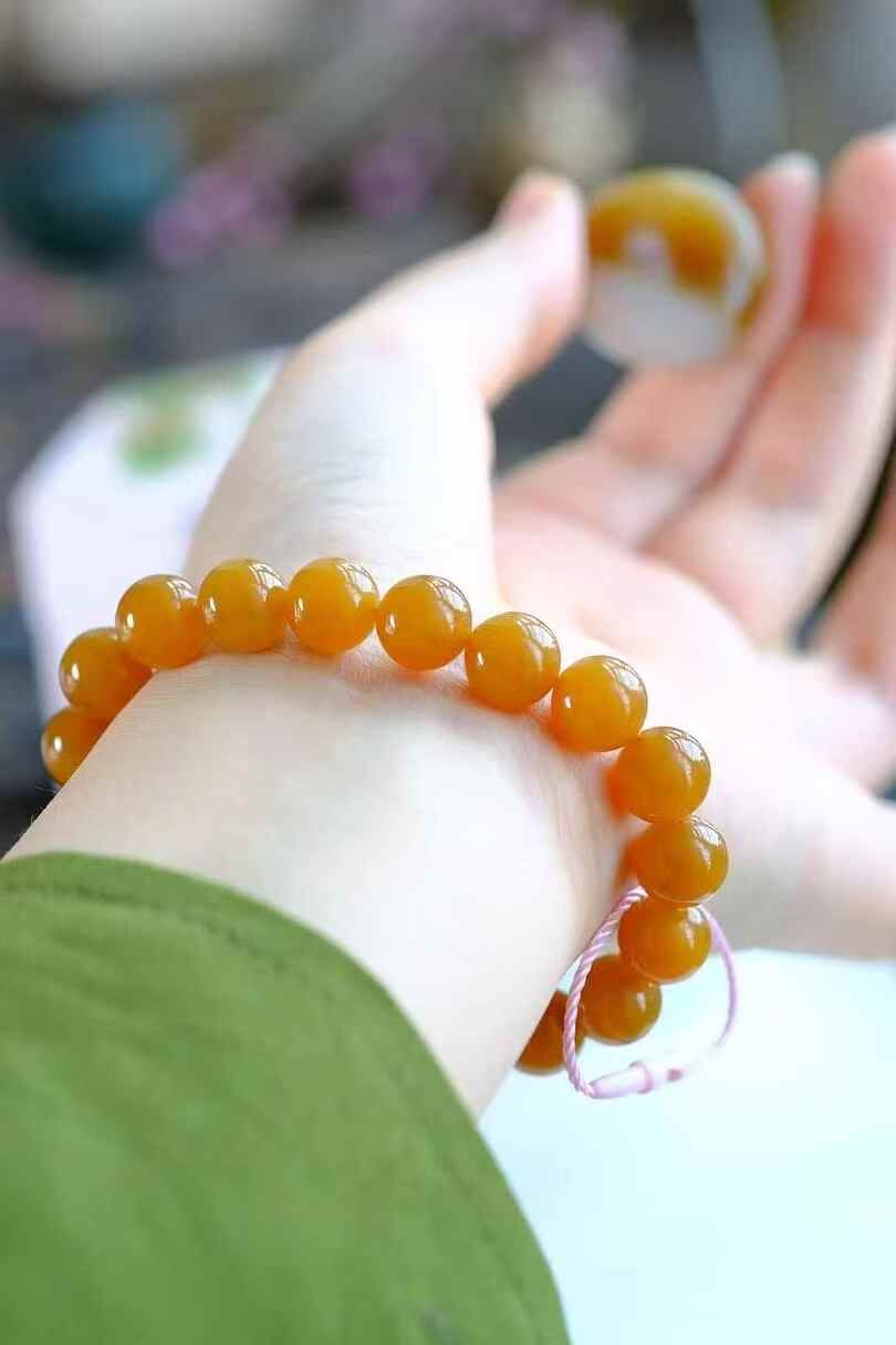 天然和田玉,且末蜜糖手鏈/聚寶盆平安扣,顏色鮮明,整體比較乾淨,料子細膩油潤,無裂紋完美品相。精致典雅,像蜜罐里撈出來的一樣油潤四溢。