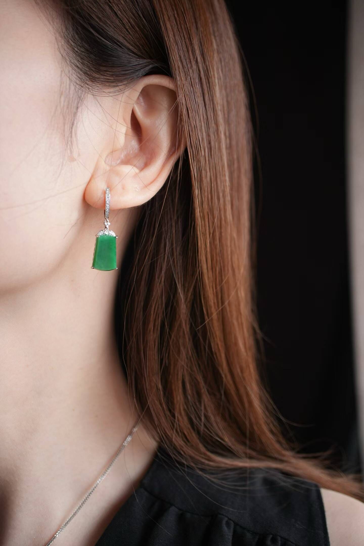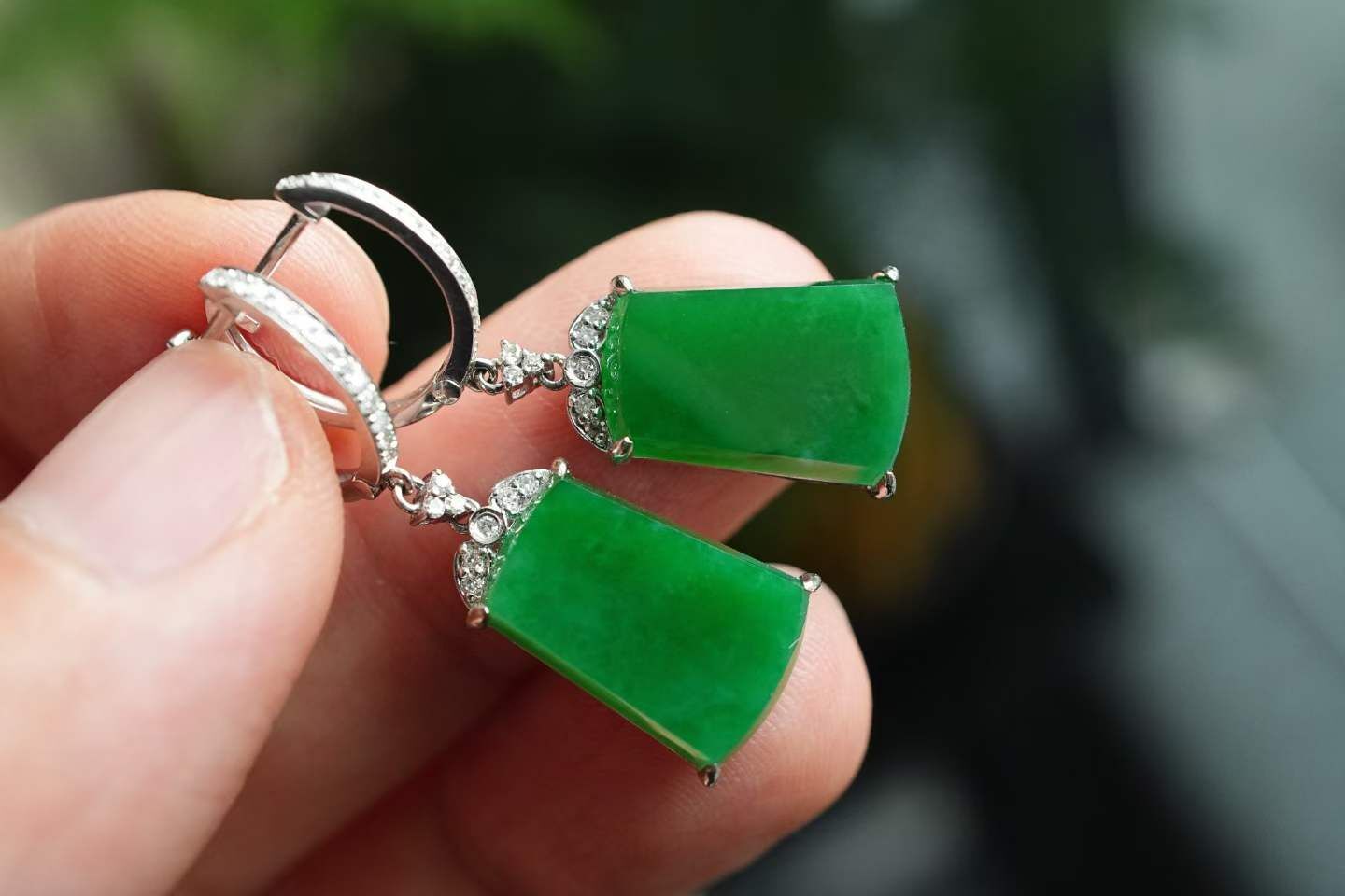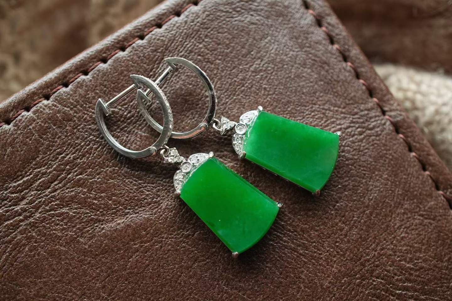 天然翡翠A玉,緬料,濃郁色,辣陽綠真的很大氣,通透乾淨細膩,形體厚實,18K金鑽鑲嵌,經典設計,典雅大氣。這對的品質好好,令人驚艷!