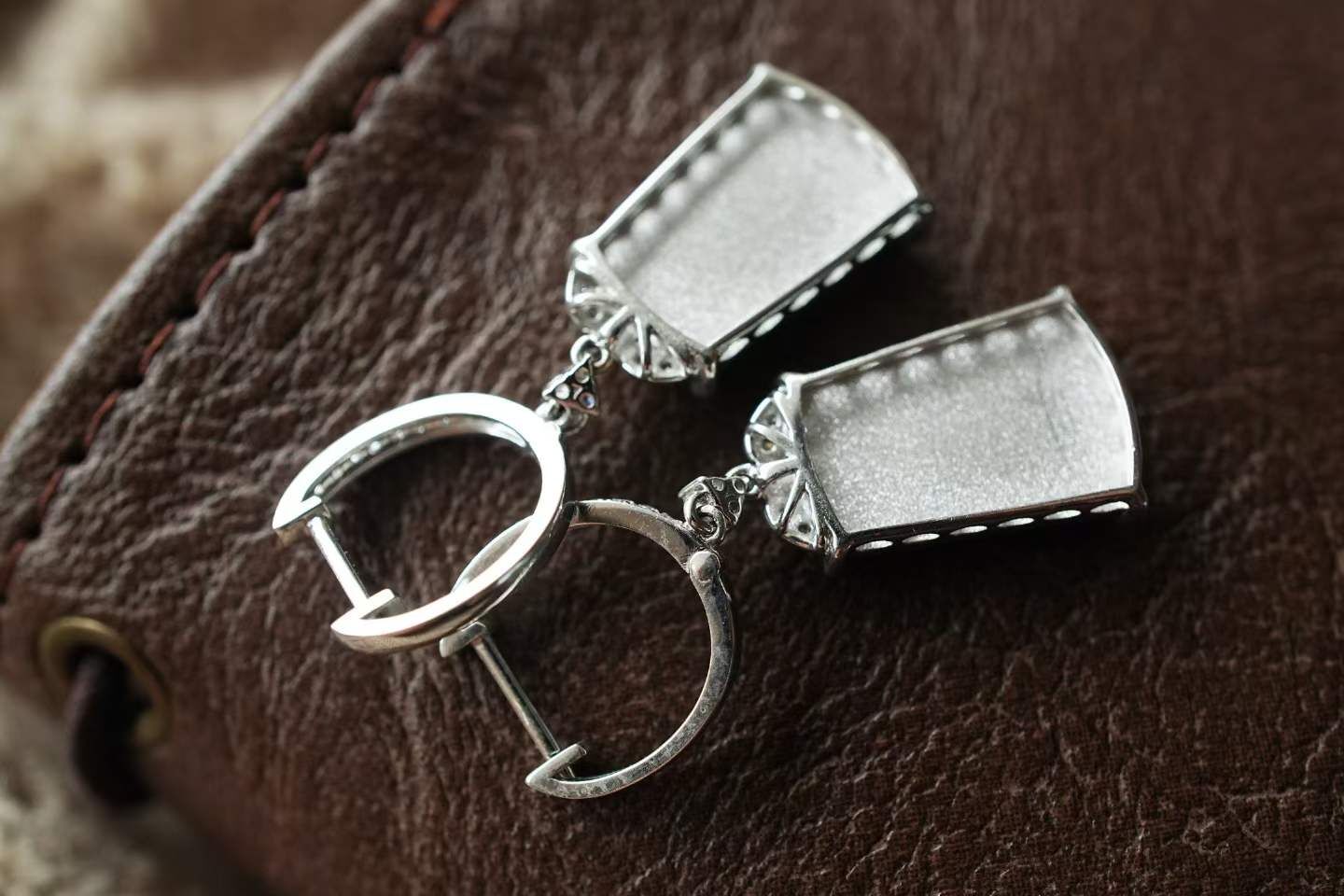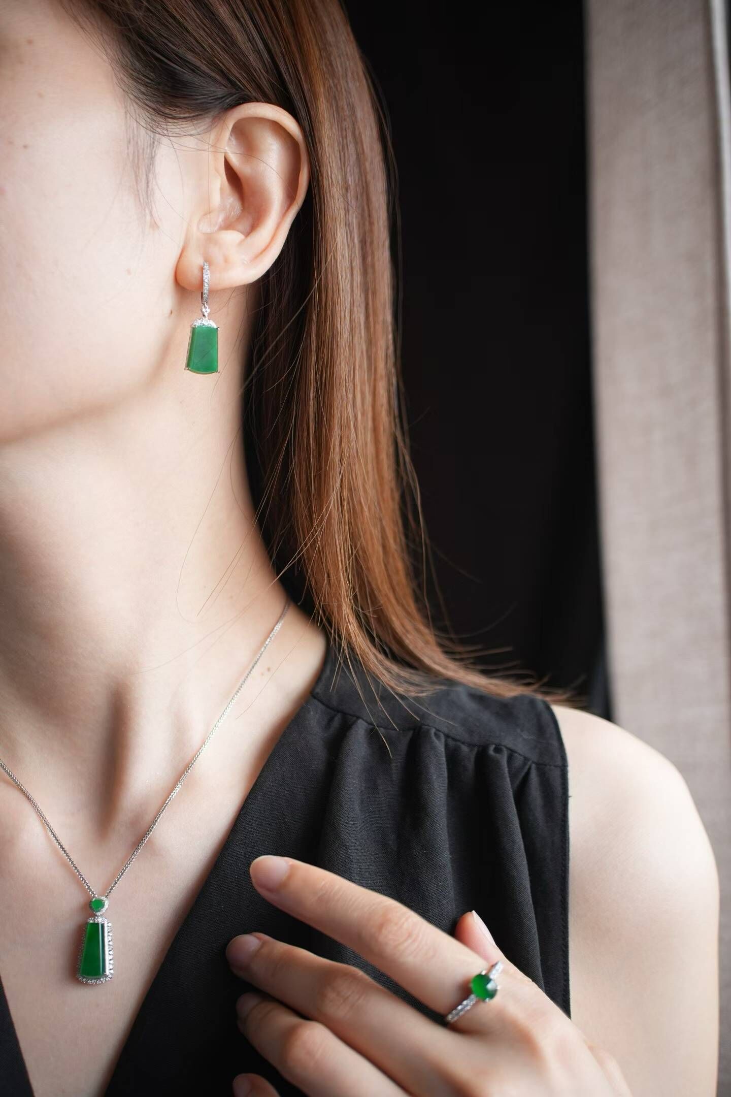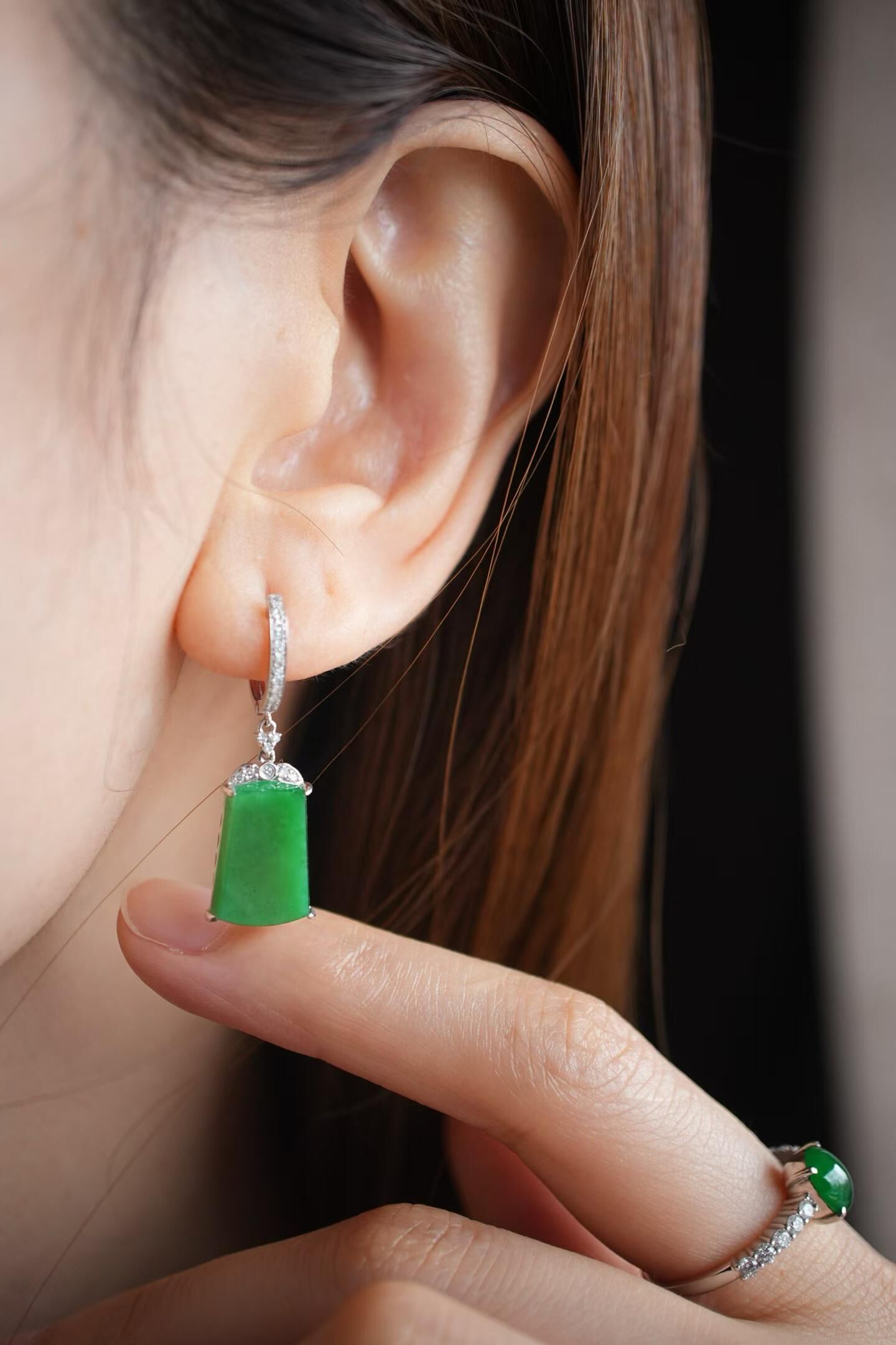 天然翡翠A玉,緬料,濃郁色,辣陽綠真的很大氣,通透乾淨細膩,形體厚實,18K金鑽鑲嵌,經典設計,典雅大氣。這對的品質好好,令人驚艷!
