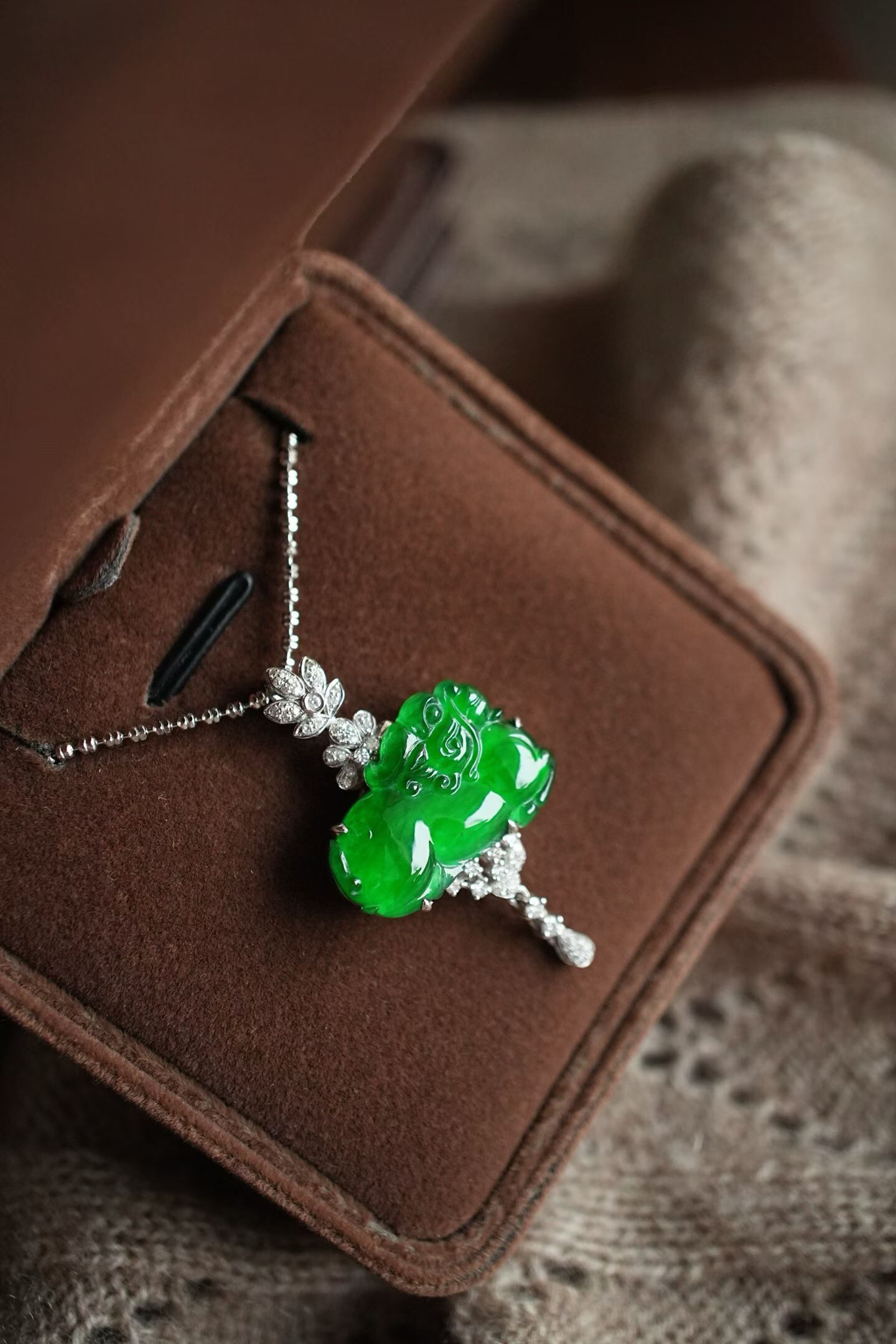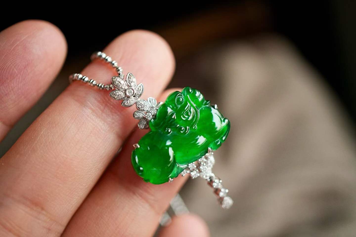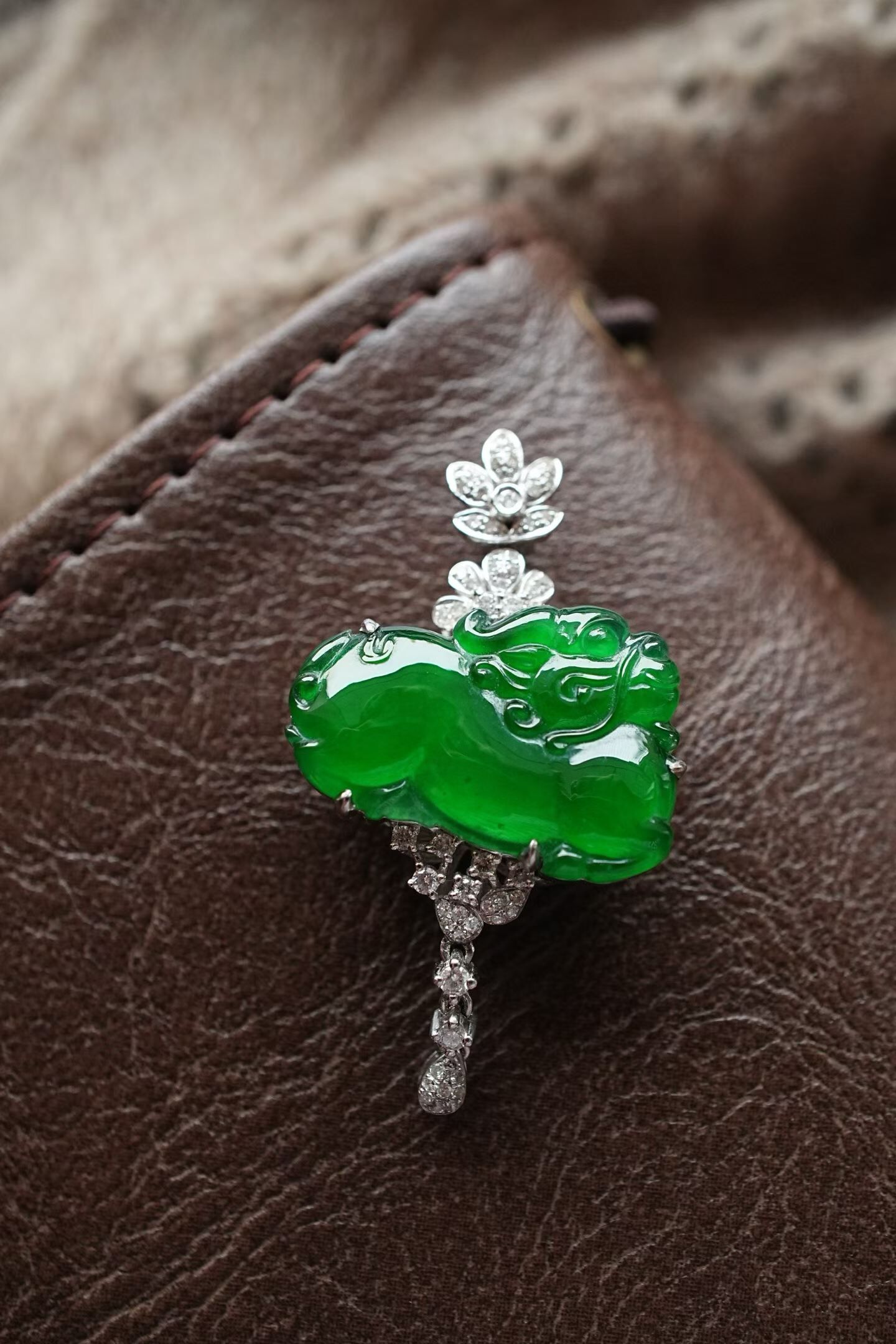 天然翡翠A玉,高冰種辣陽綠,種色俱佳,色濃郁辣陽,水潤冰透,整體呈現青翠欲滴的感覺,不愧是吸金招財,逢兇化吉的小神獸!