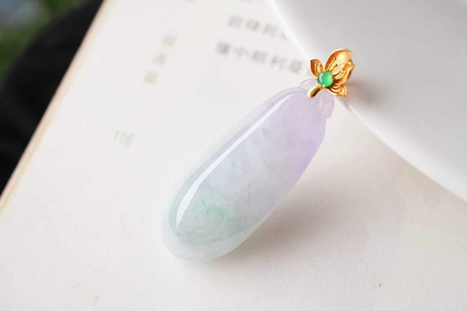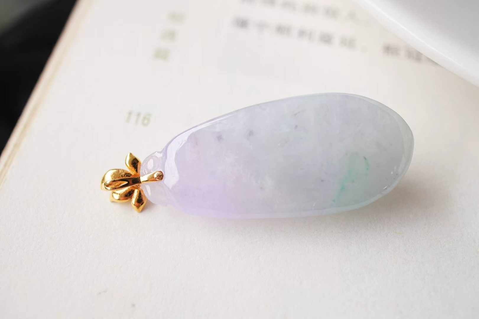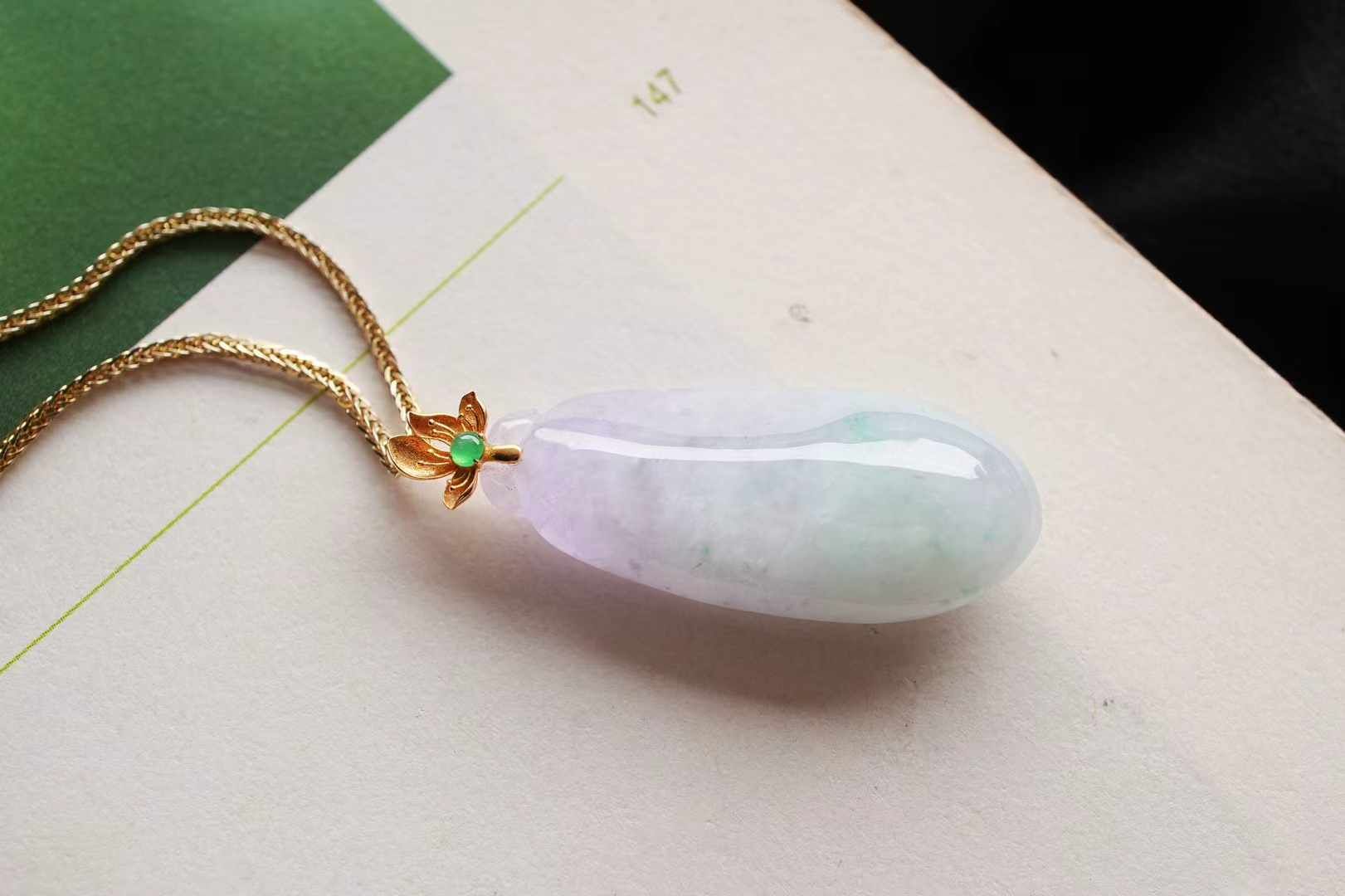 天然翡翠A玉,緬料,冰春帶彩福瓜,玉質冰潤,翡色明艷,紫羅蘭淡雅雙色交融,如詩如畫。