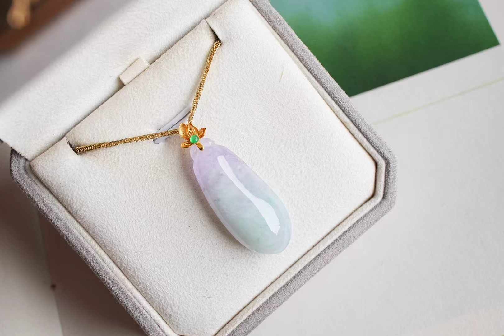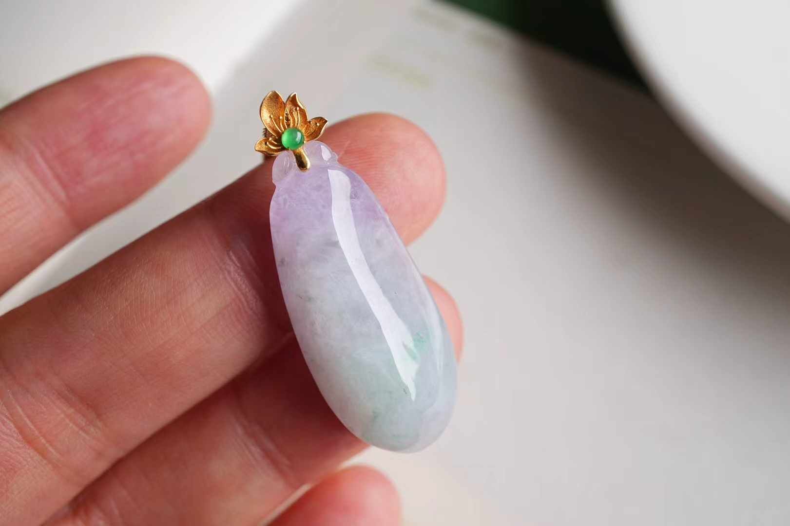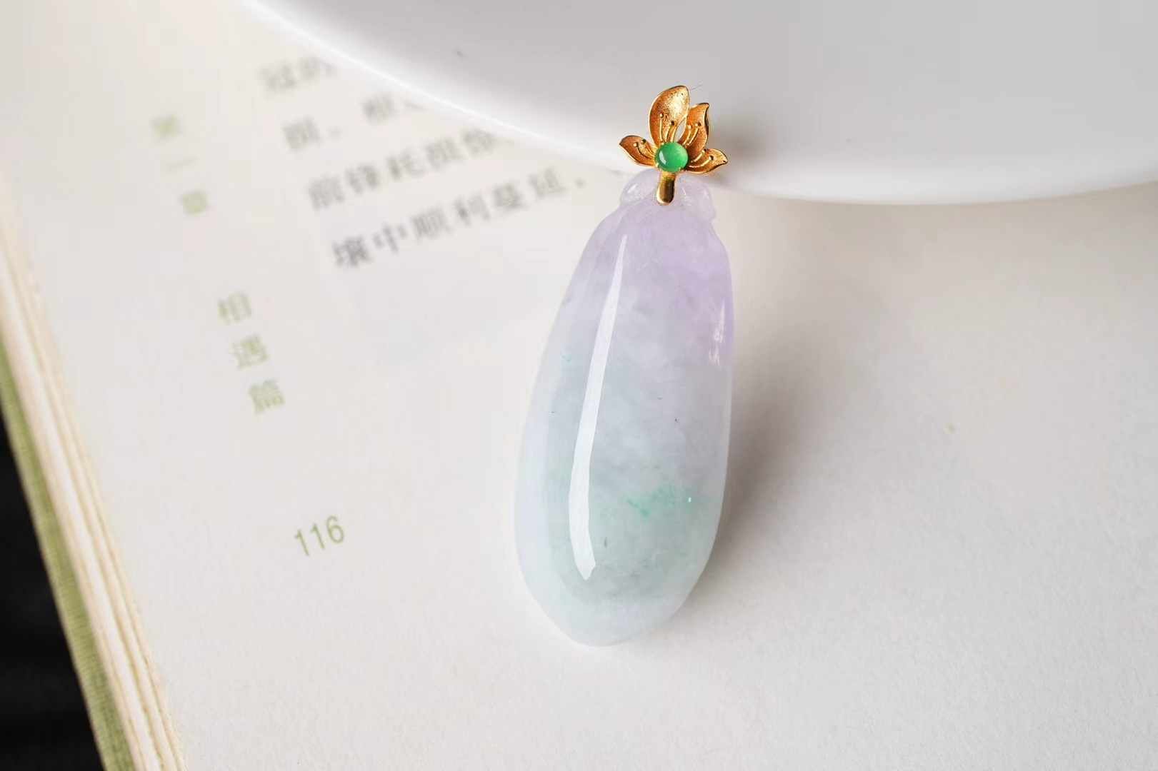 天然翡翠A玉,緬料,冰春帶彩福瓜,玉質冰潤,翡色明艷,紫羅蘭淡雅雙色交融,如詩如畫。