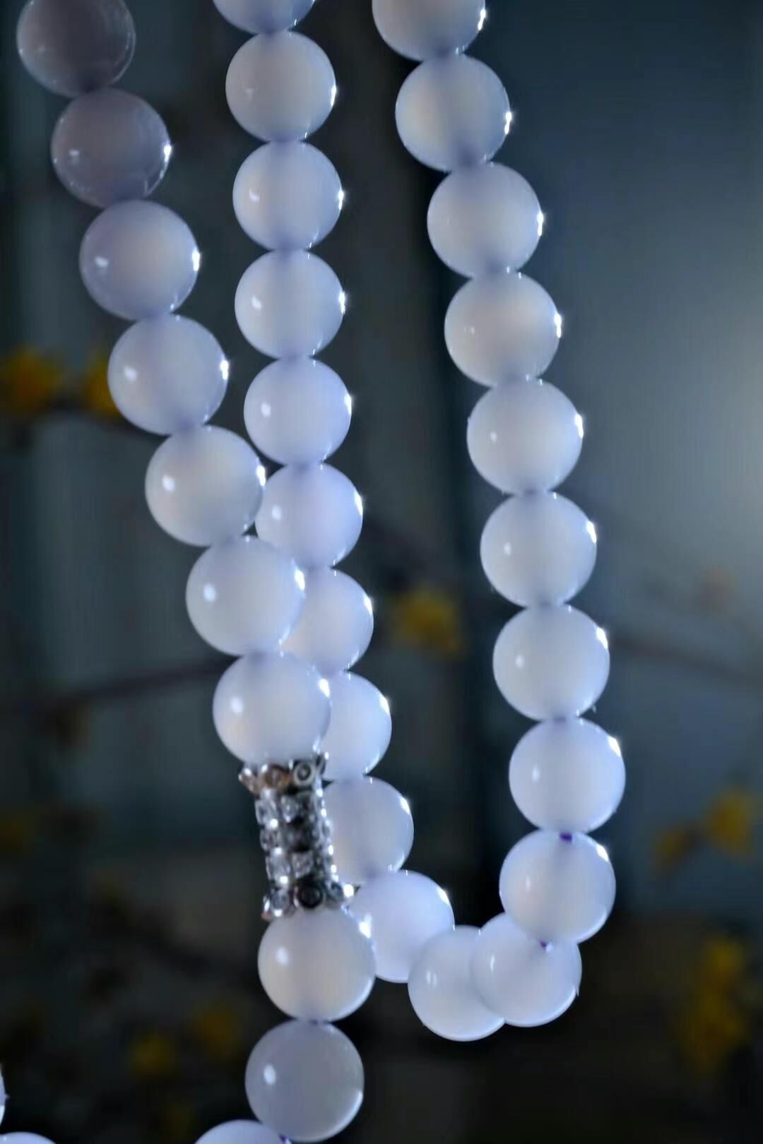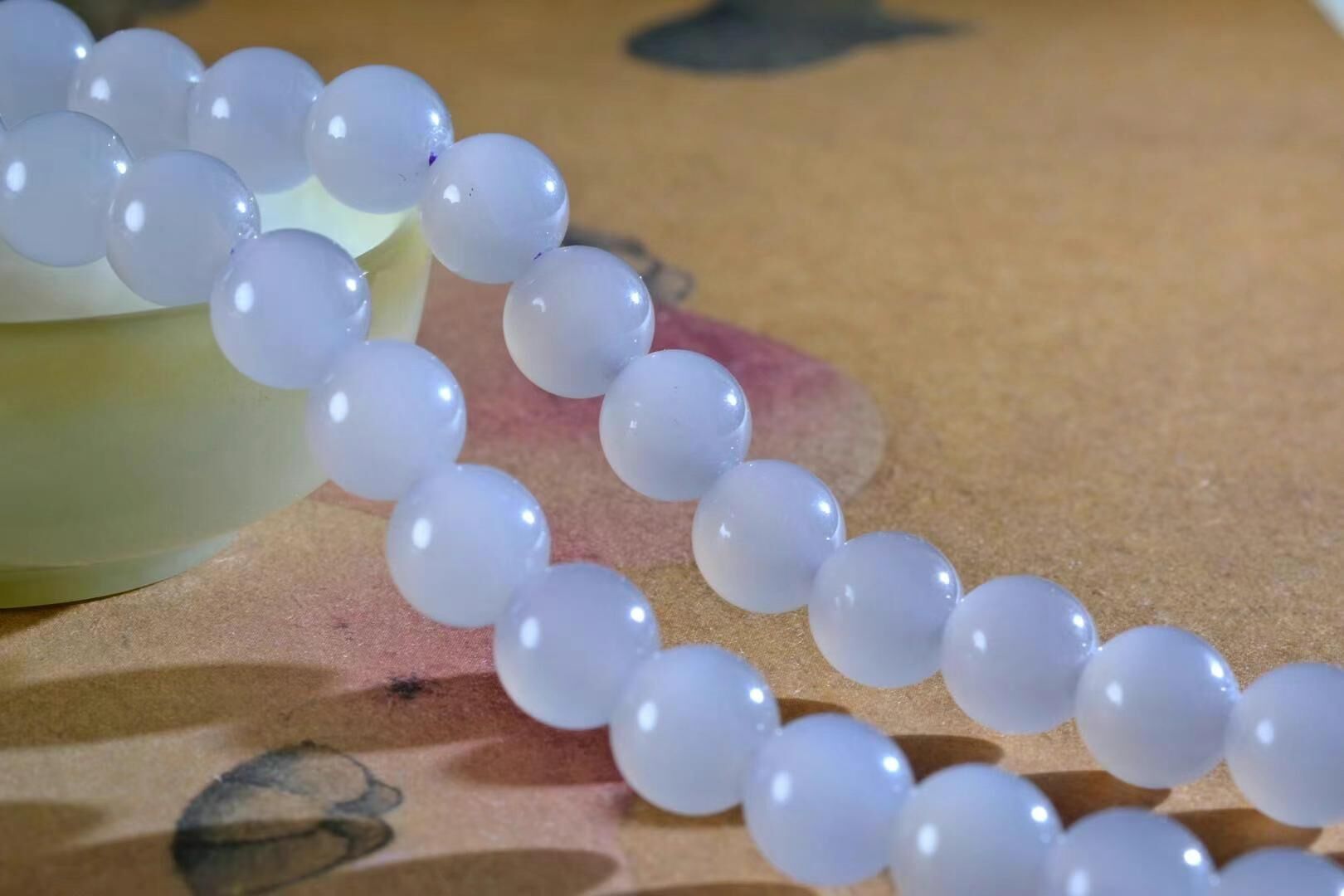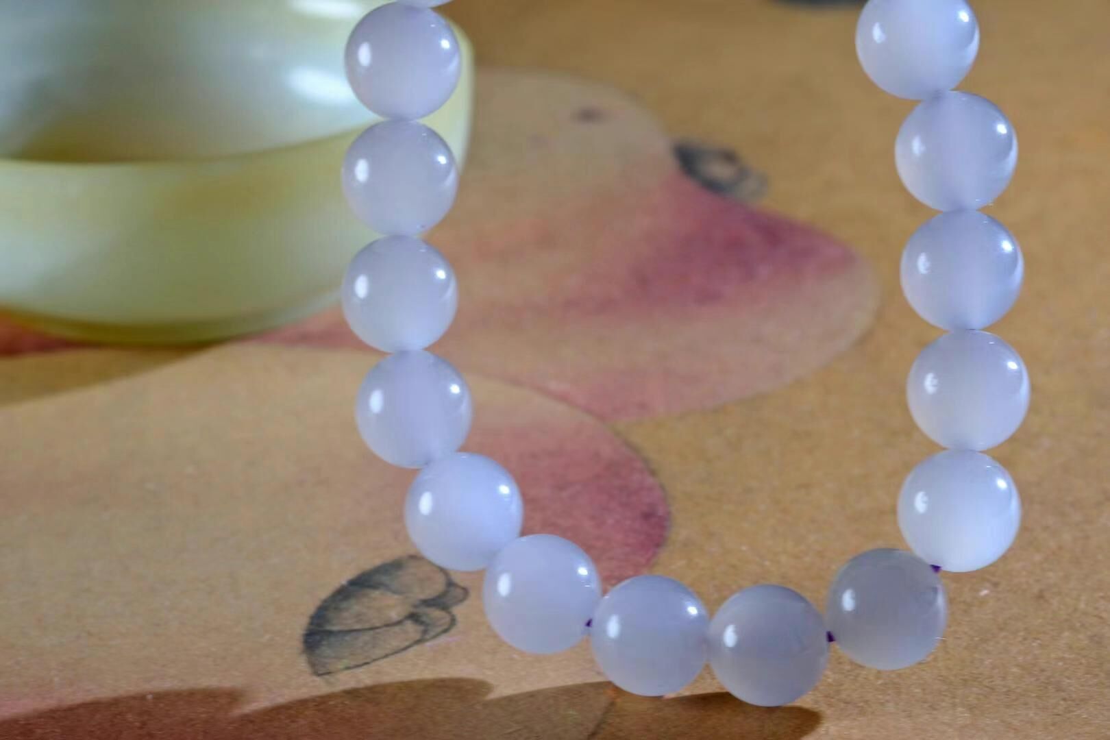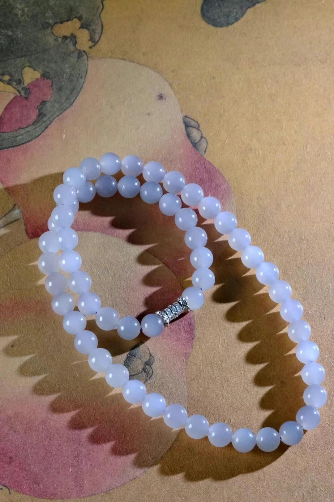 和田玉,煙光凝•暮山紫,珠徑 8mm 的冰底煙紫,顏色就像晨曦中的一抹神祕紫霧,溫柔又不失高貴,底子冰潤乾淨,每一顆珠子都散發著淡淡的溫潤光澤!