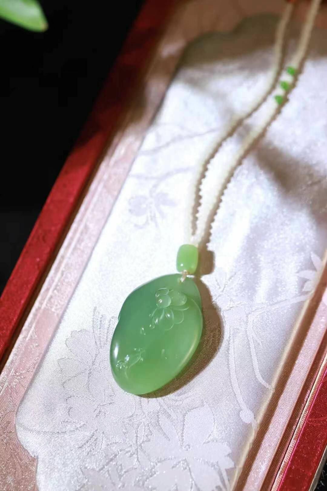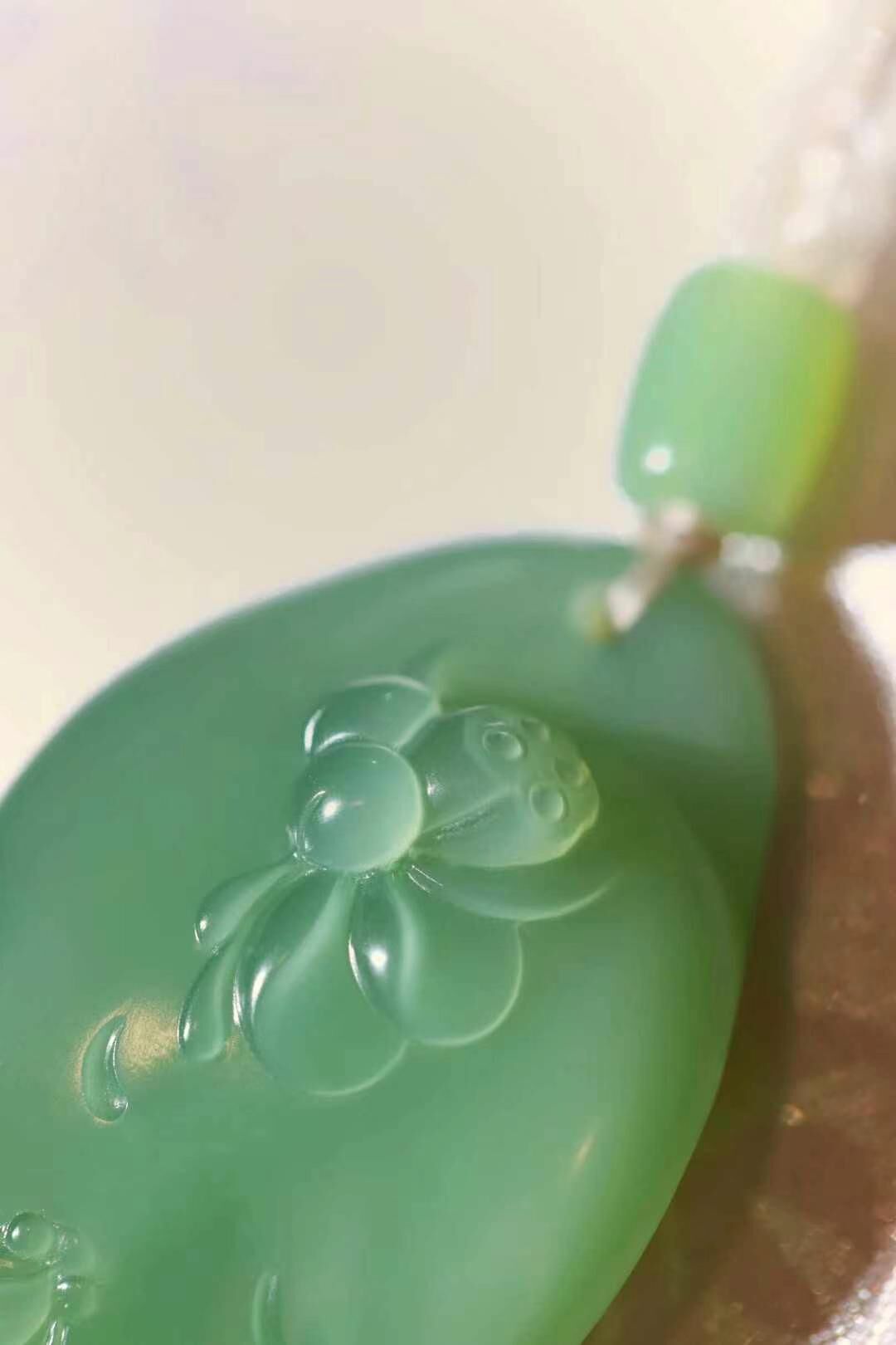 和田玉粉青貓眼料,天然隨形,宛如荷塘一隅。粉綠雙色雕琢,荷花半綻,小魚嬉遊,貓眼流光輕轉,彷彿碧波微漾,靈氣暗生,不規則的溫潤,藏著不經意的美, 佩戴間,獨一份的東方雅意。
