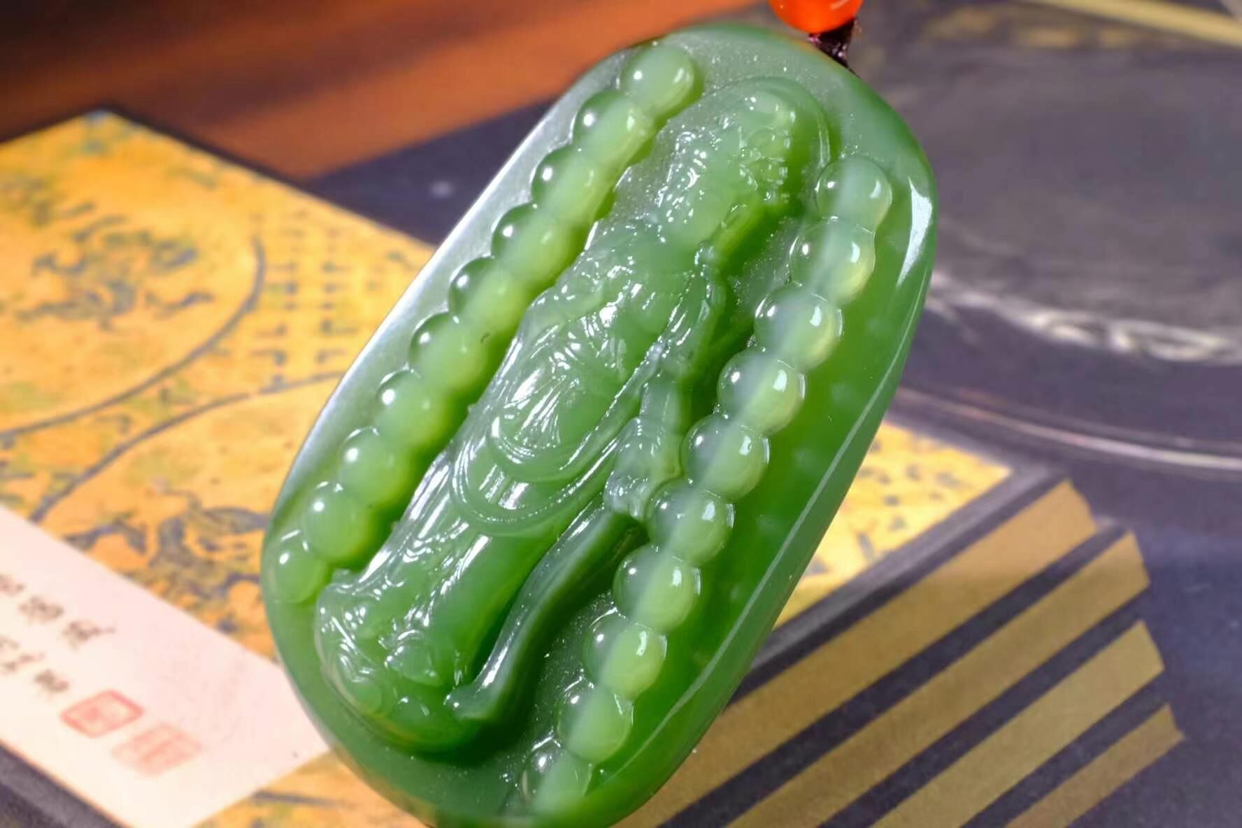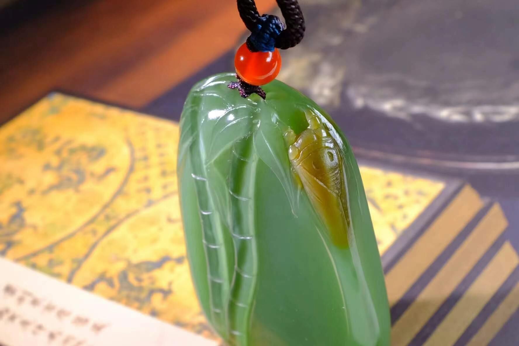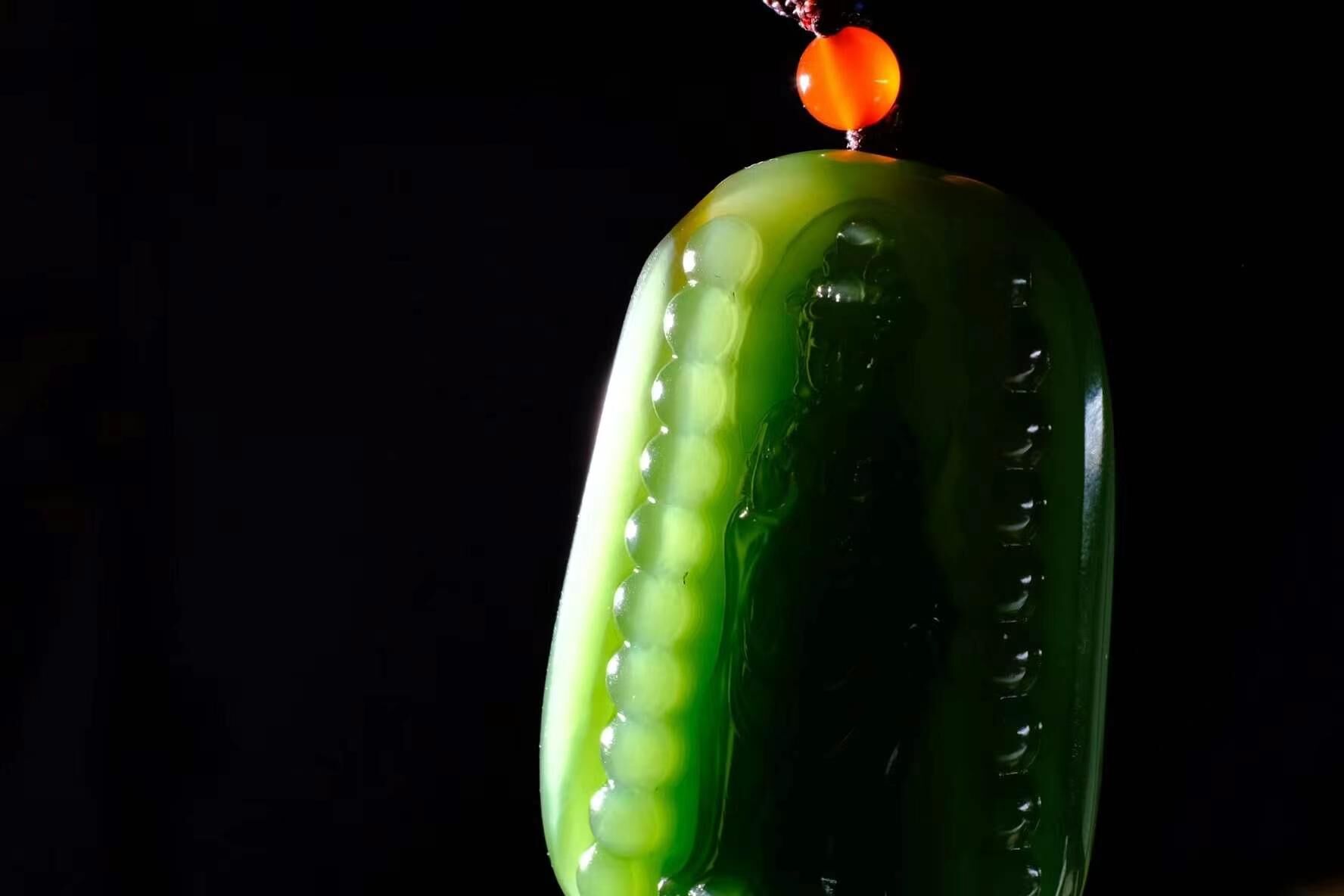 和田玉碧玉陽綠細料貓眼觀音掛件,巧雕佛珠竹節,原皮設計鳴蟬。
