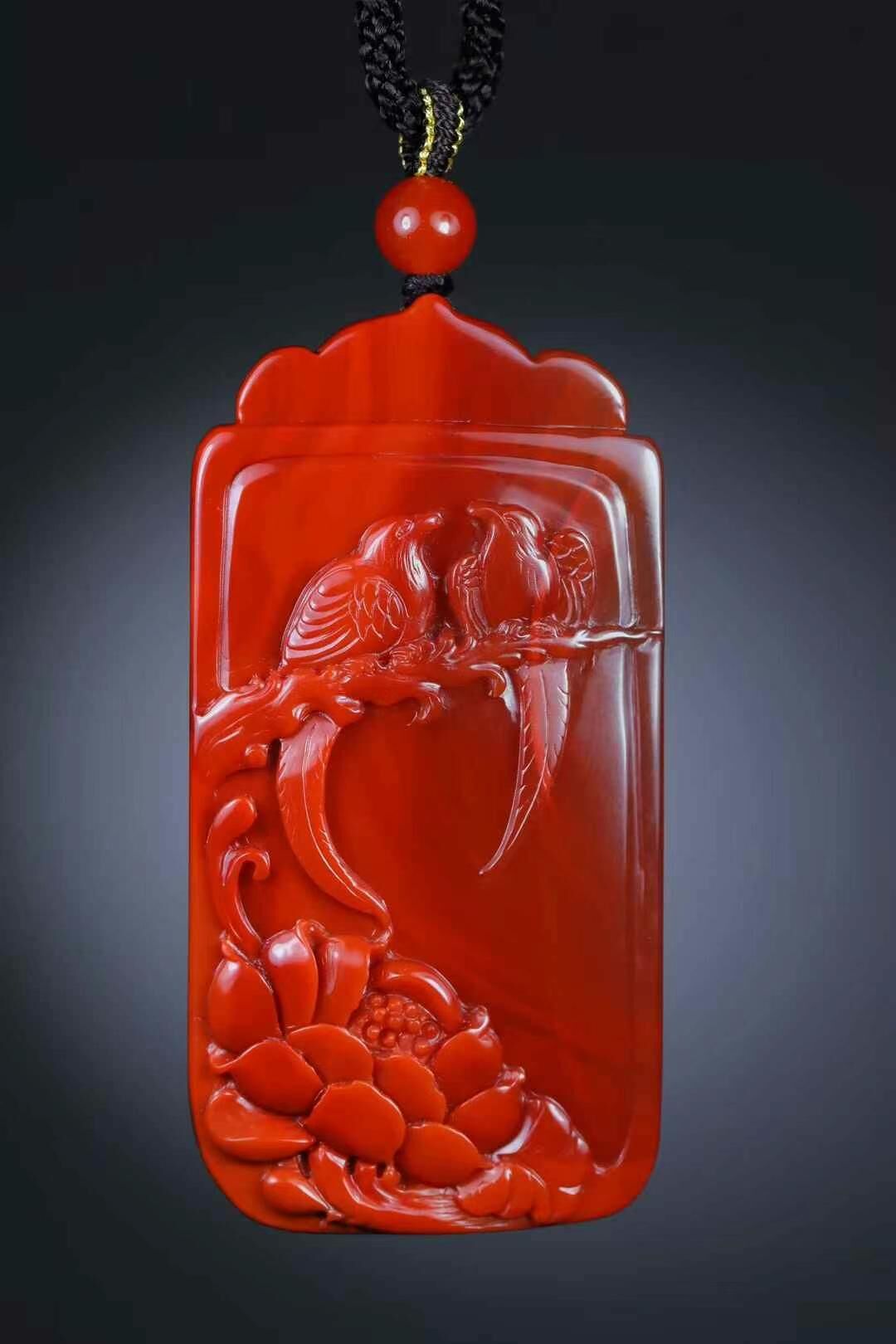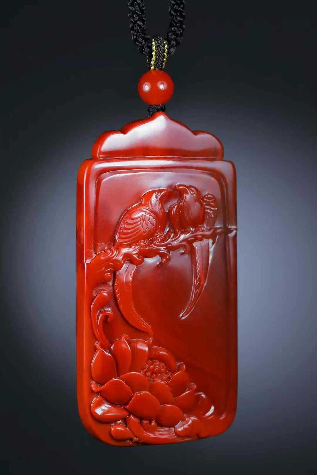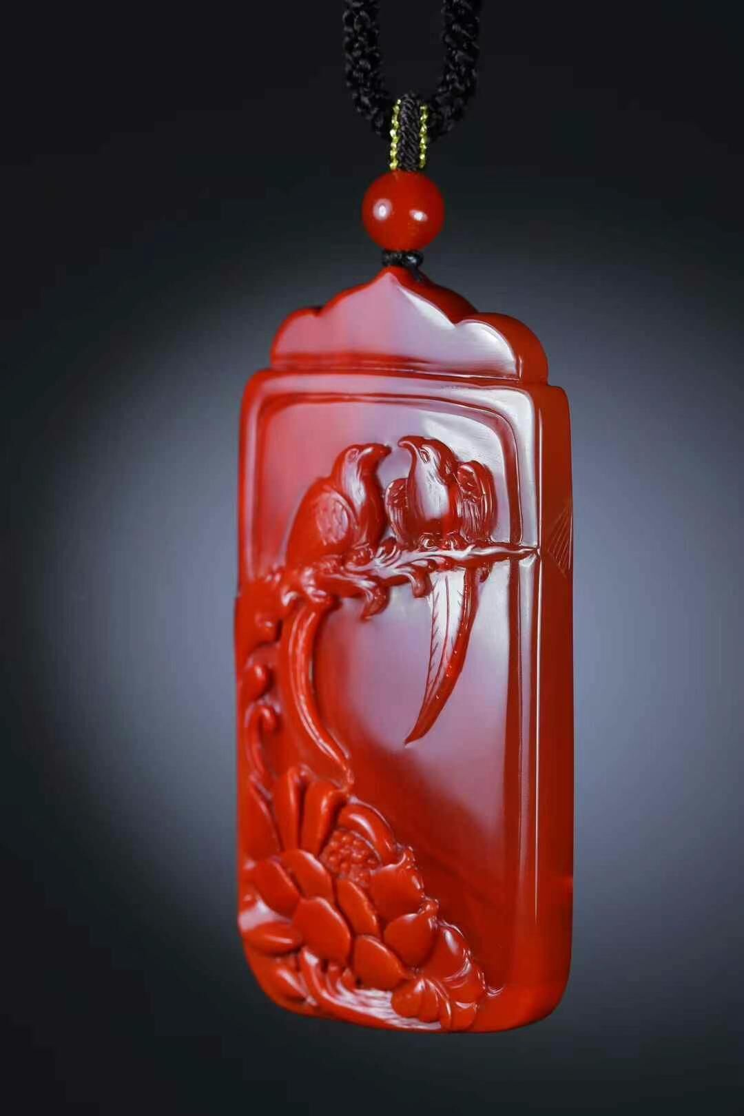 天然南紅瑪瑙,喜人的南紅花鳥掛件,優質瓦西玉化老料,滿色滿肉柿子紅玫瑰紅,顏色紅潤,玉質潤糯細膩,精雕細琢,雕工精美,雕刻牡丹花形飽滿立體,喜鵲身姿優美,線條流暢,自然柔美。