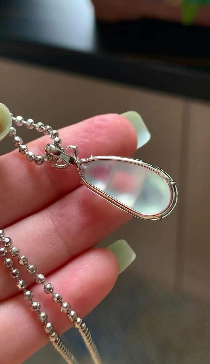 天然翡翠A玉,冰潤水透,種老細膩起熒,18K金鑲嵌。