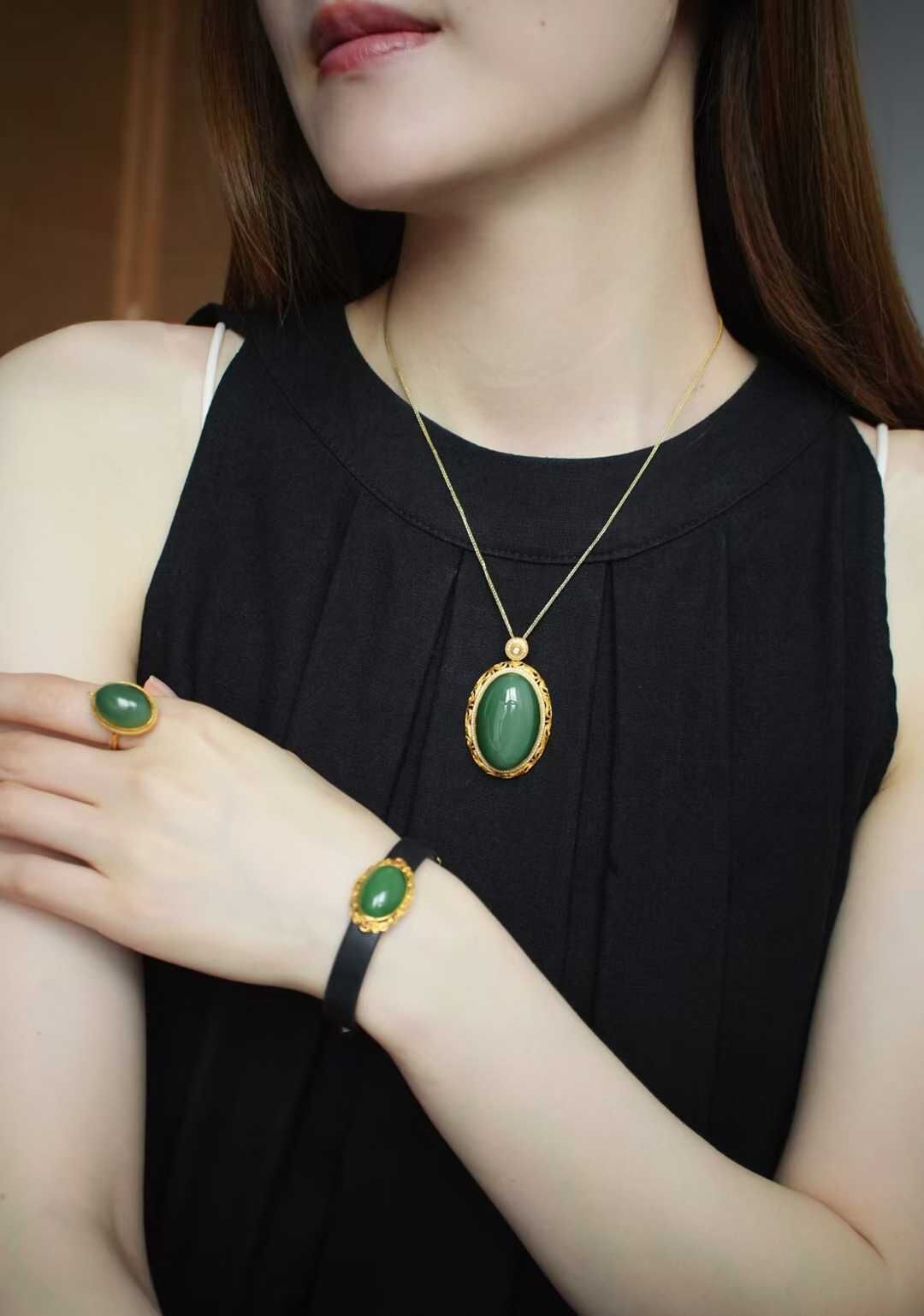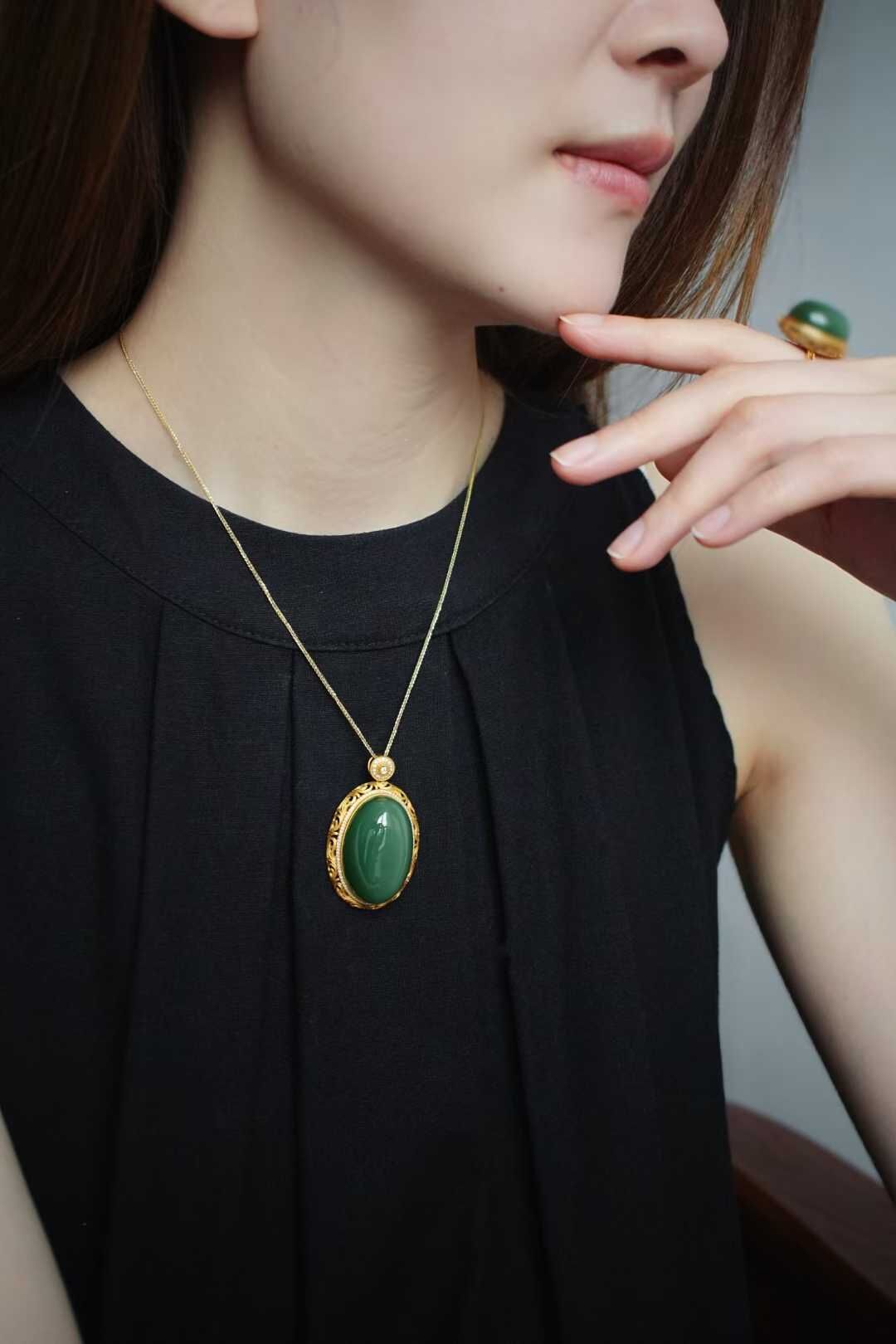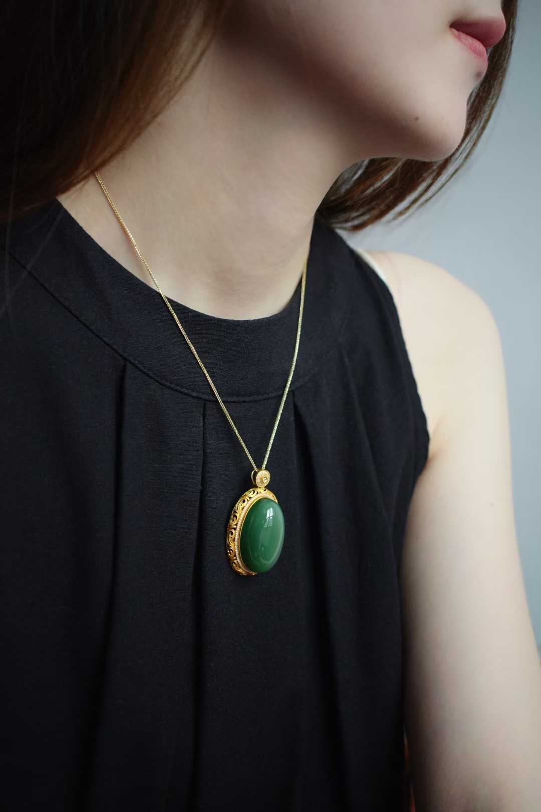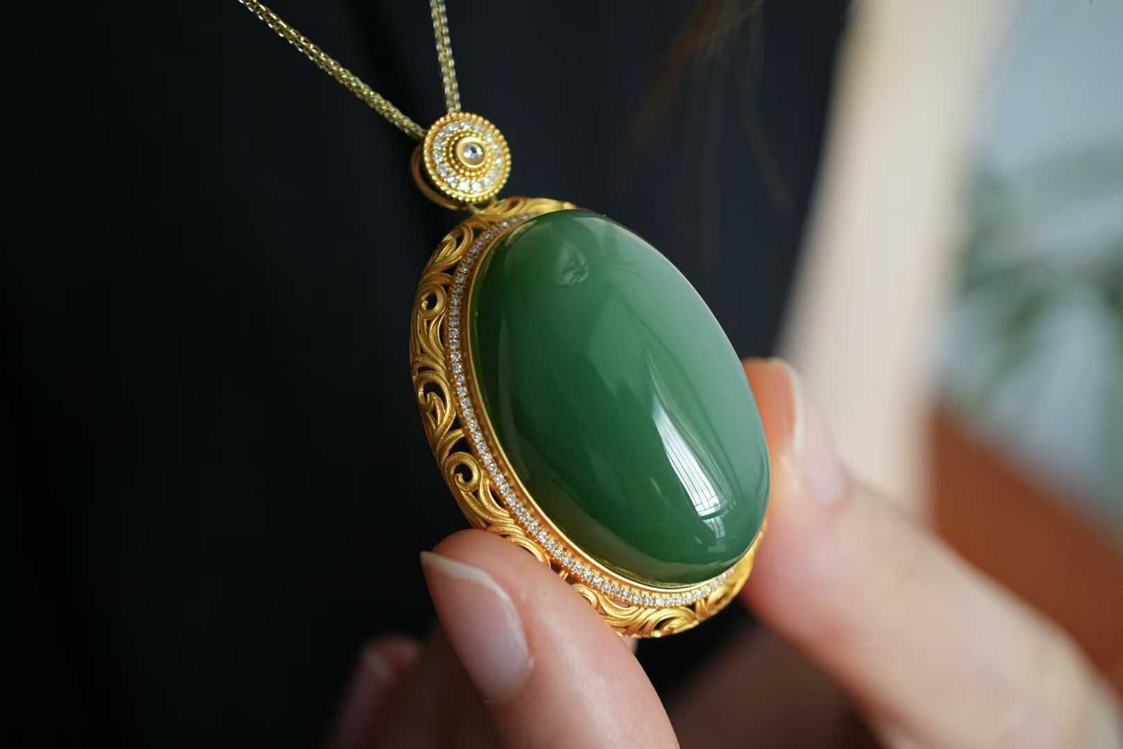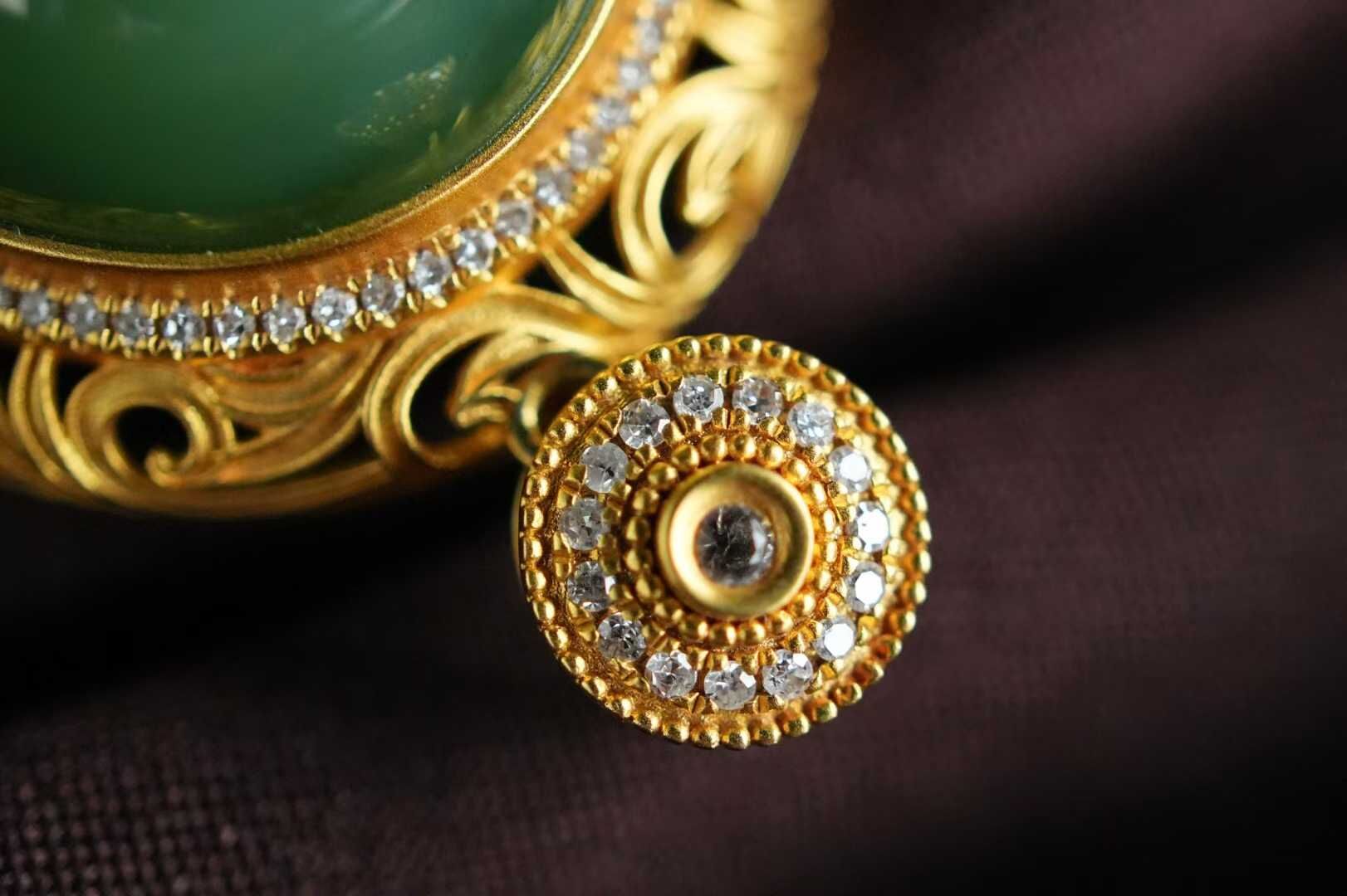 收藏級,和田玉碧玉綠底粉青,極為飽滿的一枚大蛋面,顏色清雅不失貴氣,整體均勻內斂,高密度一級細料,油性足剛性好!帶獨特貓眼效應,溫潤的質感,低調的奢華,過燈純淨近乎無結構,無棉無水線,無雜裂高品質!無論裸石品質還是鑲嵌工藝都屬上乘。
