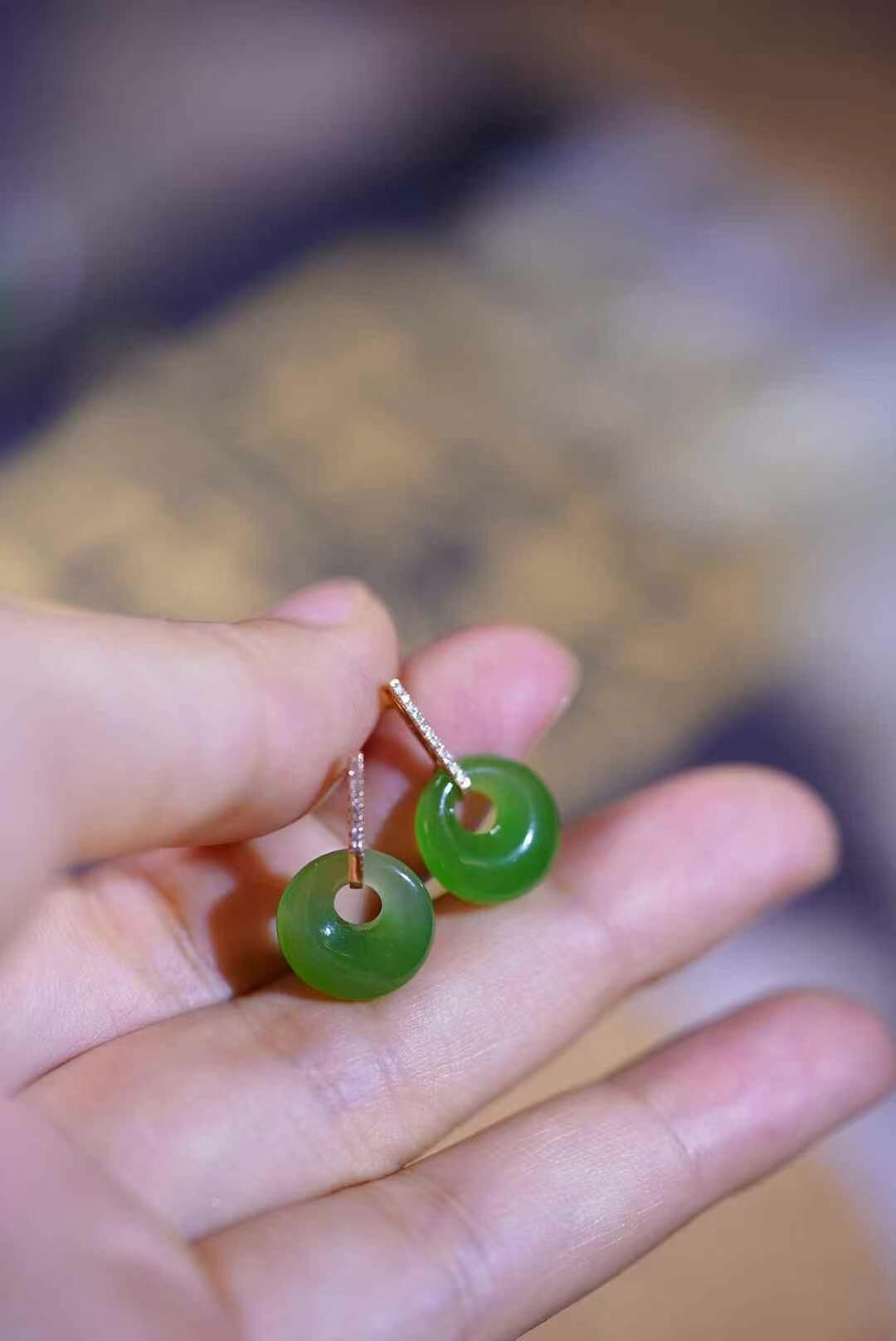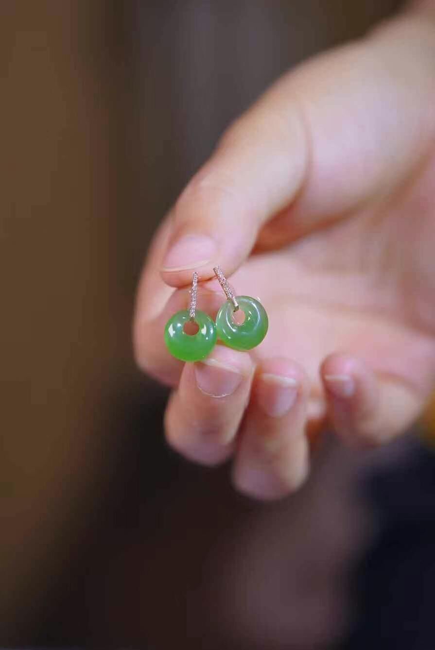 和田玉碧玉,玉質細膩冰潤,色澤均勻艷麗,精緻的款式,新穎別致,佩帶精緻百搭,18K金鑲嵌。