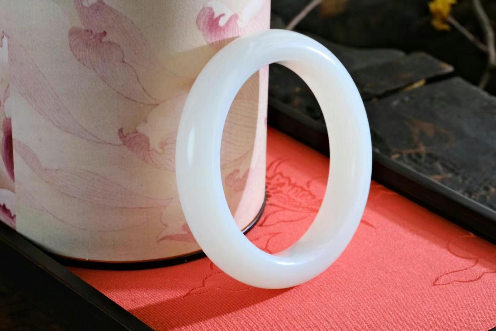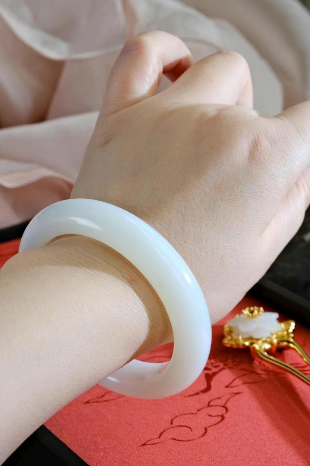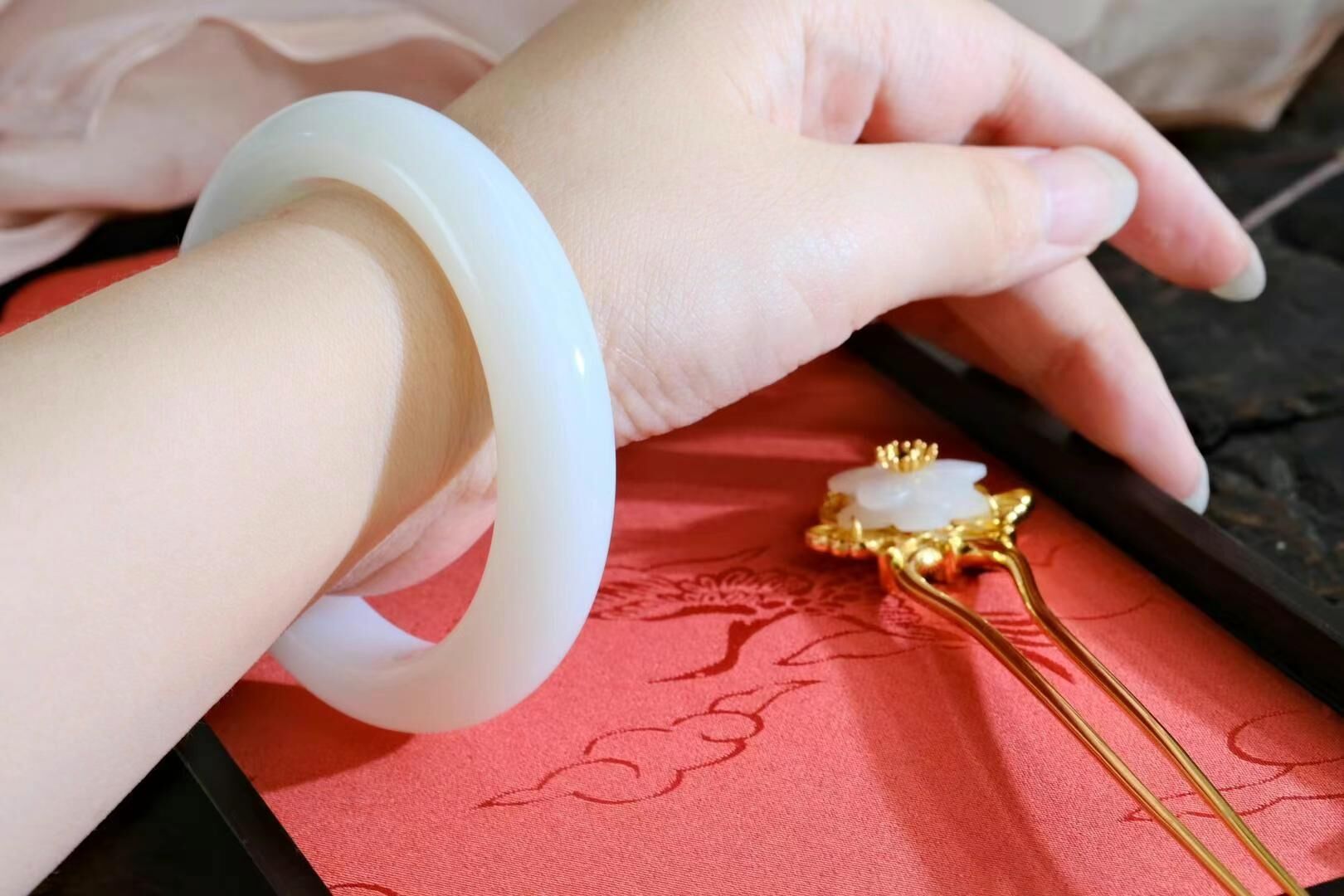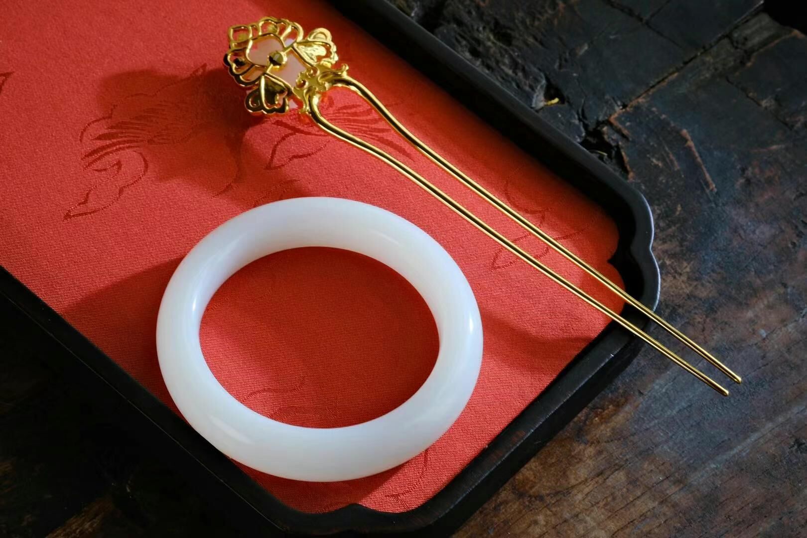• 56.6mm和田玉羊脂白玉手鐲+發釵,天然和田玉軟玉