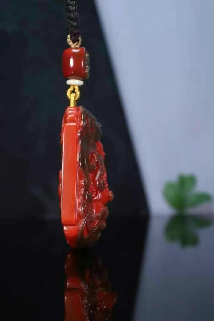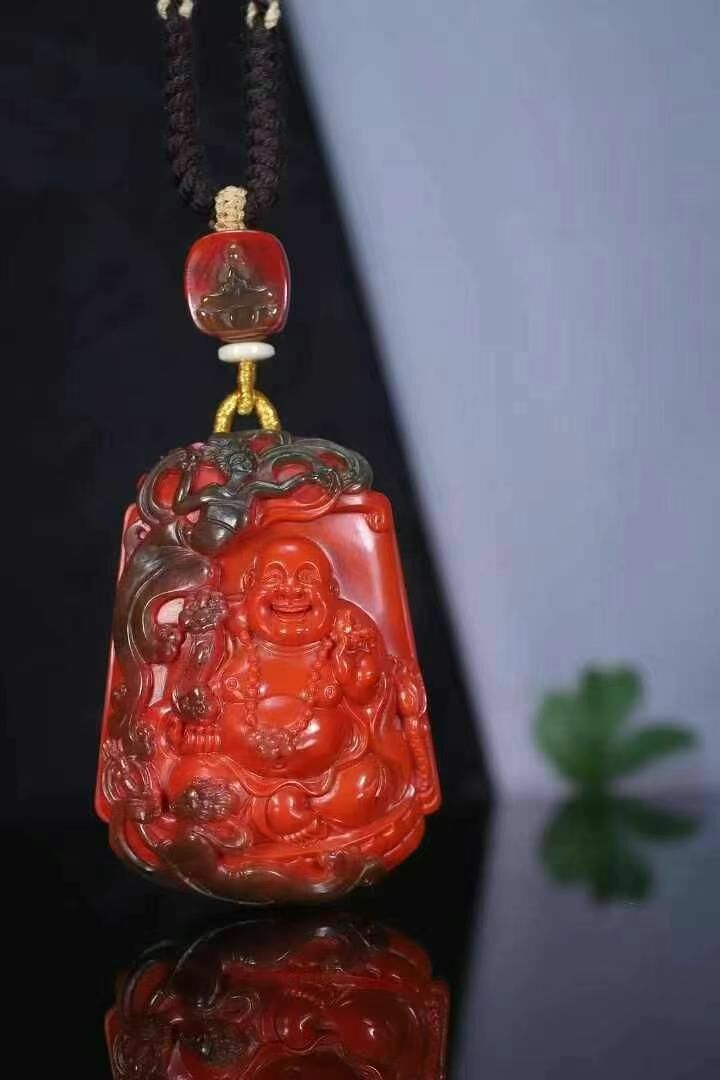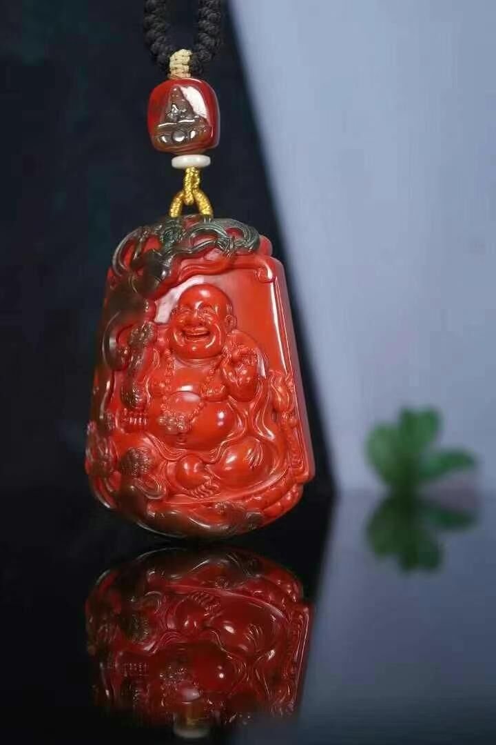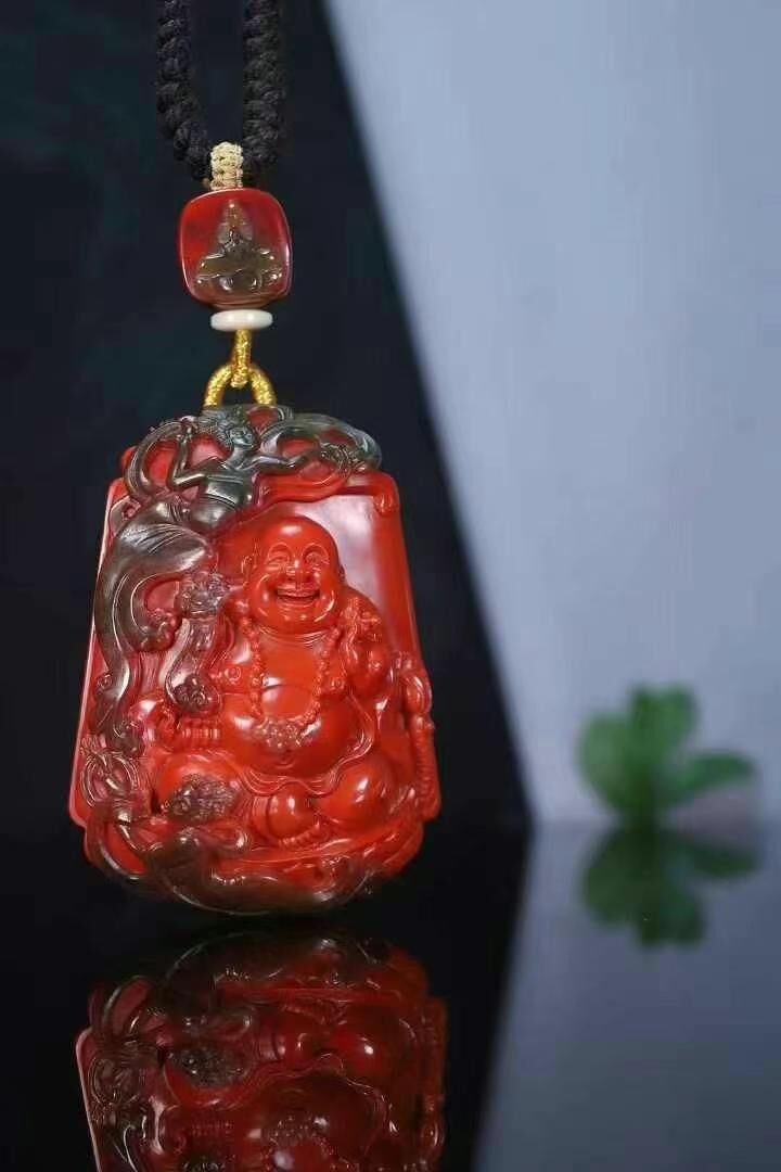巔峰造物:彌勒佛,彌勒佛巔峰刻畫工藝,玻璃皮俏色飛天,天然南紅瑪瑙,玻璃包漿錦紅方牌,尺寸規矩,厚庄。正面純色錦紅漿層雕琢彌勒佛,背面純色柿子紅。