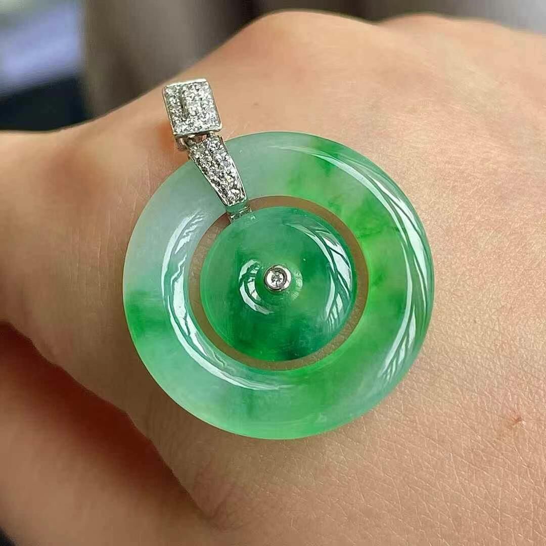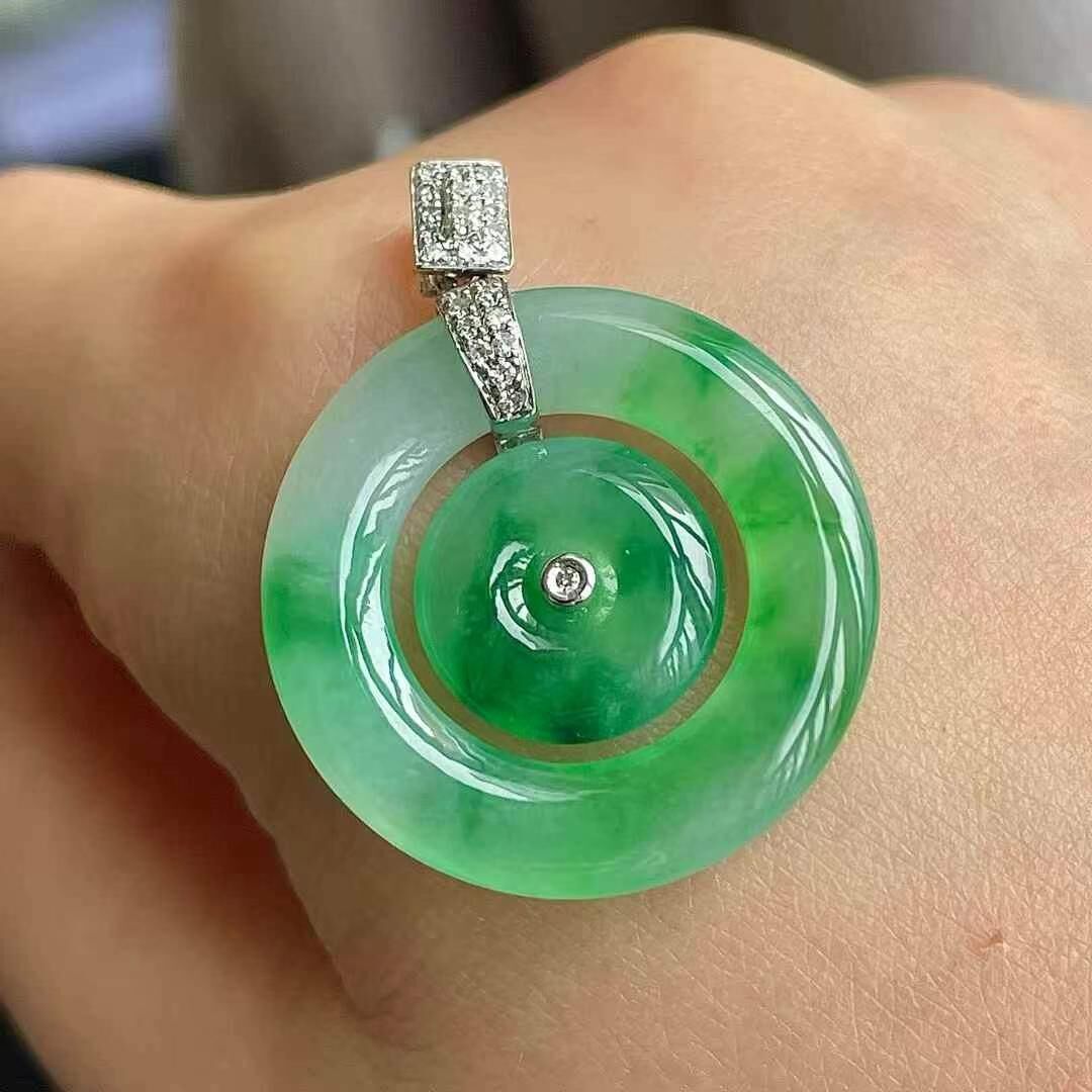 天然翡翠A玉,緬料,18K金鑲嵌,飽滿水潤,無裂。