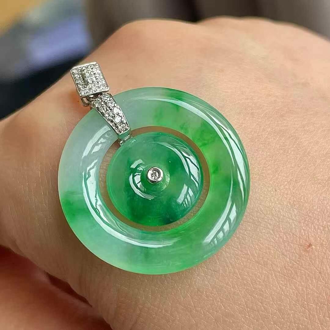 • 翡翠冰種辣綠母子扣吊墜 (24.2mm直徑),天然翡翠A玉, 緬甸玉, Jade, Jadeite