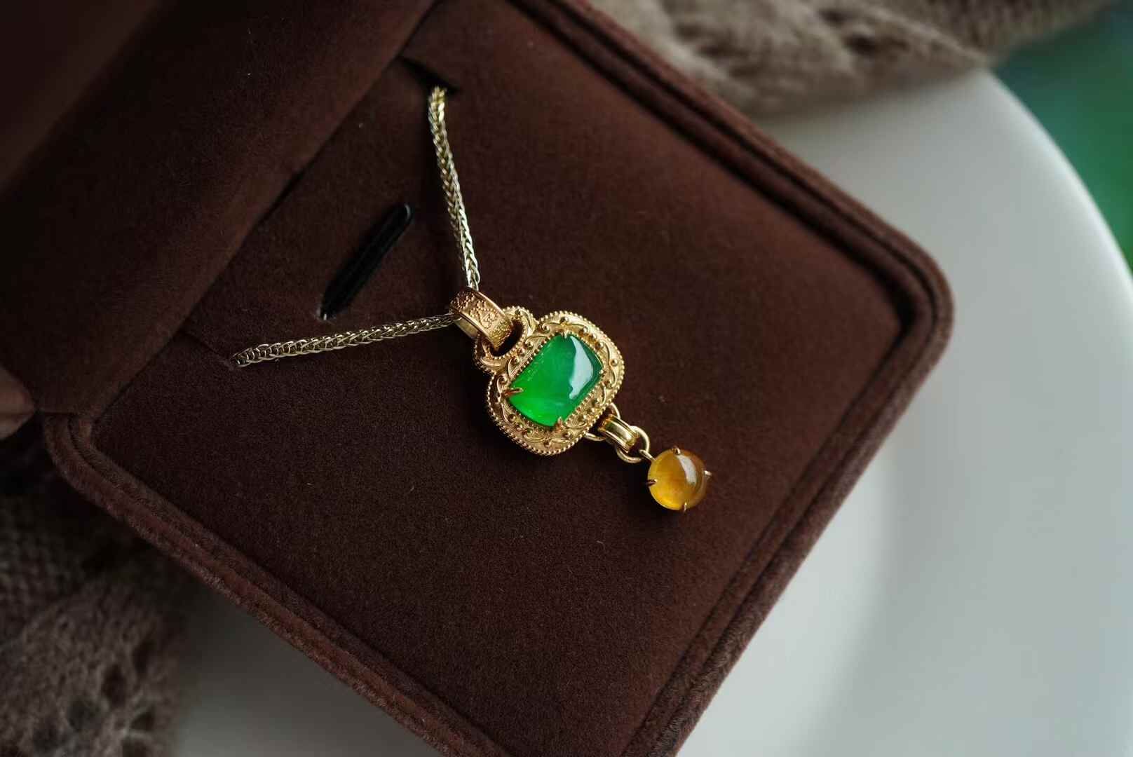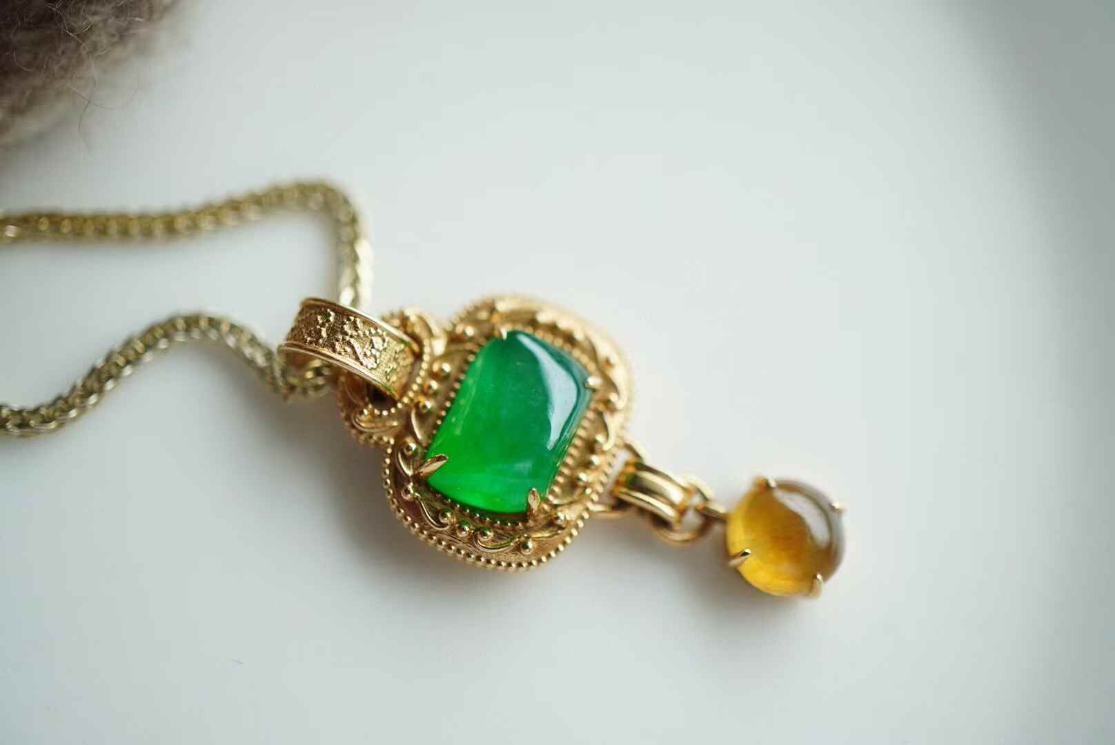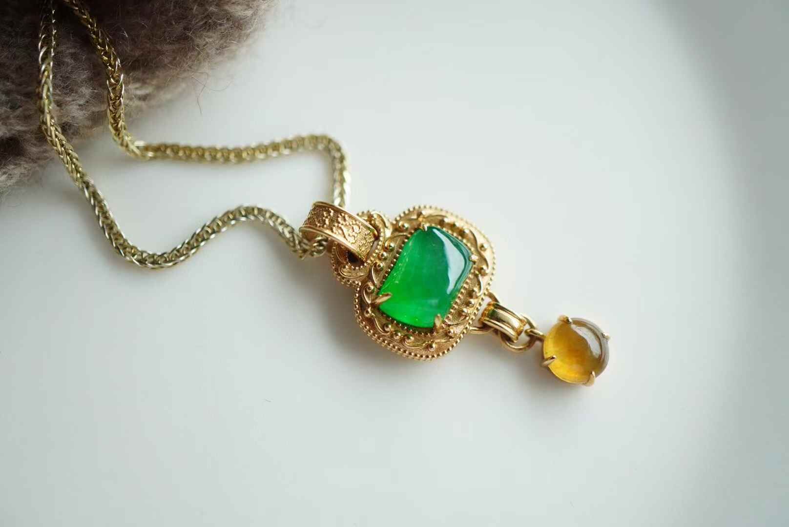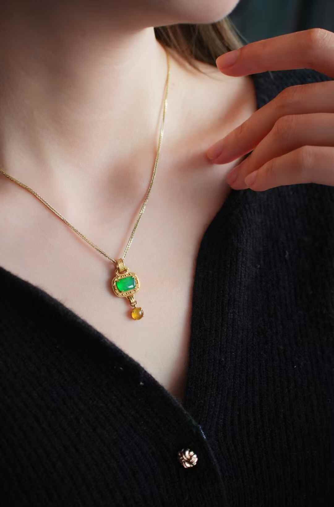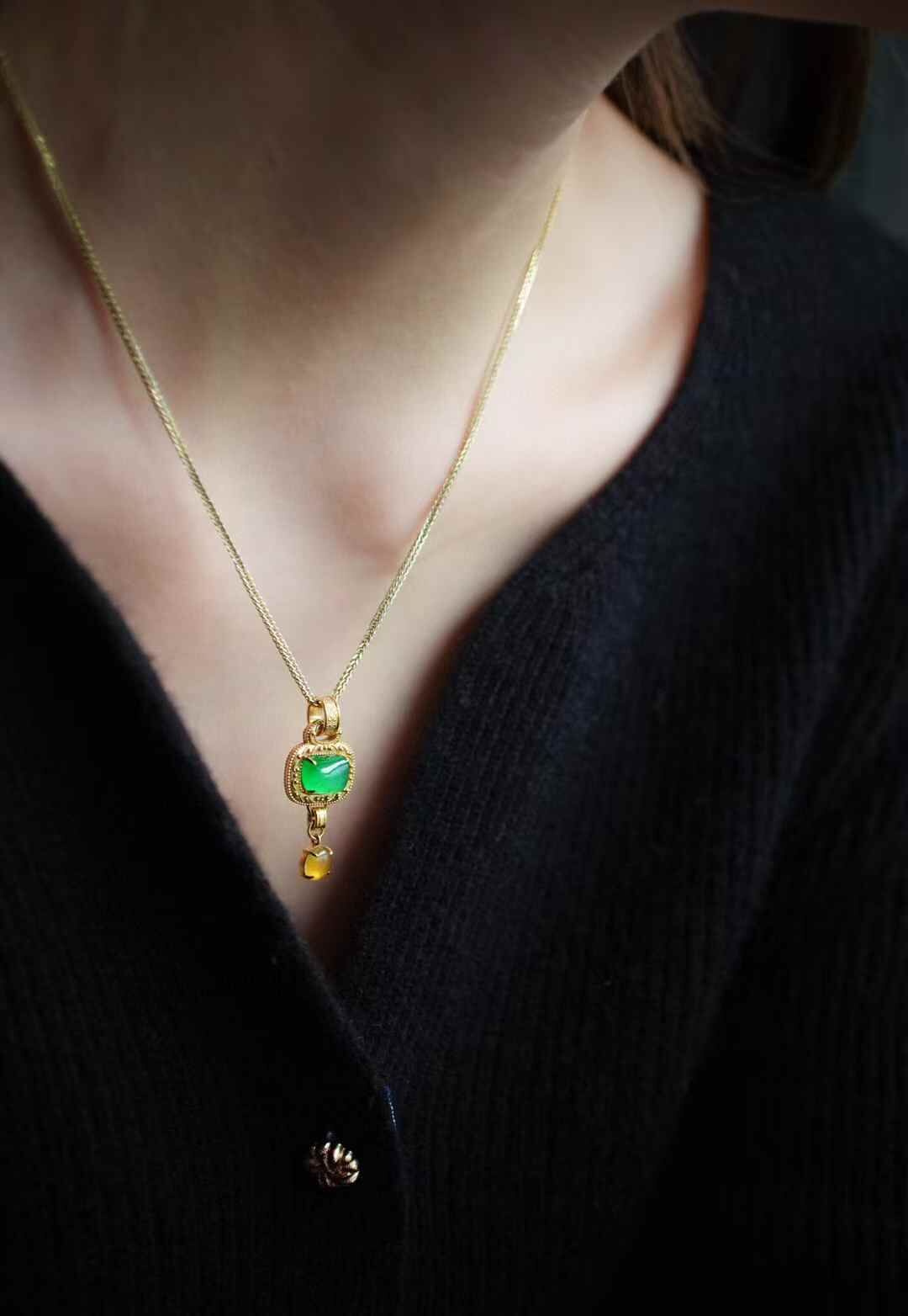簡單即為經典·翡翠吊墜,天然翡翠A玉,中式美學,造型好精巧,參考古代經典圖案長命鎖的設計,18K重金設計,吉祥美好,古拙耐看。隨形高冰陽綠翡翠,搭配冰黃翡蛋面,撞色設計,貴氣十足。