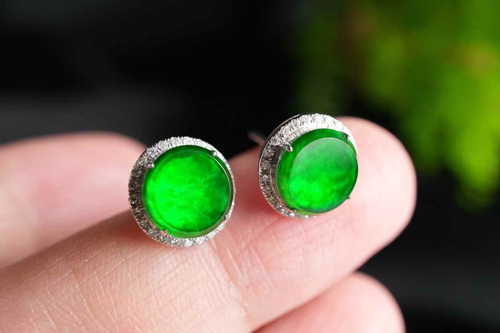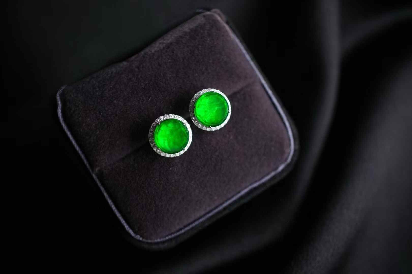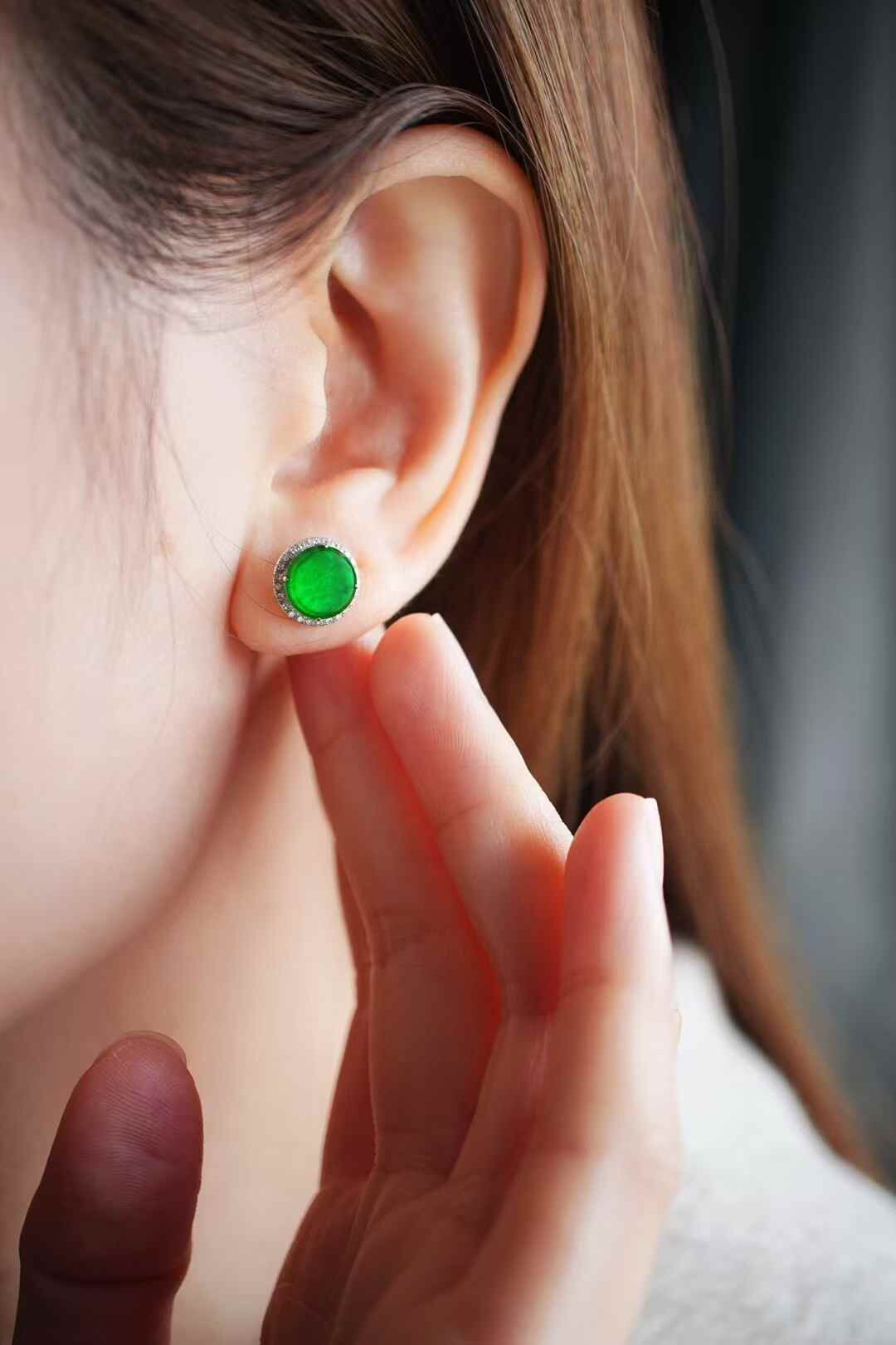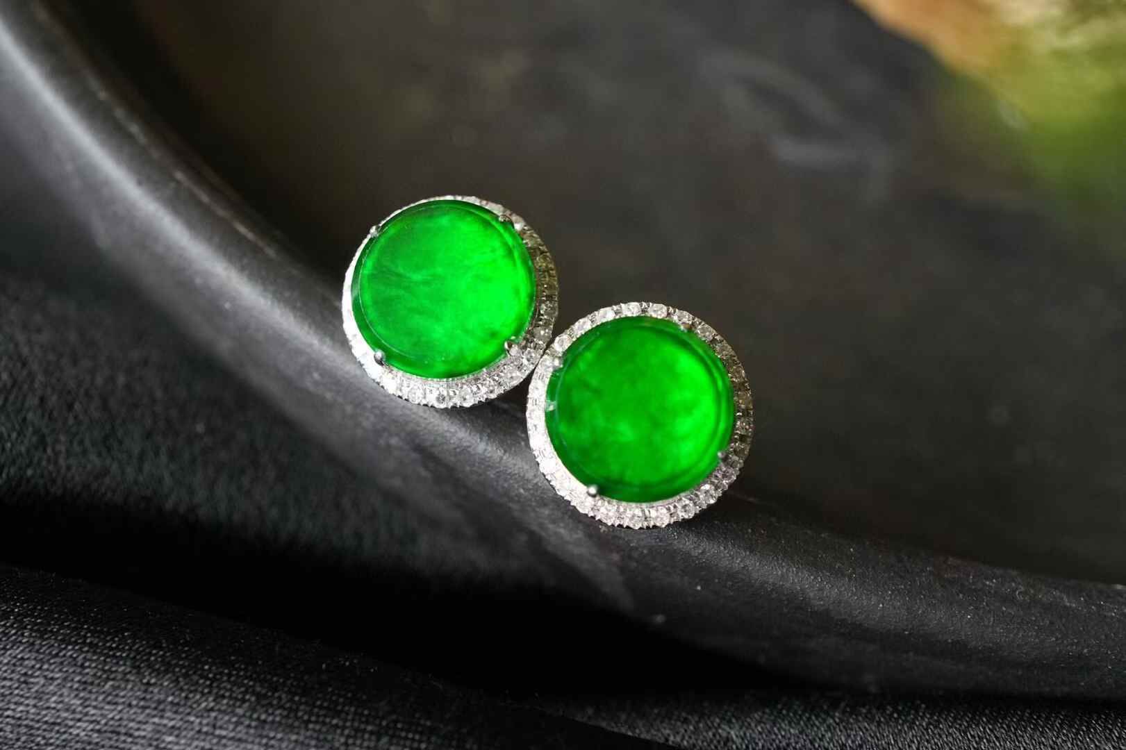 辣陽綠翡翠圓牌耳釘,超級好看,上耳炸光,超級辣色!天然翡翠A玉,緬料,種色都好,尺寸也不小。18K金滿鑽鑲嵌,去年做的,還有這一對!賣完沒有了。