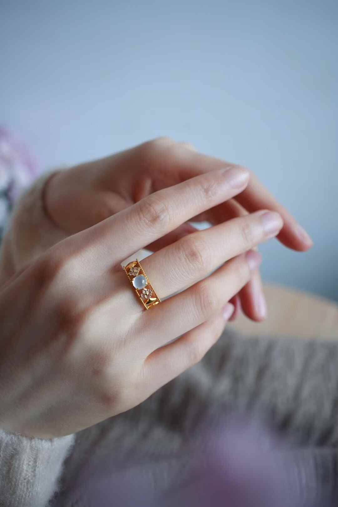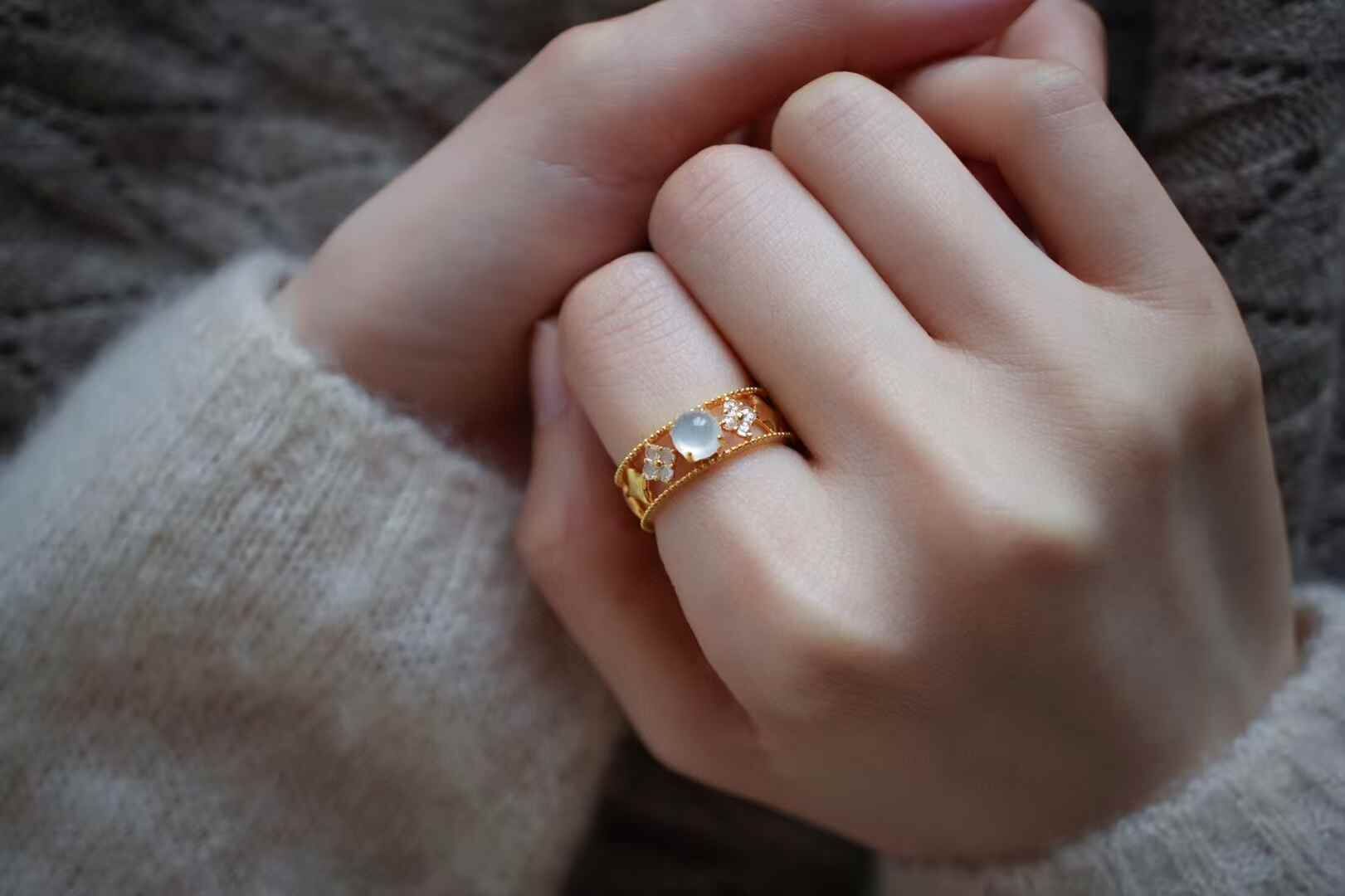 富有特色的18K金鑲嵌,不落俗套。相比傳統設計更有設計感、時尚感,天然翡翠A玉,裸石冰種翡翠,冰透起光,精品品質!上手效果非常好,舉手投足間透出知性大方的美。