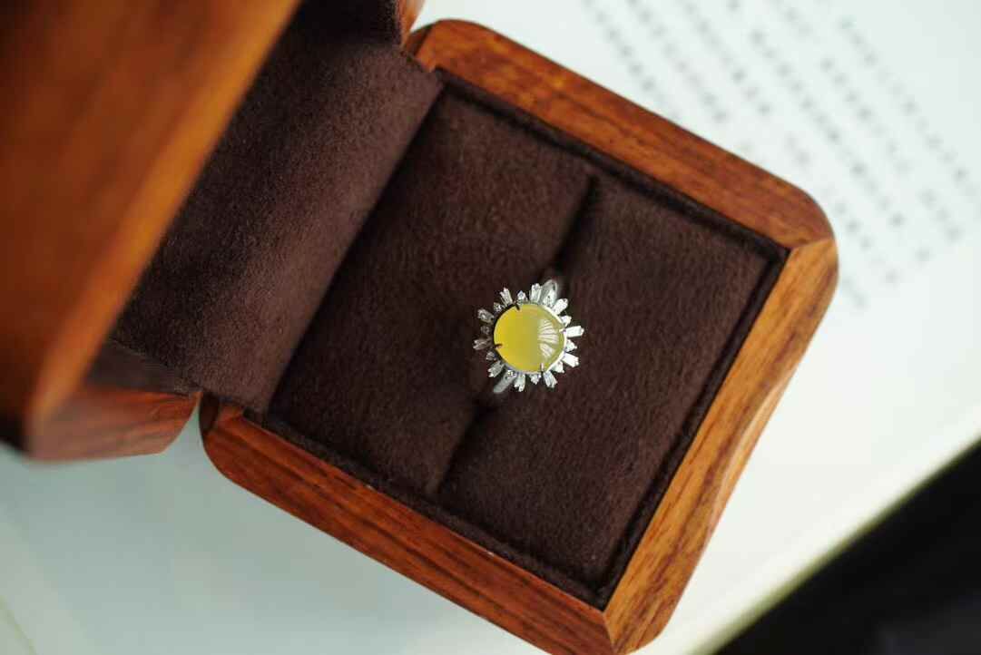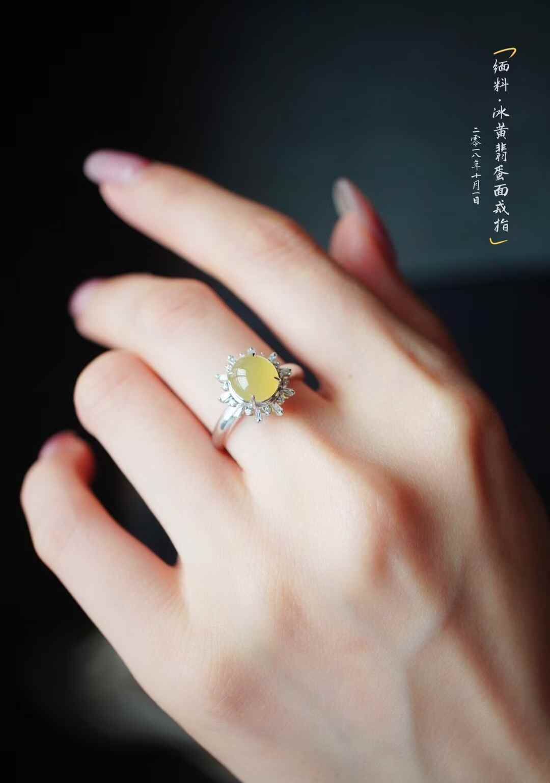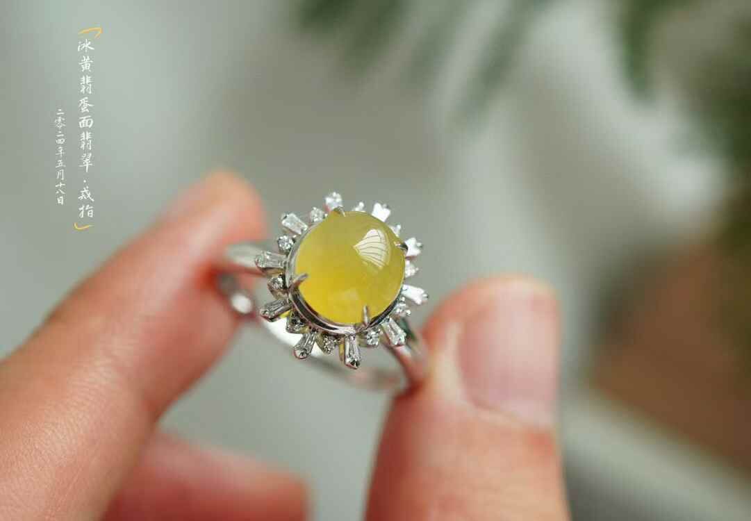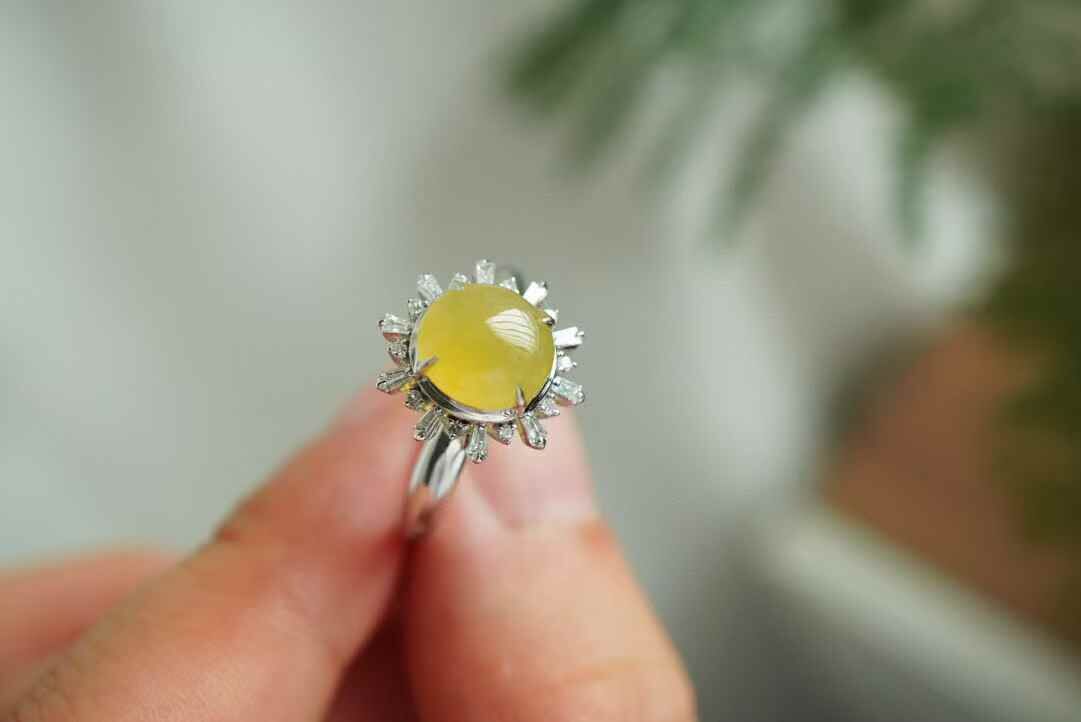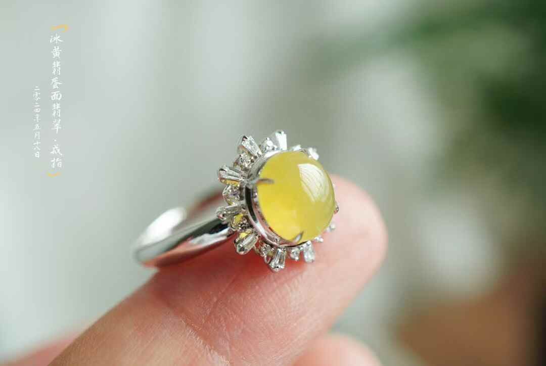 • 翡翠冰黃翡蛋面戒指,天然翡翠A玉, 緬甸玉, Jade, Jadeite
