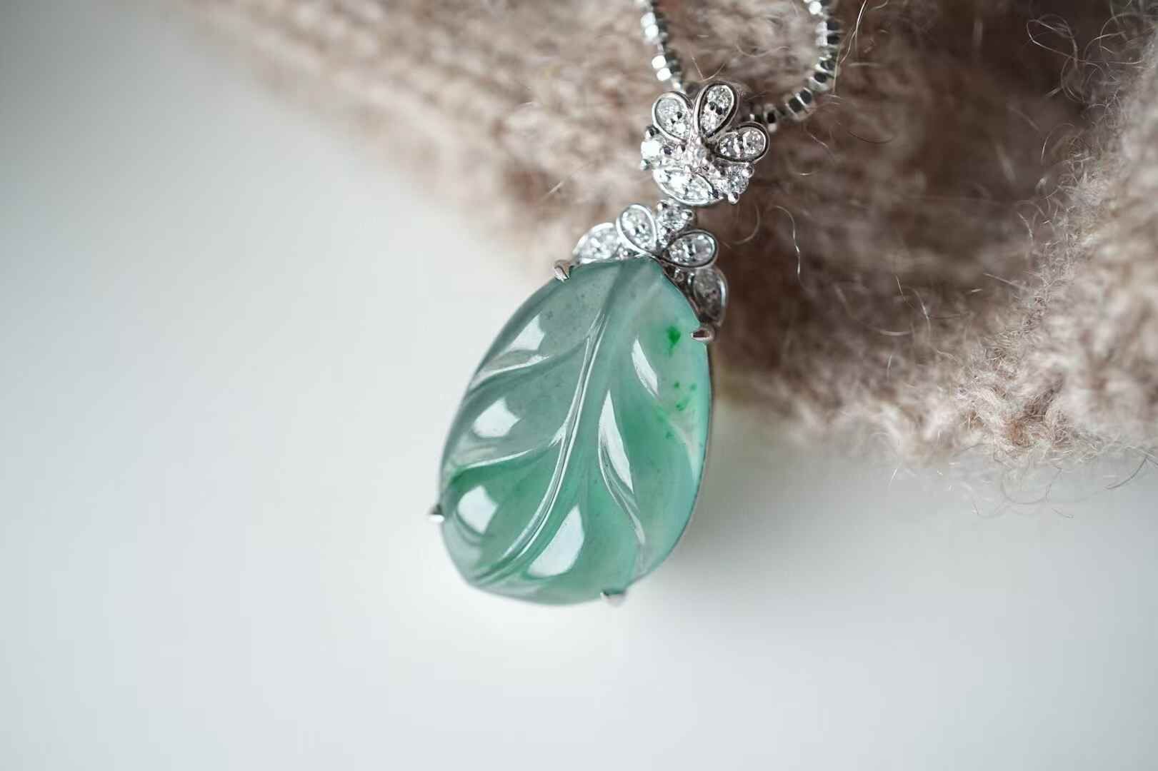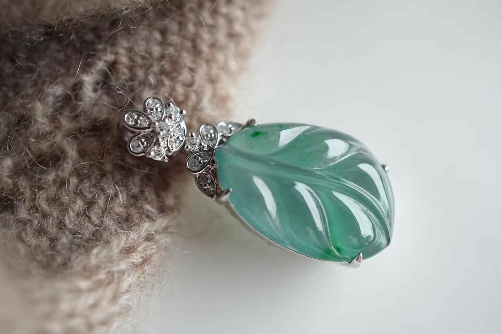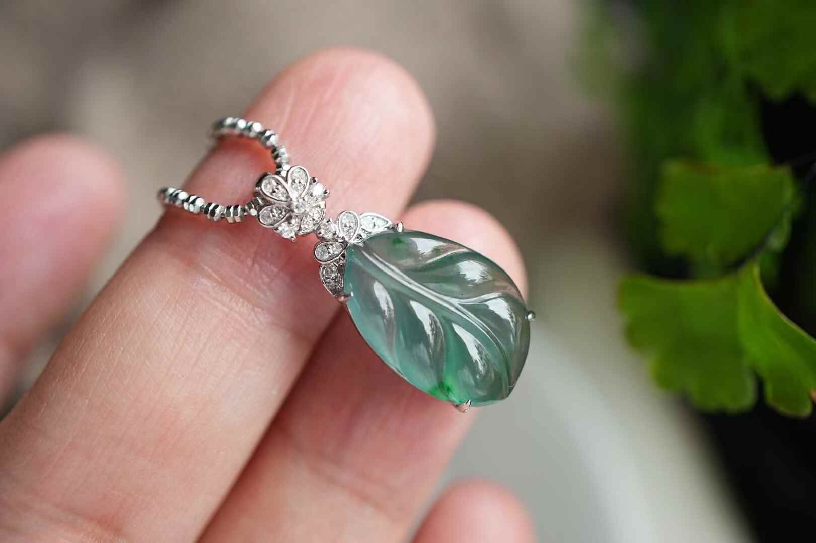 • 翡翠冰藍水飄花葉子吊墜,天然翡翠A玉, 緬甸玉, Jade, Jadeite