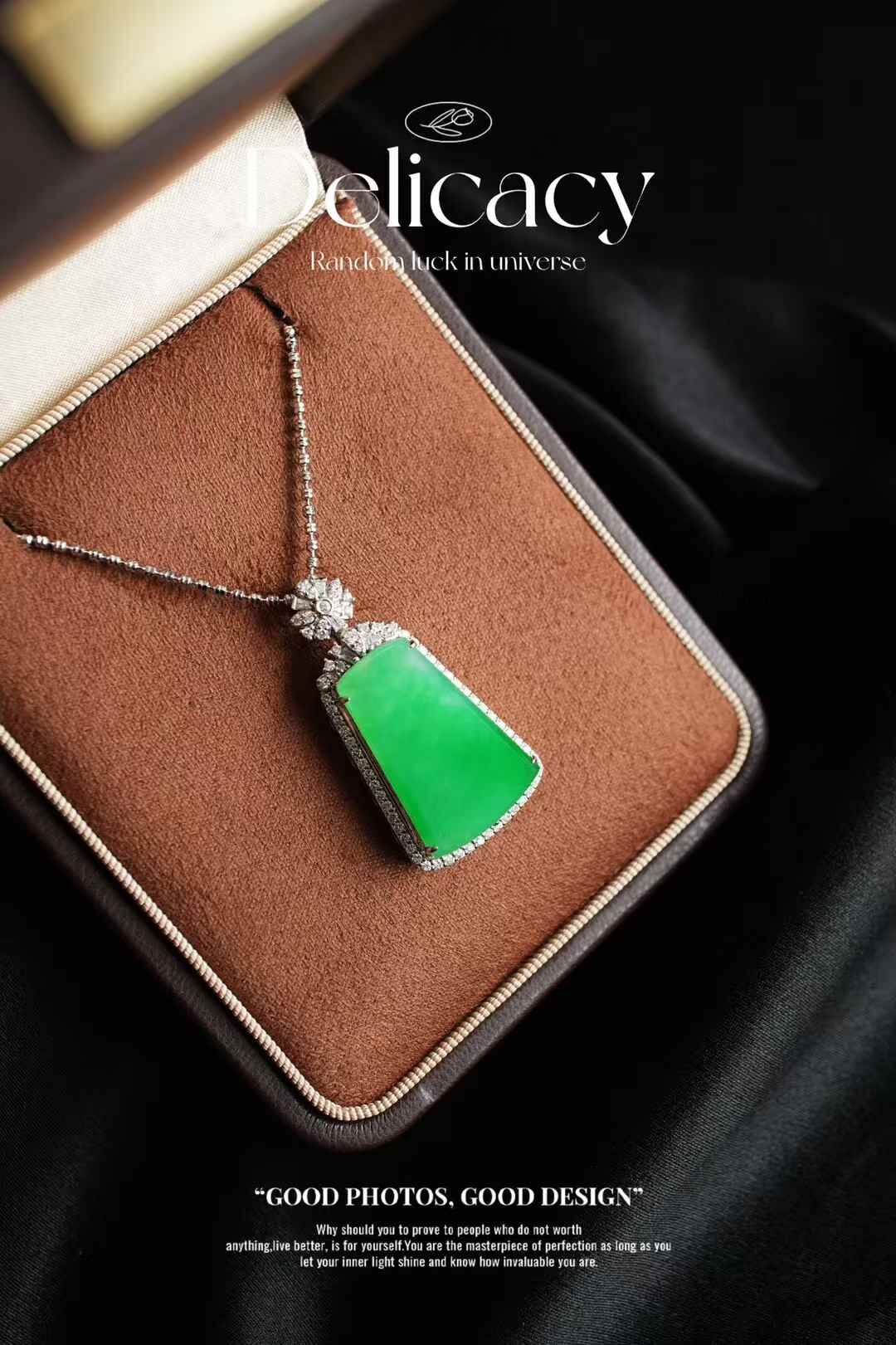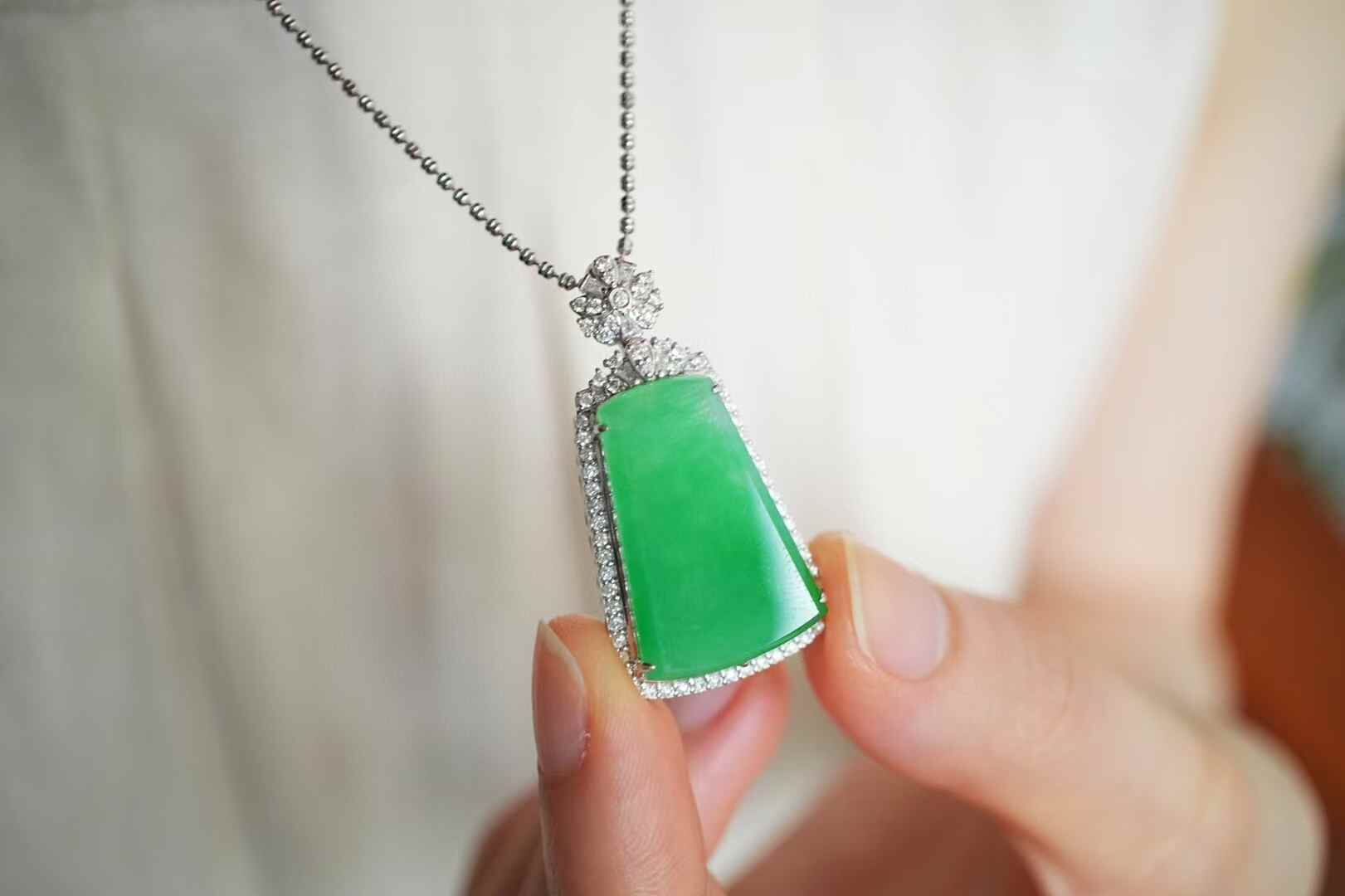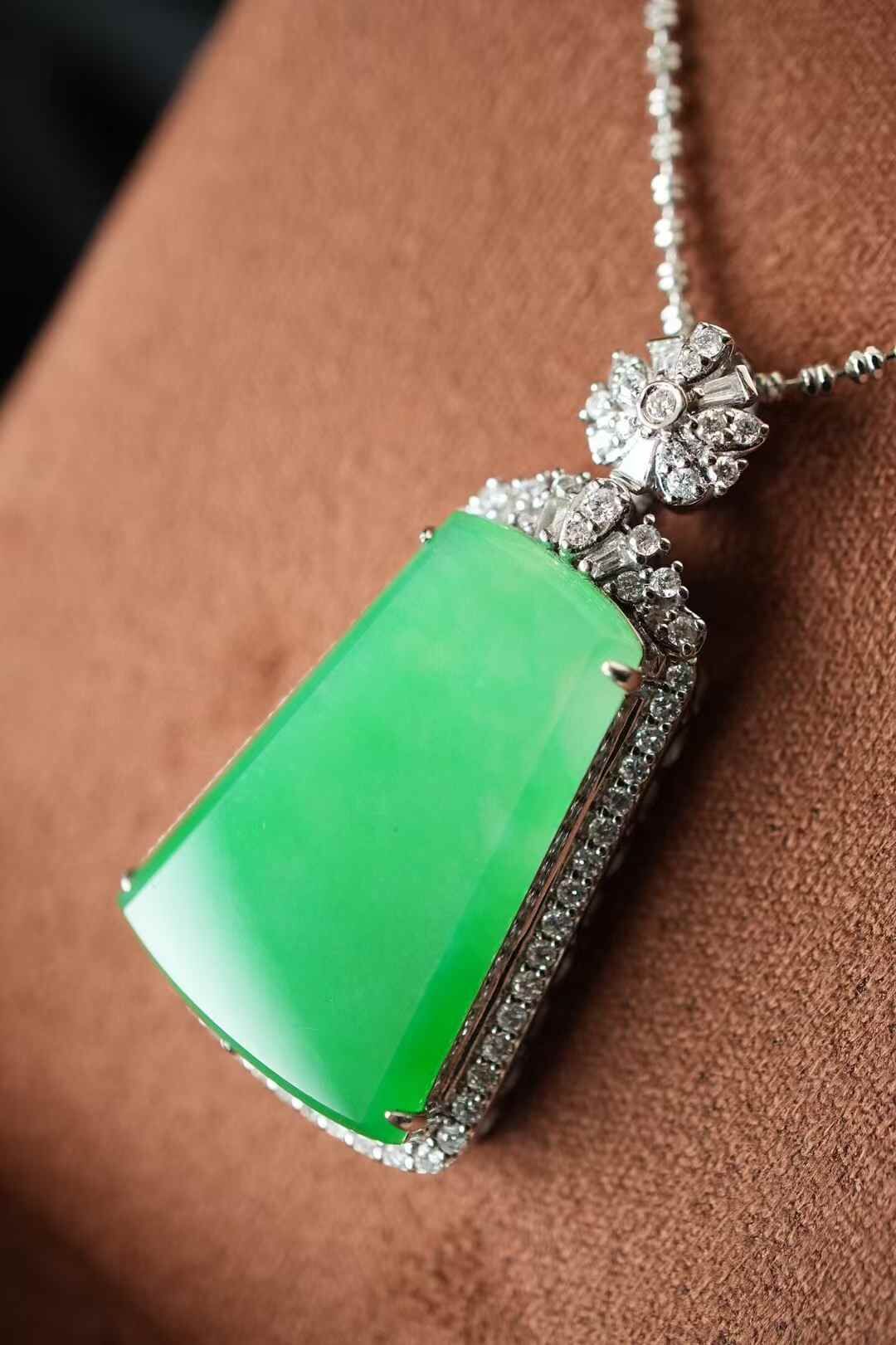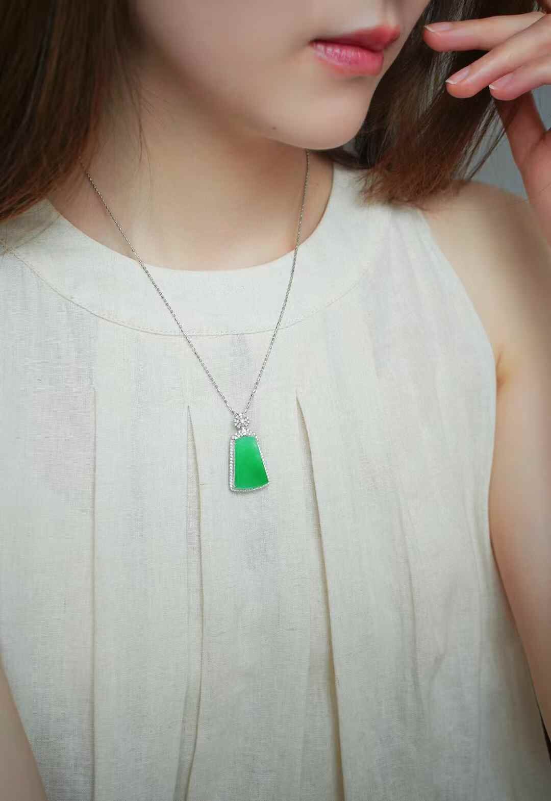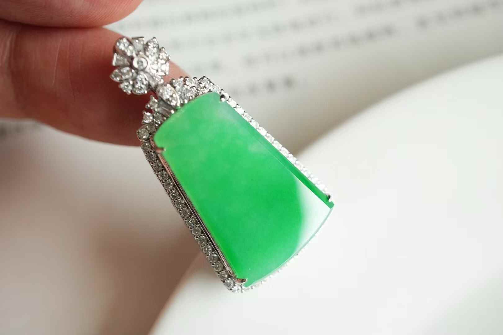 收藏級,緬料天然翡翠A玉。強烈推薦這塊滿色無事牌!以“無飾”詮釋極致純粹,滿色滿綠,色澤正陽綠,種老 質地細膩潤澤,水潤盈足,靈氣十足。形體飽滿厚實,整體無棉感無雜色,品相極佳,妥妥的精品品質!