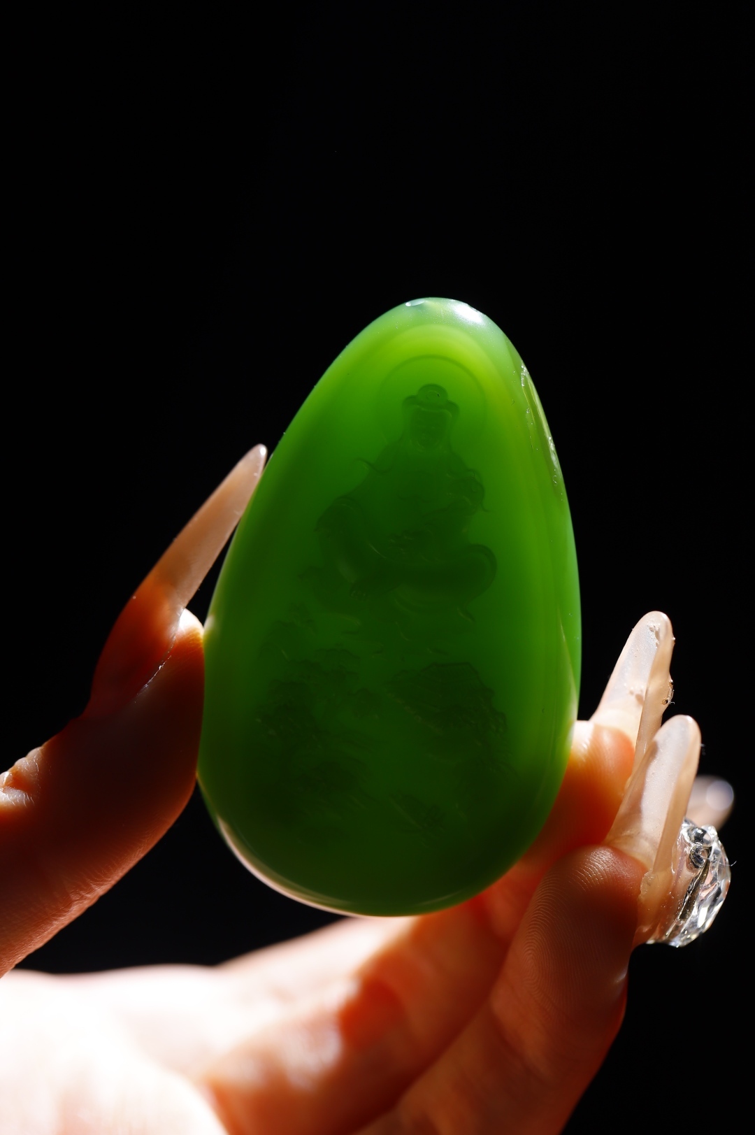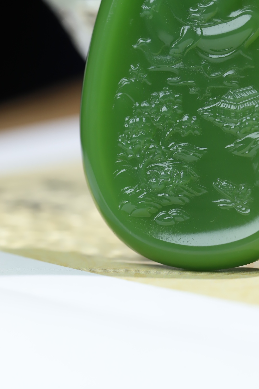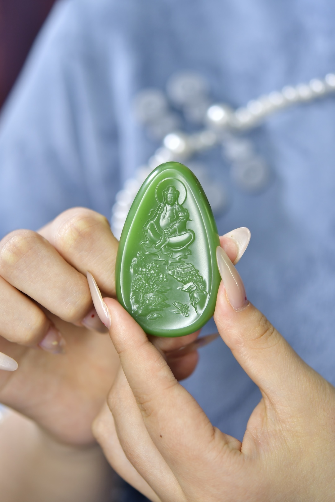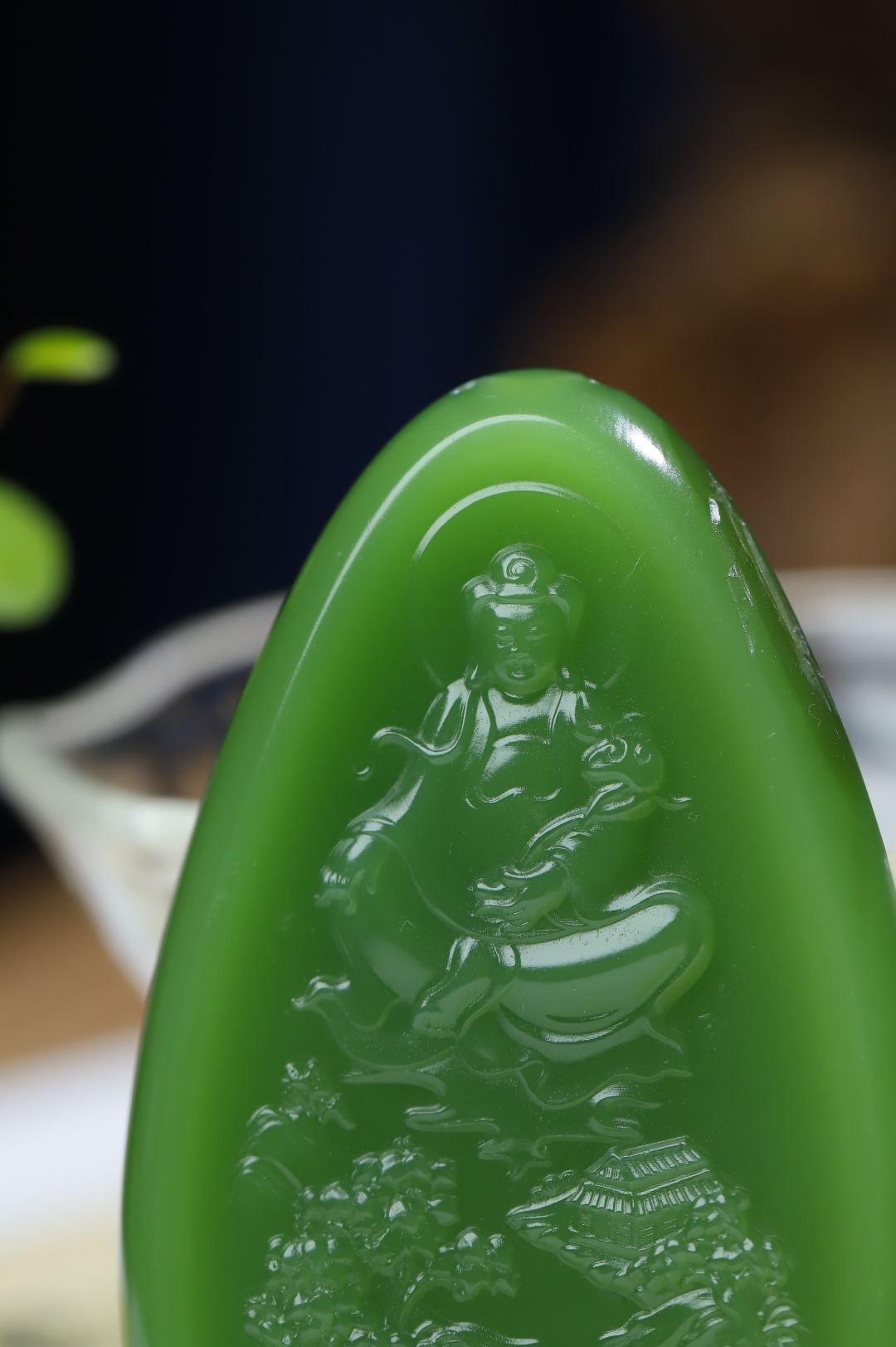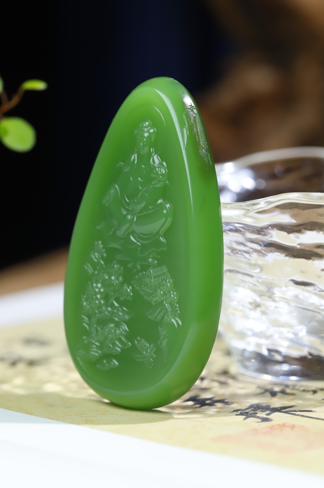 和田玉碧玉掛件,玉質溫潤細膩,油性十足!工藝精湛,線條柔美,雕刻觀音,慈眉善目,沉靜端莊,垂眸下視,憐愛地俯視世間一切。整體畫面簡潔,將普度眾生之態表現得淋漓盡至。