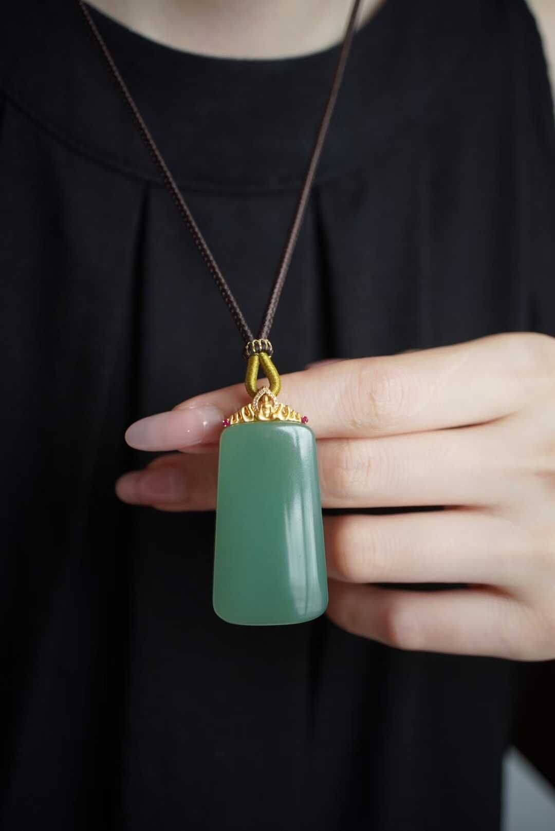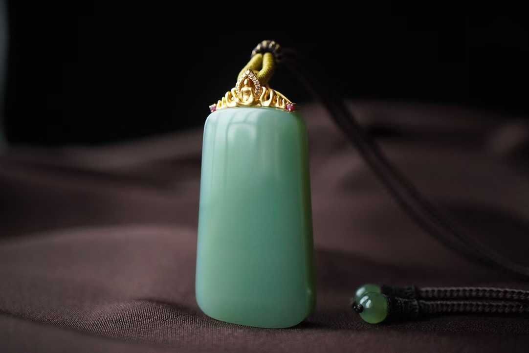 和田玉碧玉冰底粉青,高密度一級細料,顏色清雅不發暗,玉質瑩潤細膩,過燈冰透無結構,無棉無水線,無雜無裂完美品相。牌型厚實飽滿,素面無雕寓意平平安安。
