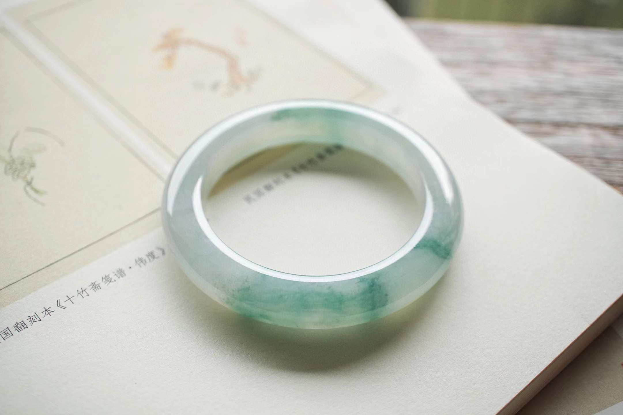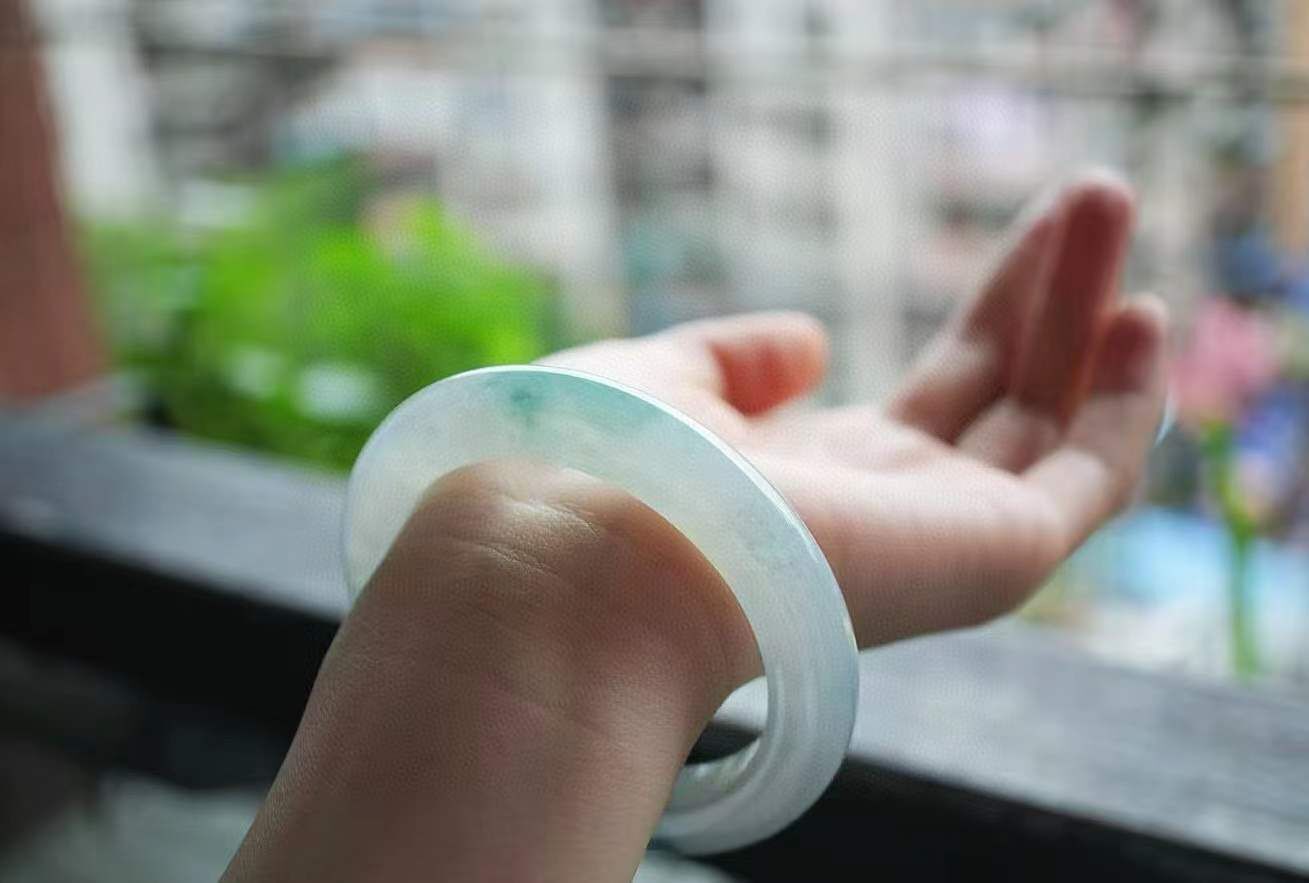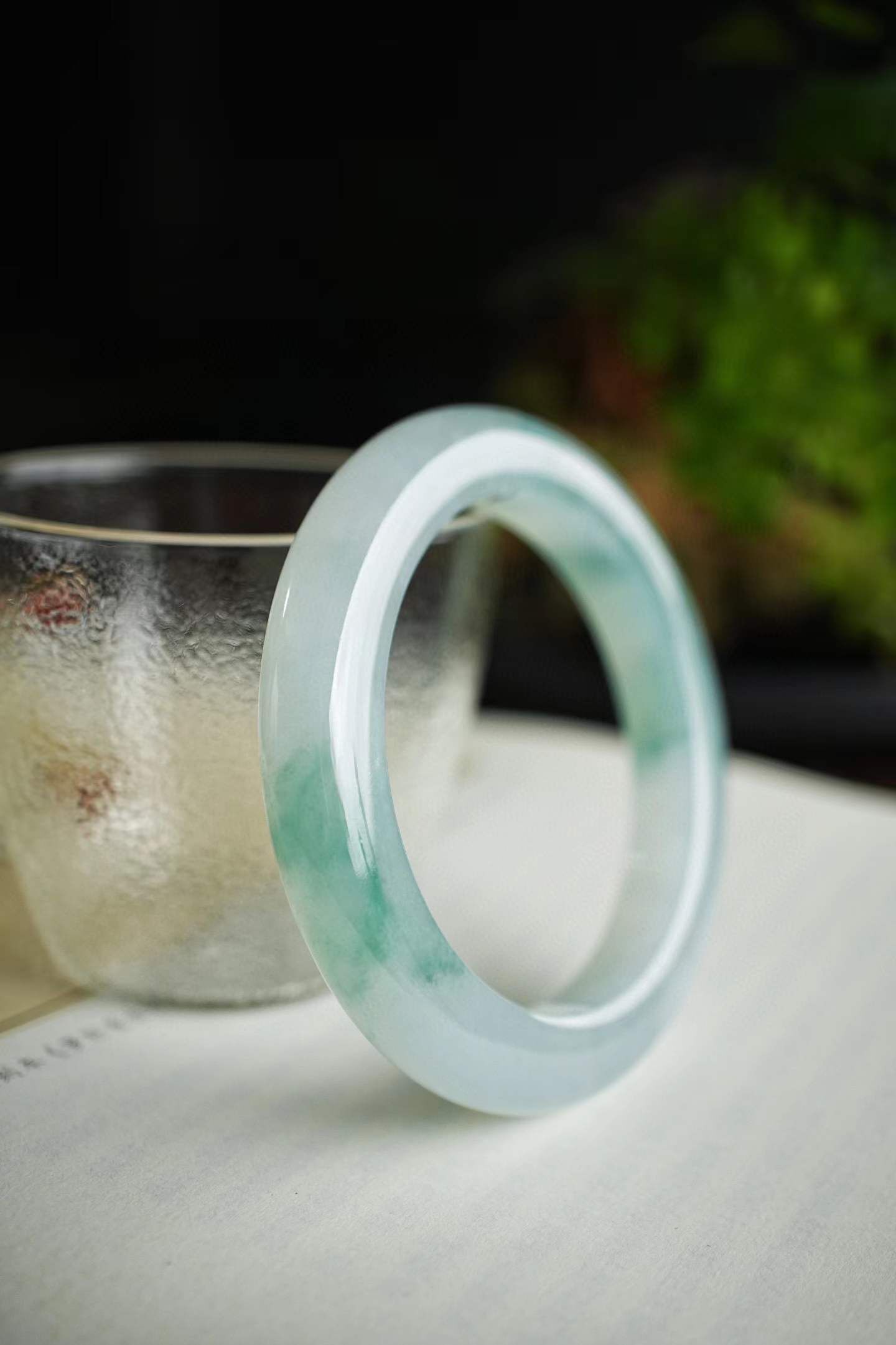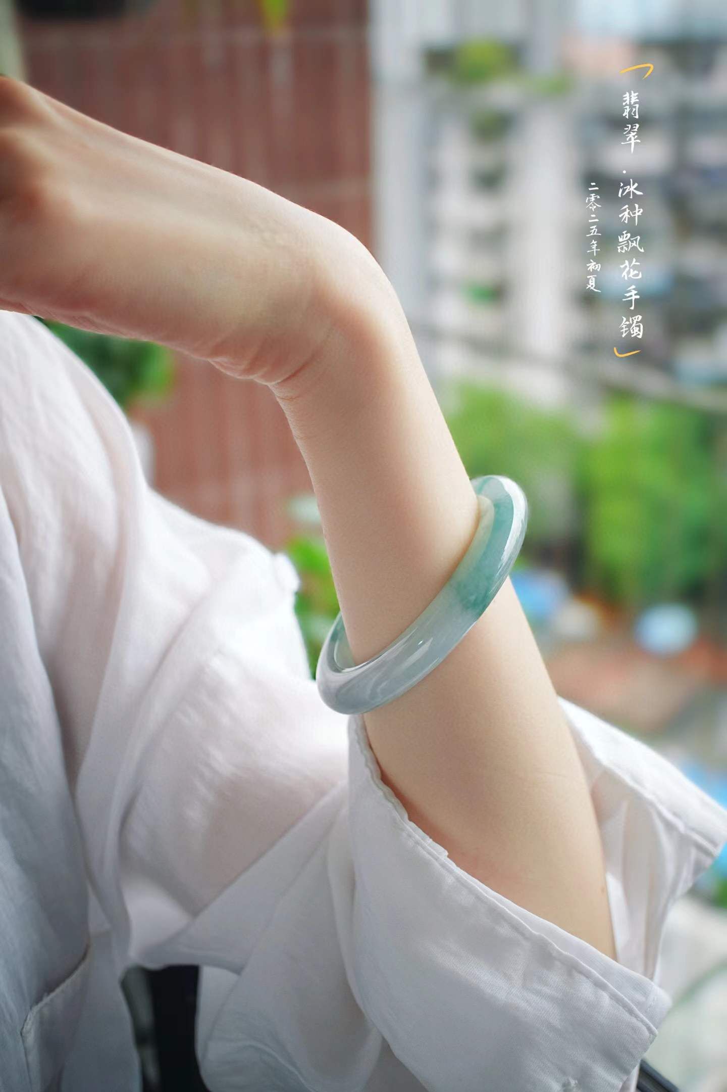 天然翡翠A玉,老坑高冰種翡翠,種老水足,起熒光,通透冰潤,種水完全可以透肉,太美了,極致種水,外加寥寥數筆飄花,靈動飄逸,54-55的手都可佩戴。