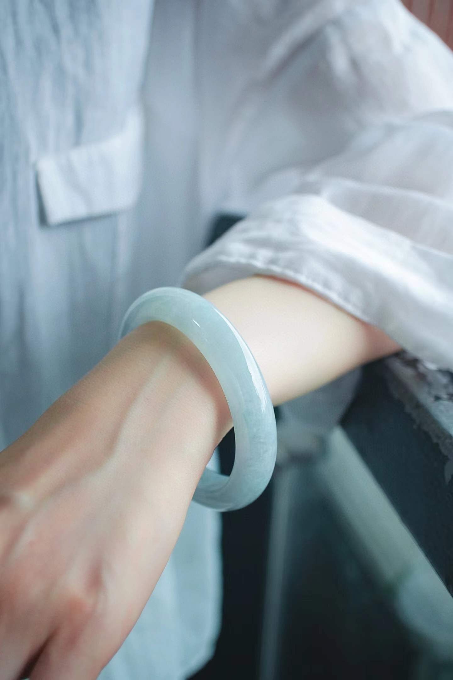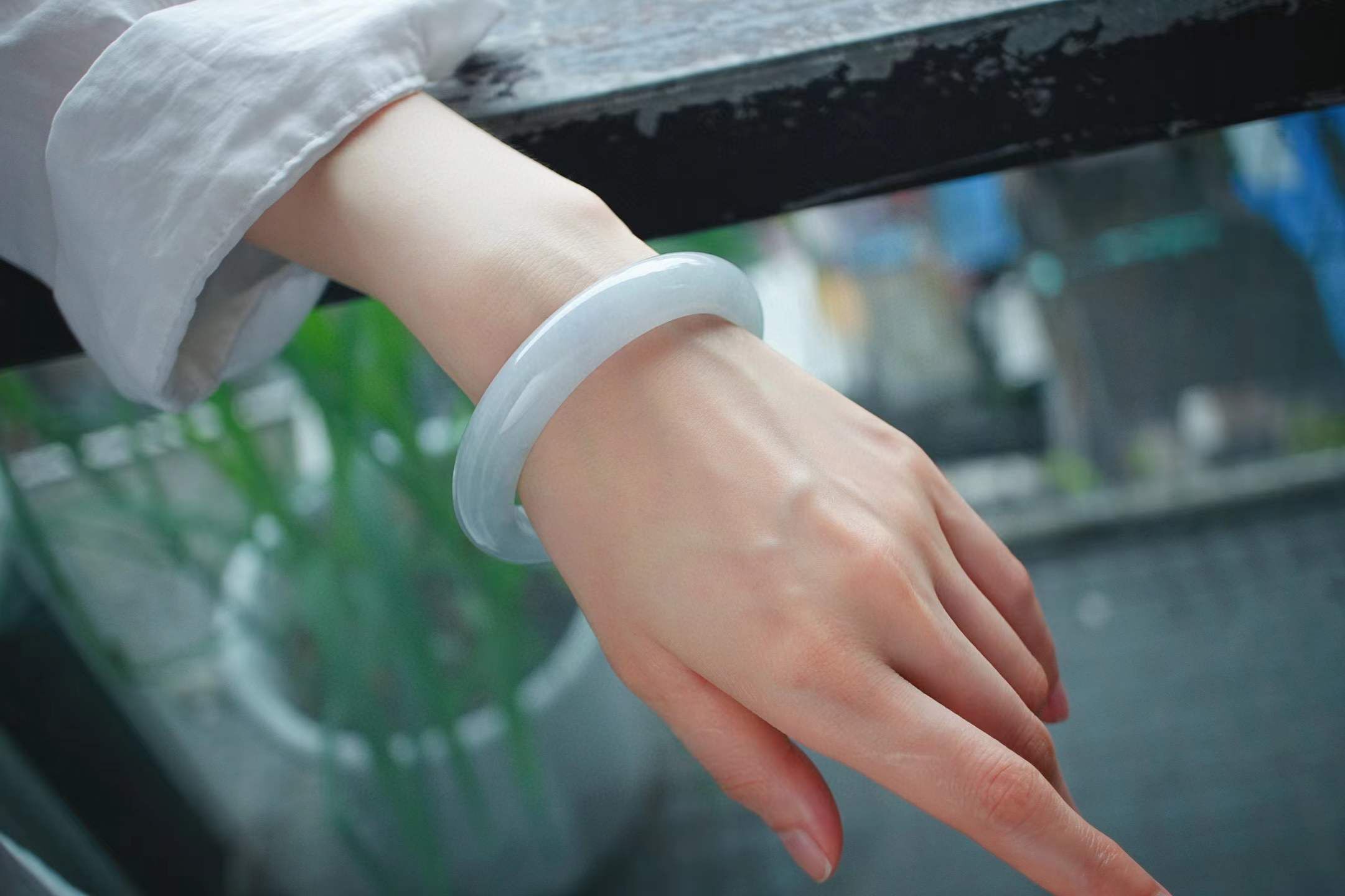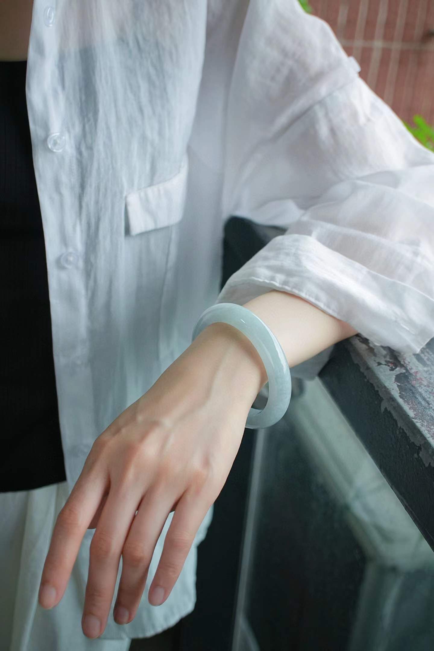 天然翡翠A玉,難得大圈口60、61的朋友都可以戴,溫柔冰純的白月光,冰潤細膩,種水佳,純粹的美。佩戴時尚簡單,也有東方古典之美。