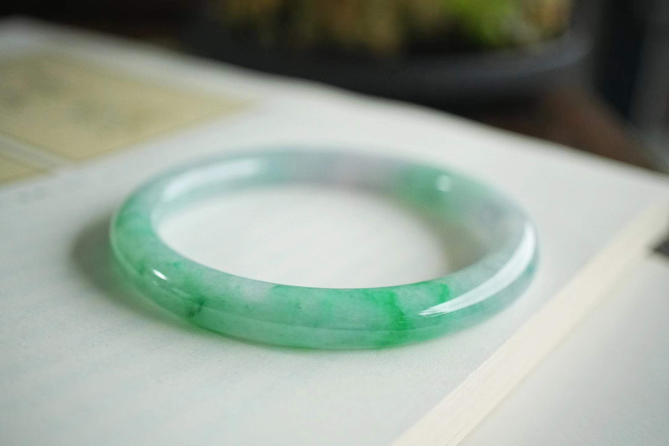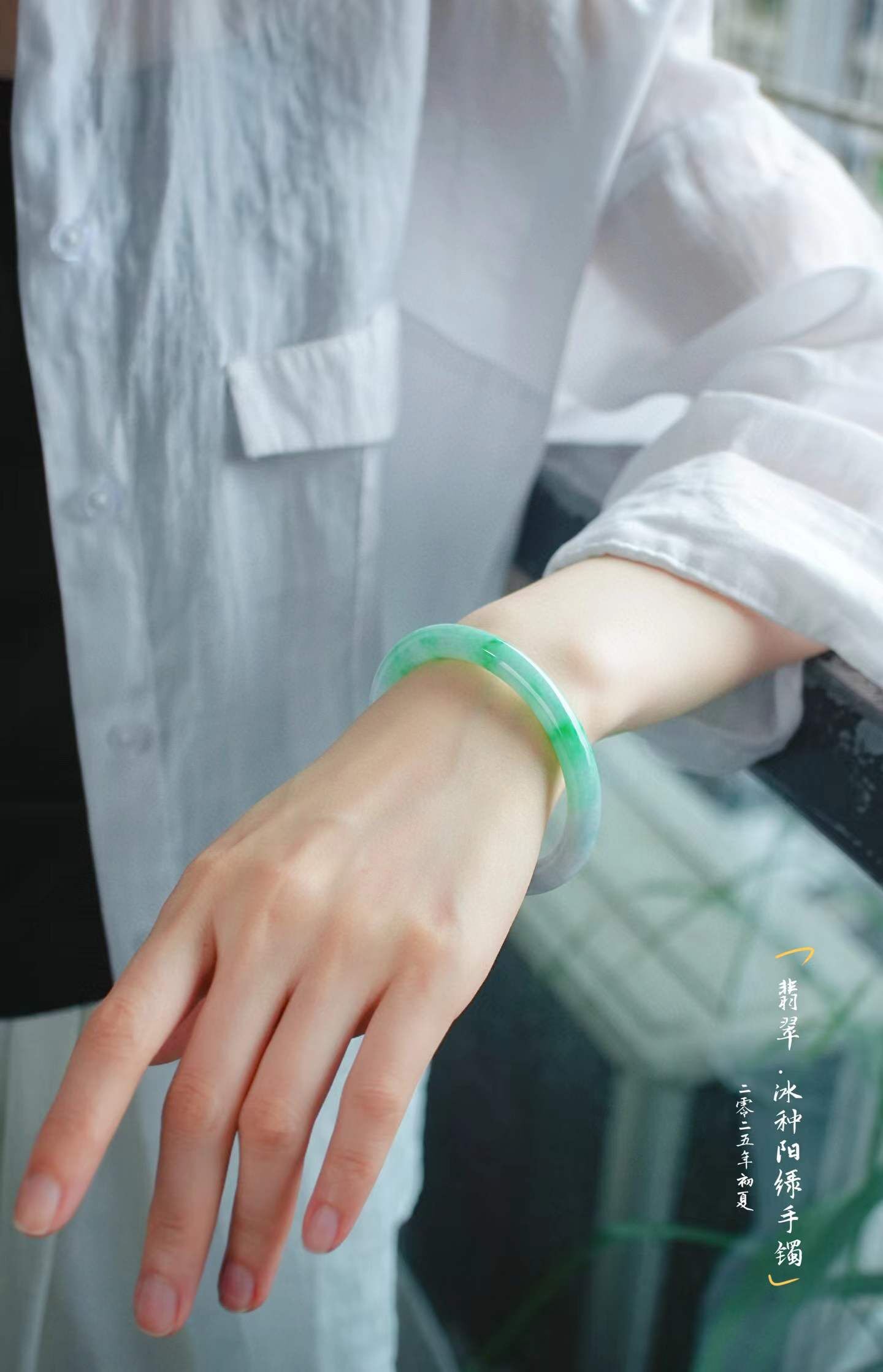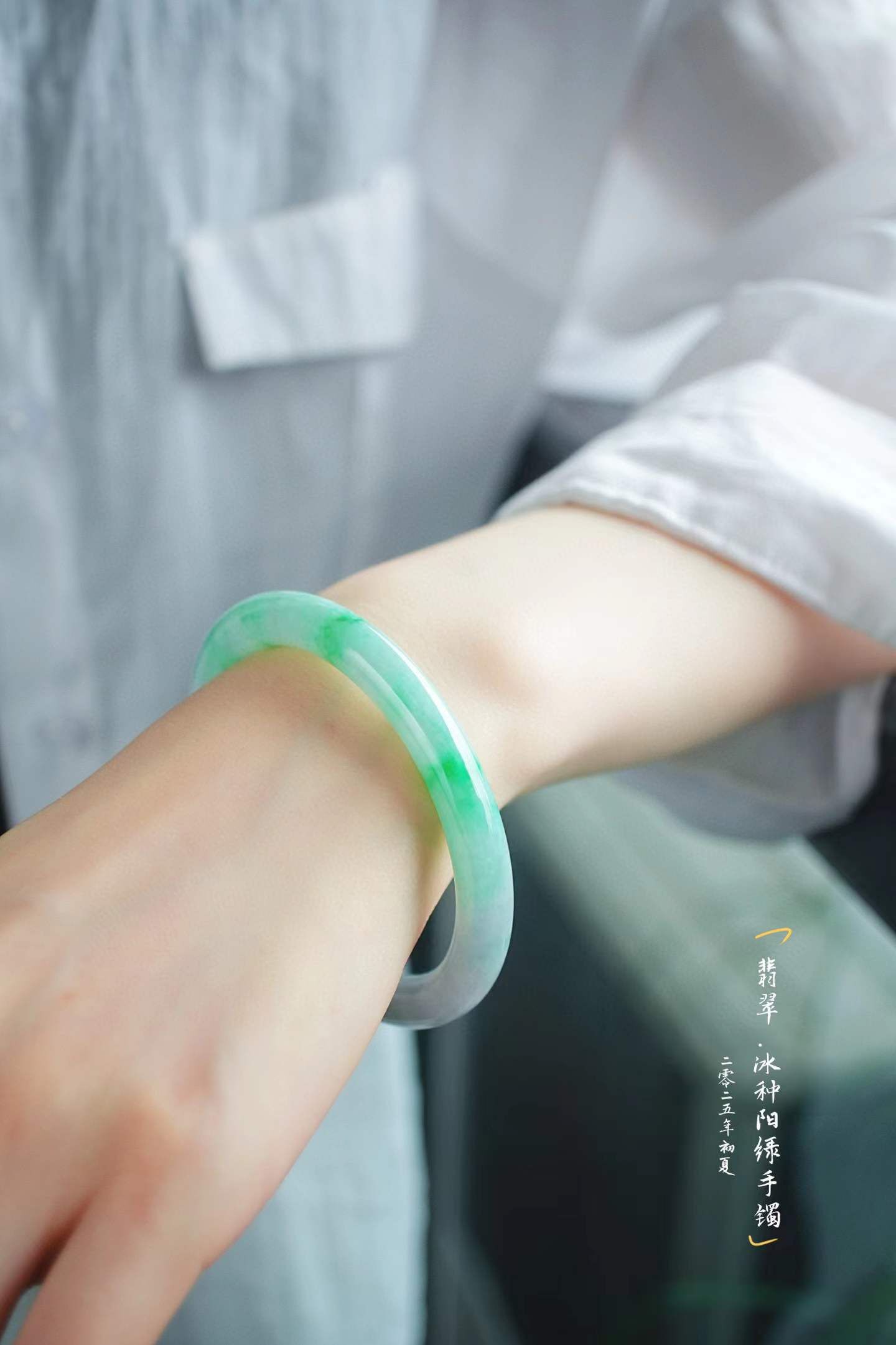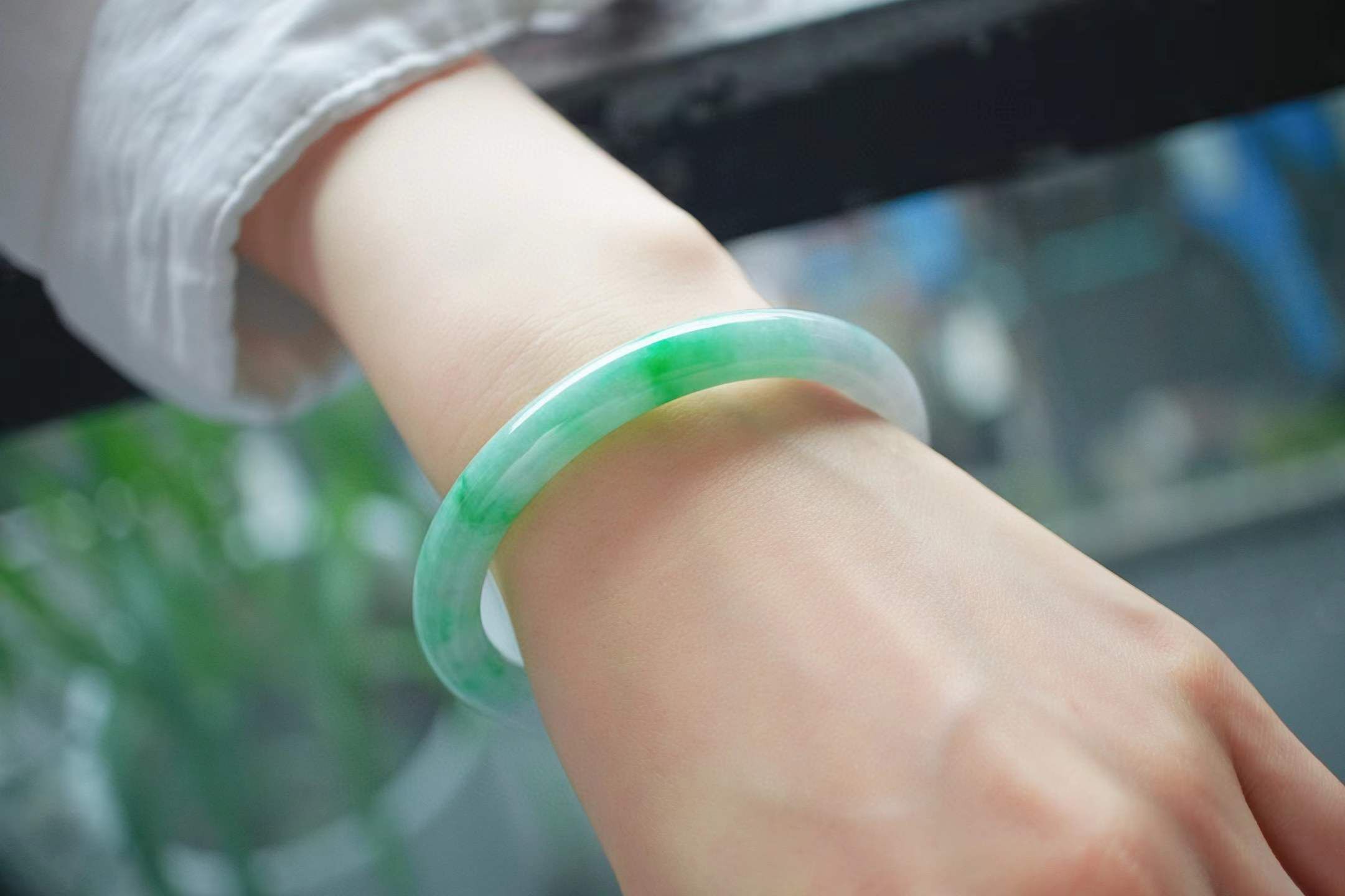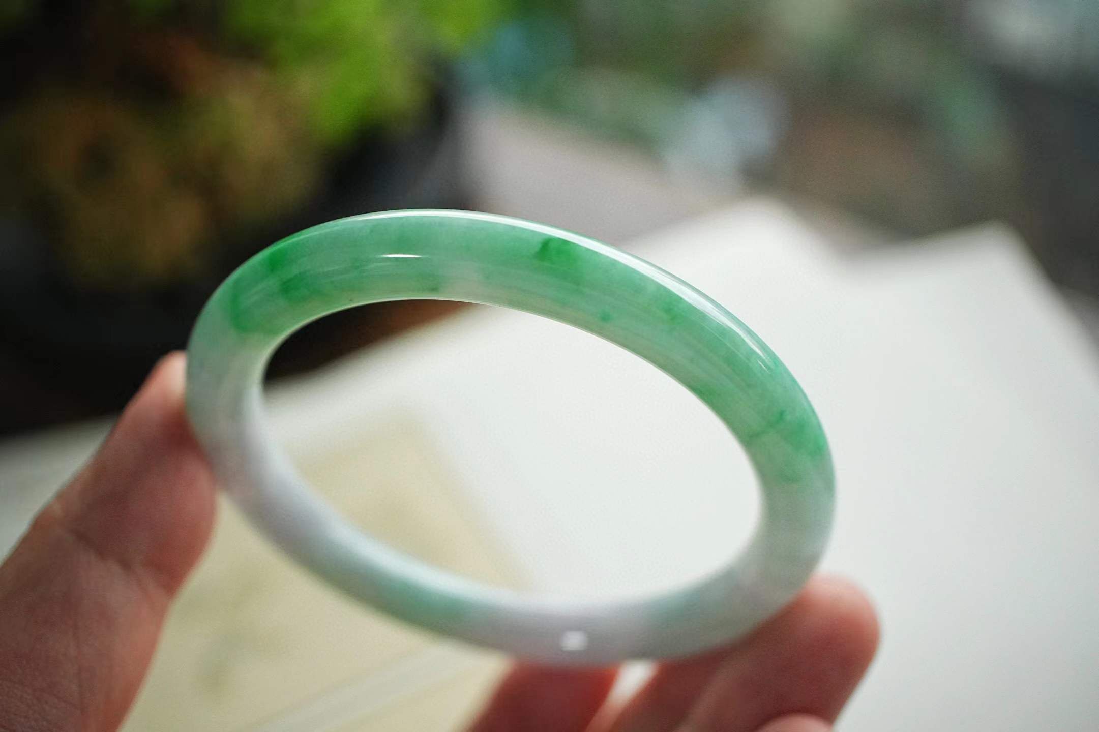 • 冰飄辣陽綠翡翠圓條手鐲,天然翡翠A玉, 緬甸玉, Jade, Jadeite