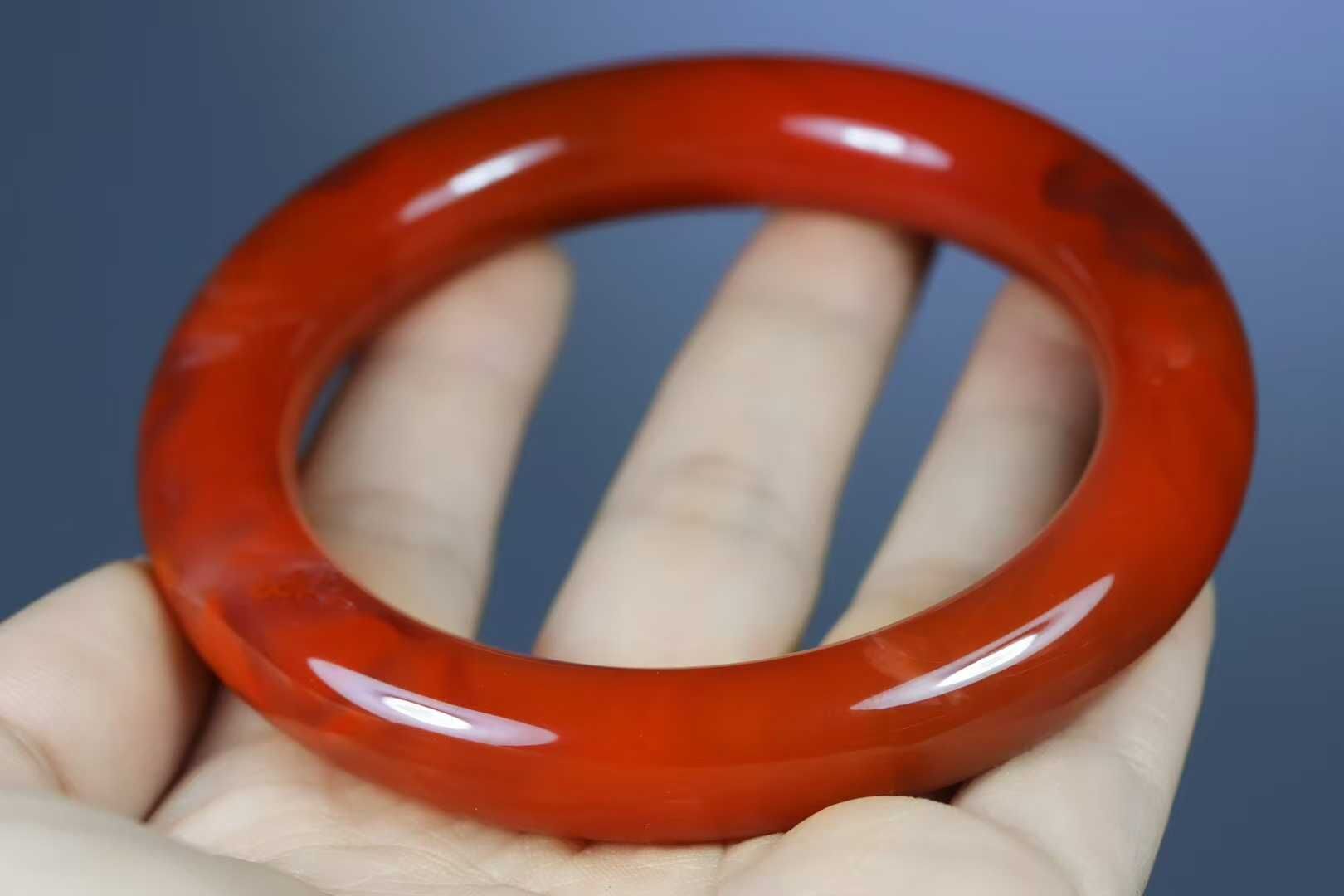 收藏品,天然南紅瑪瑙,難得的聯合料櫻桃紅圓條手鐲,滿色滿肉,色澤紅潤濃郁,玉質溫潤細膩,珠光寶氣的膠質感更是讓人一眼難忘,高貴又不失精緻,品相非常非常完美的一隻聯合料的裂堪比保山南紅,能做手鐲的料首先得夠大,且裂少