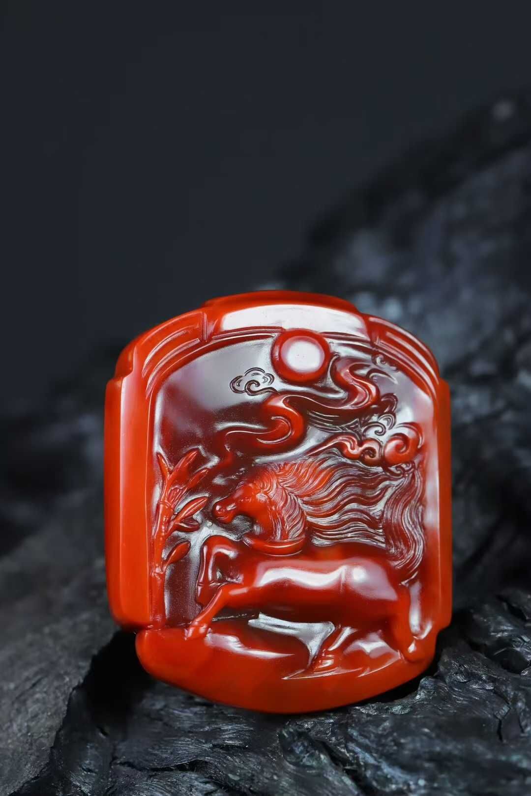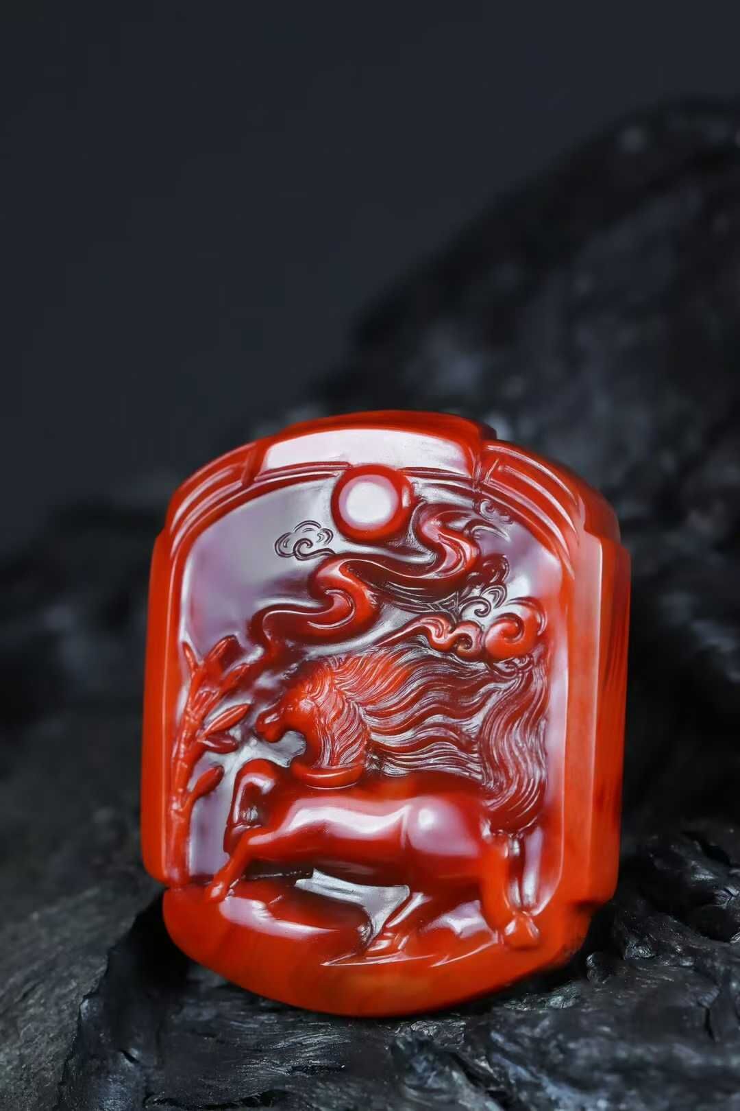 收藏級天然南紅瑪瑙,精品南紅馬牌掛件,生肖馬朋友的福音,優質瓦西玉化料,規整牌子,滿色滿肉柿子紅玫瑰凍,色澤紅潤油亮,玉質溫潤細膩,精工雕琢,名家作品