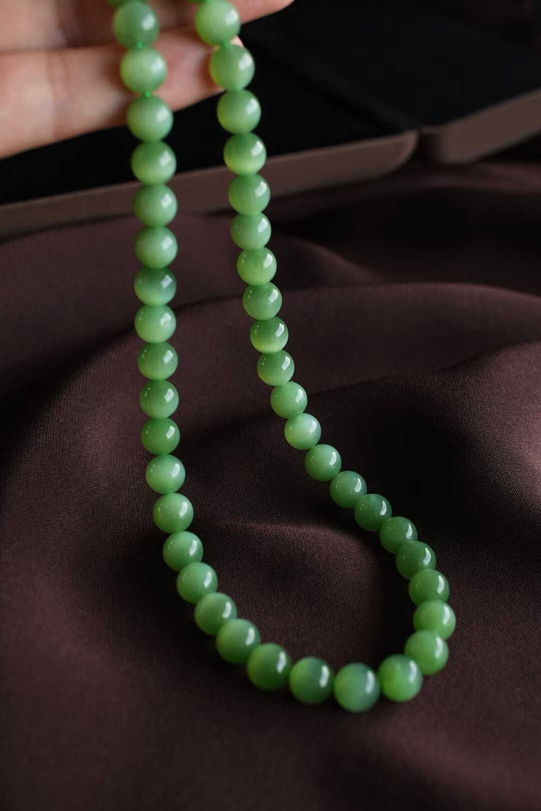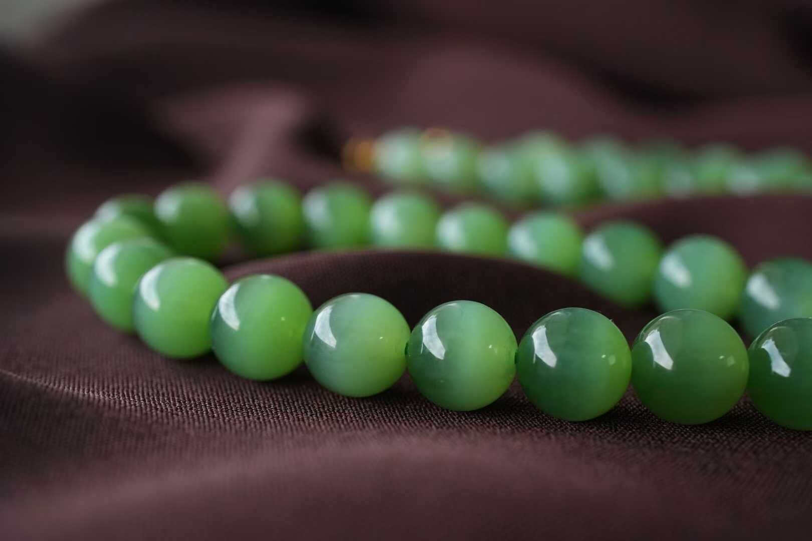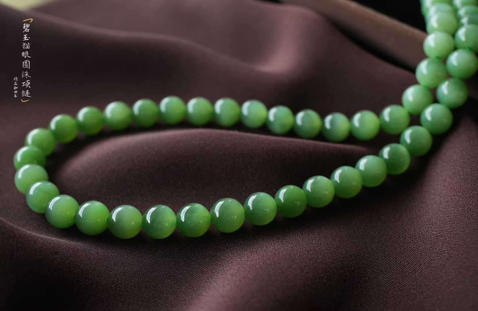 • 和田玉老料碧玉貓眼圓珠項鏈 (8mm直徑),天然和田玉軟玉