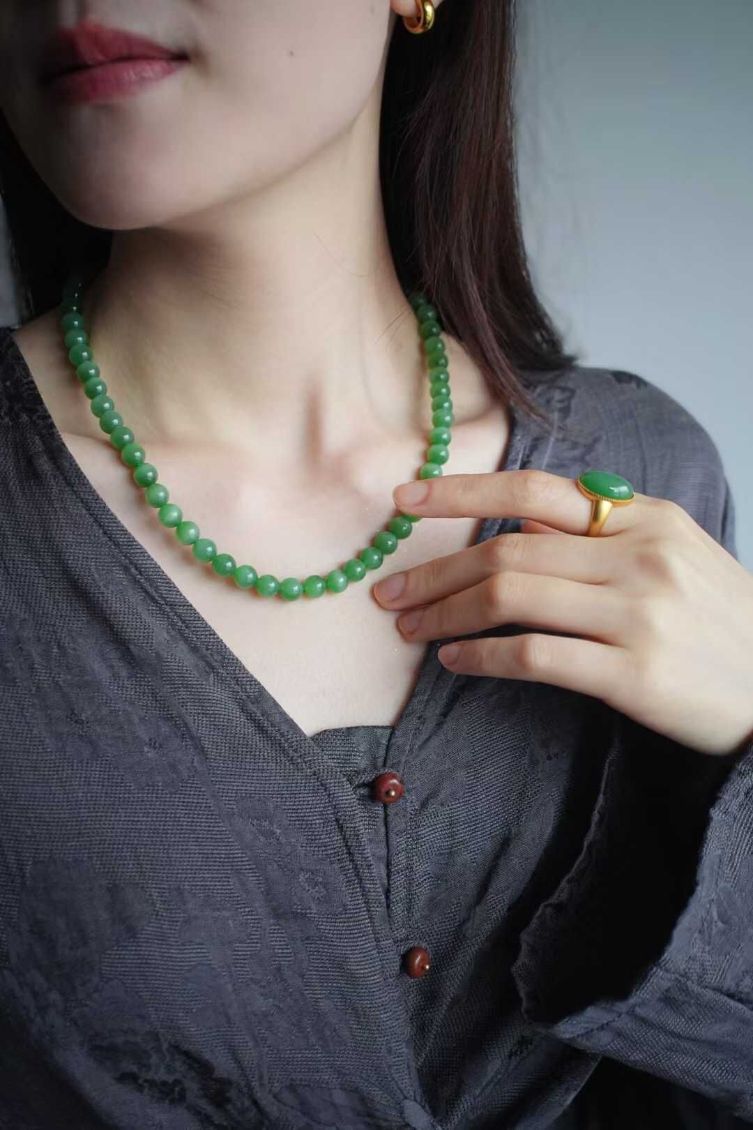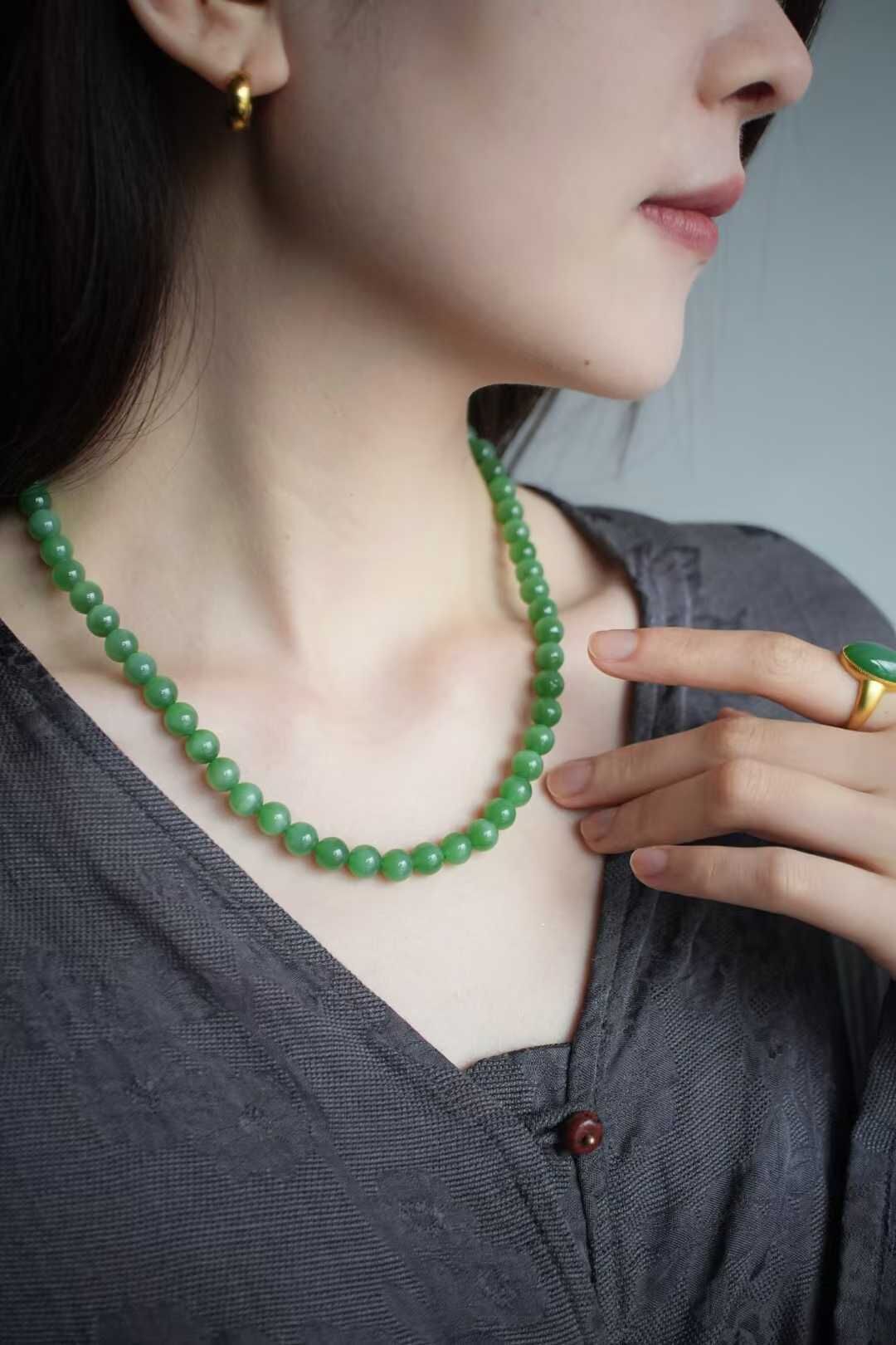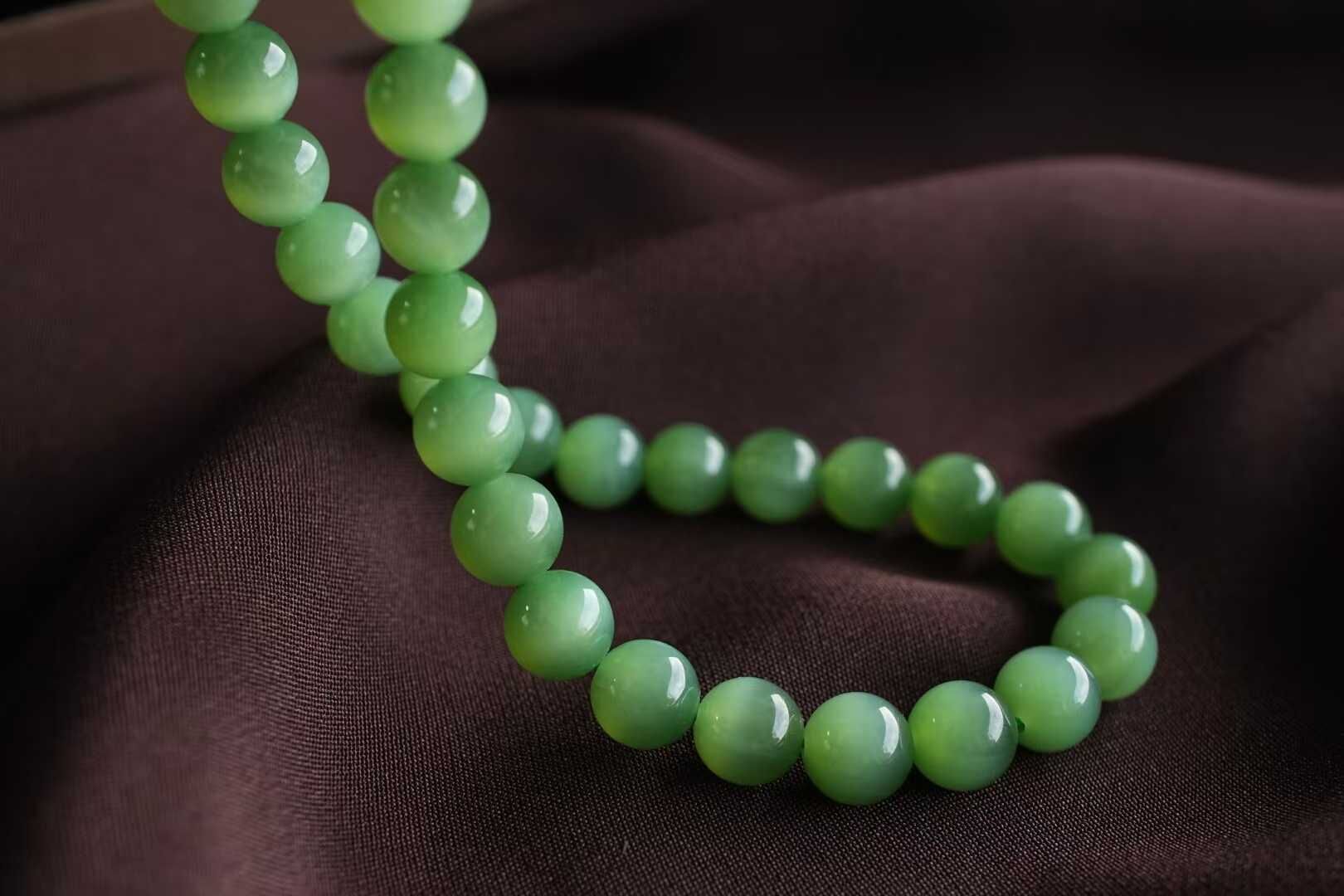 • 和田玉老料碧玉貓眼圓珠項鏈 (8mm直徑),天然和田玉軟玉