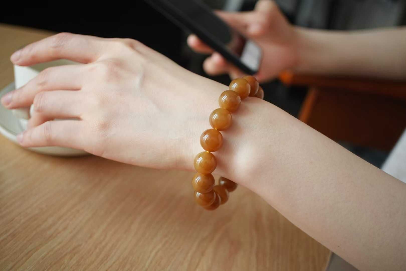 61647 和田玉且末金山礦純糖料圓珠手串 (12mm直徑)