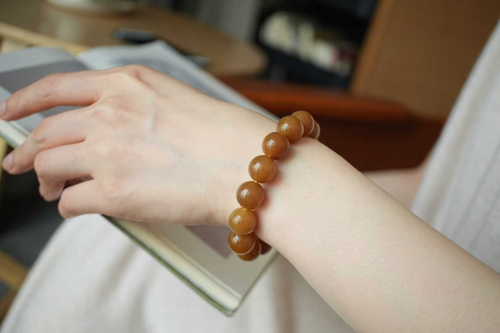 • 和田玉且末金山礦純糖料圓珠手串 (12mm直徑),天然和田玉軟玉