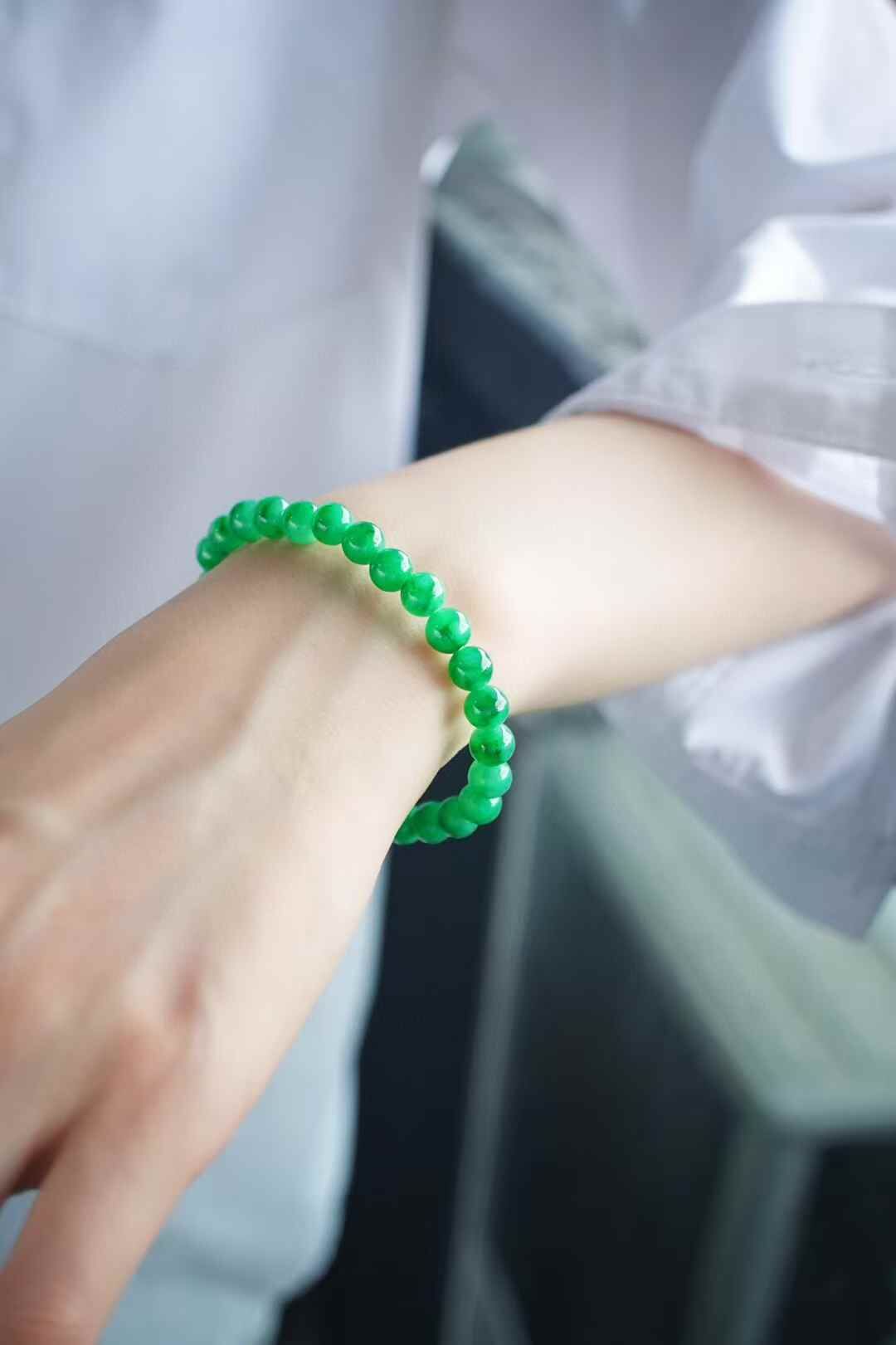 • 翡翠冰種濃陽綠珠鏈 (6.8-7mm直徑),天然翡翠A玉, 緬甸玉, Jade, Jadeite