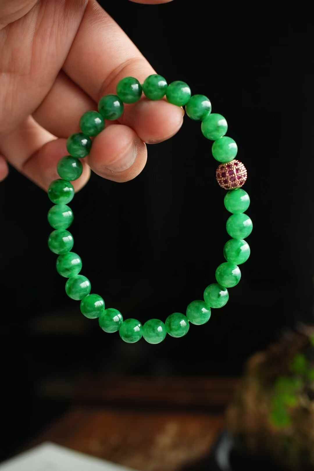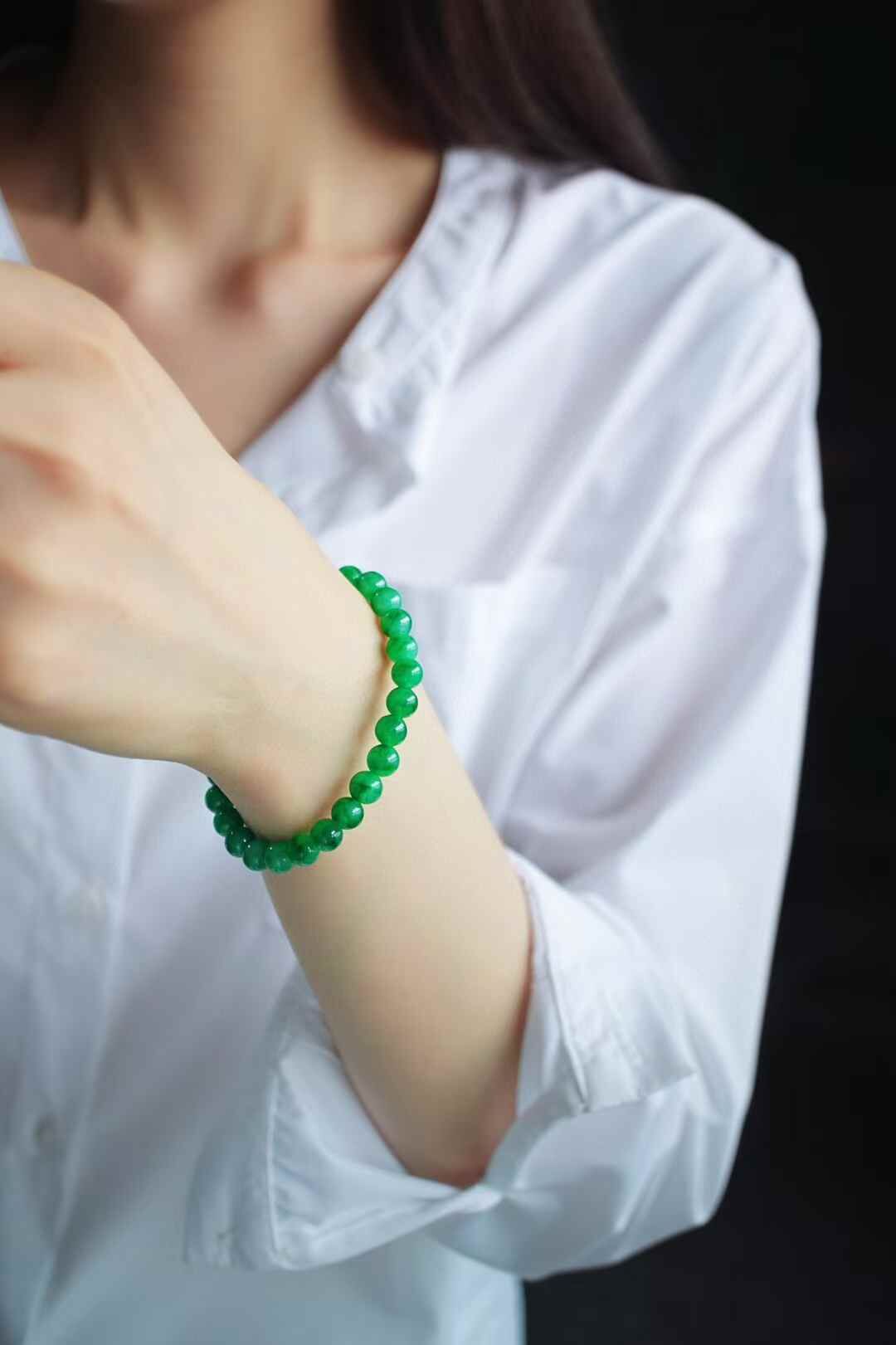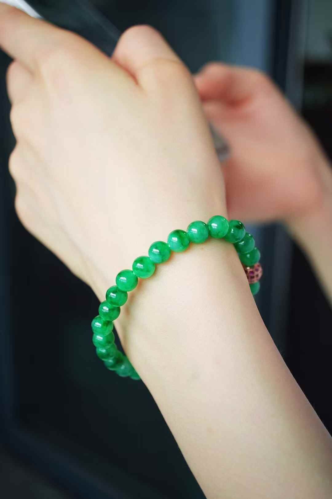 天然翡翠A玉,緬料老坑種,7mm滿色手串,實物比拍出來的要濃,要艷,要辣!這個色太美了,種特別老,細膩油潤感,種色相輔相成,襯託的顏色更加辣陽水潤。越看越美!一條畢業。