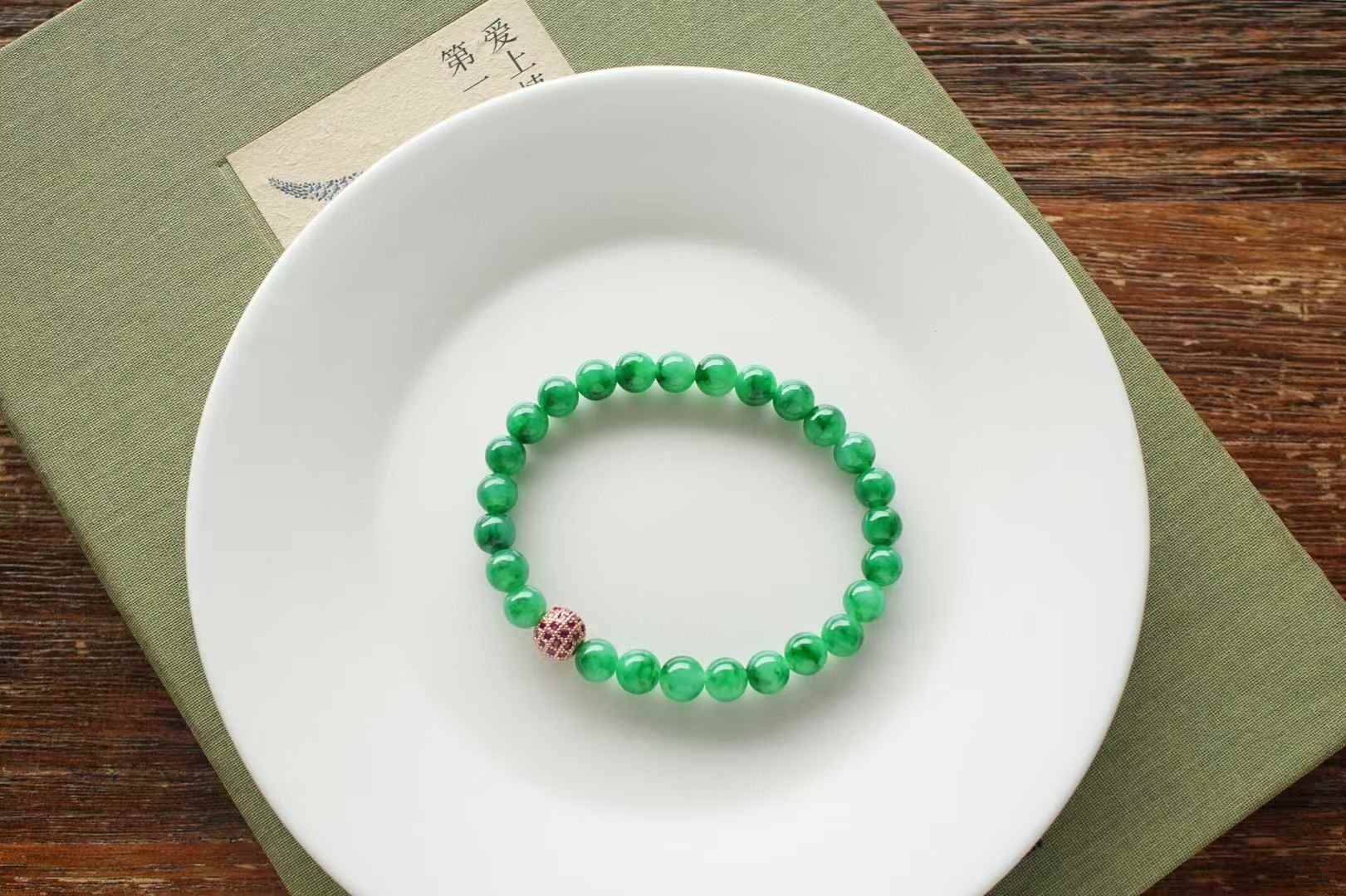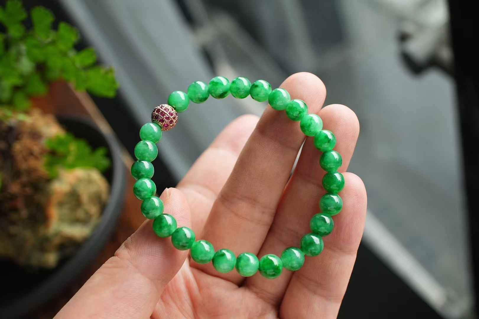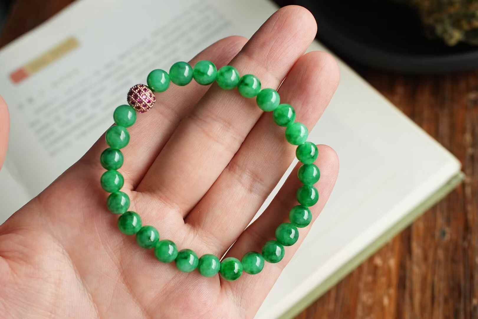天然翡翠A玉,緬料老坑種,7mm滿色手串,實物比拍出來的要濃,要艷,要辣!這個色太美了,種特別老,細膩油潤感,種色相輔相成,襯託的顏色更加辣陽水潤。越看越美!一條畢業。