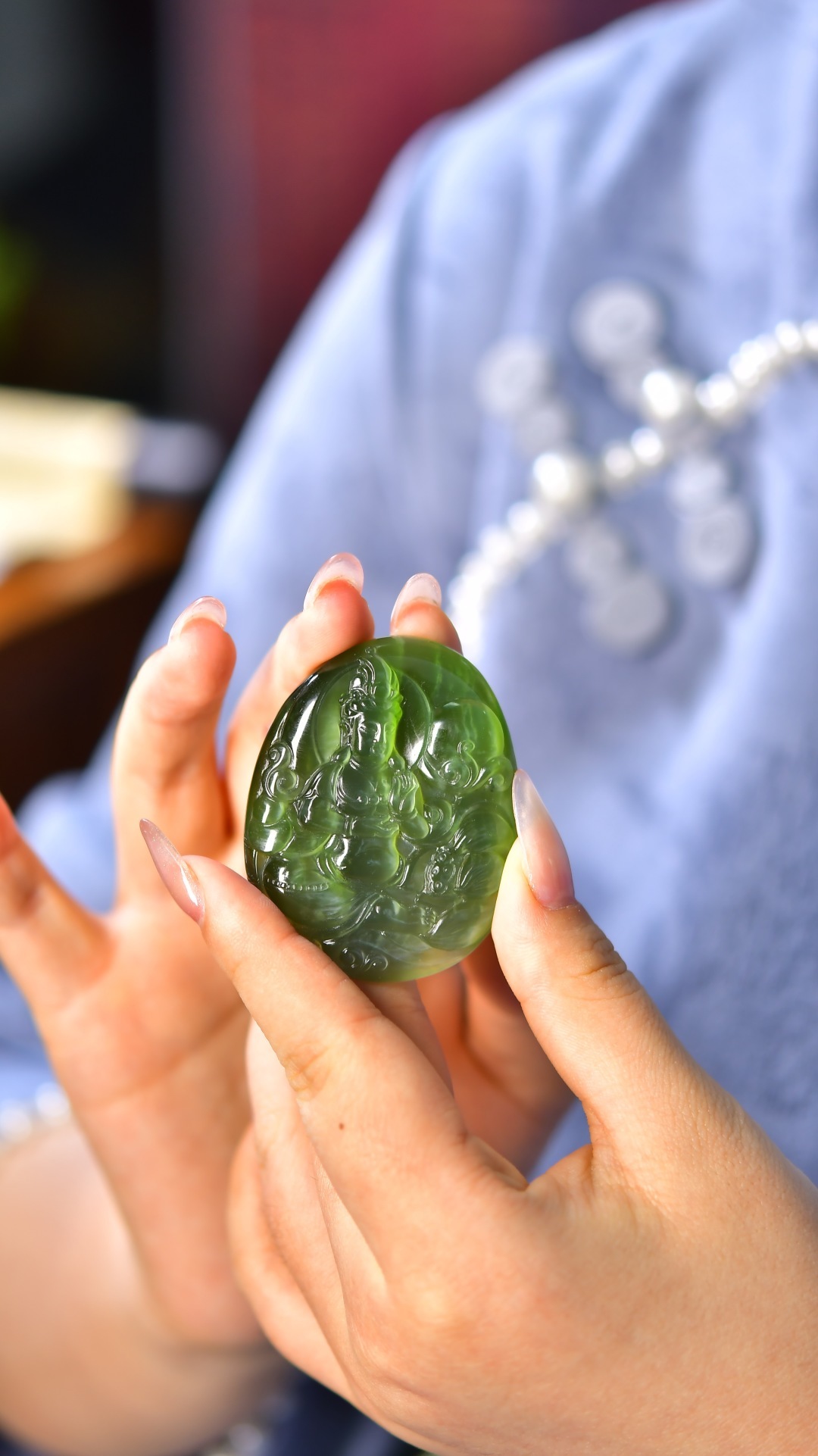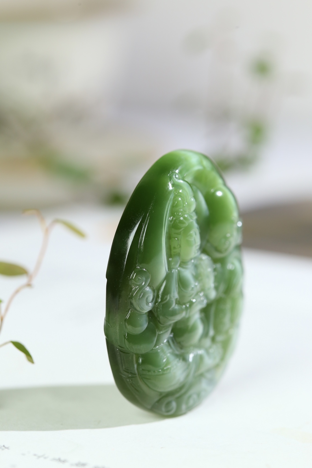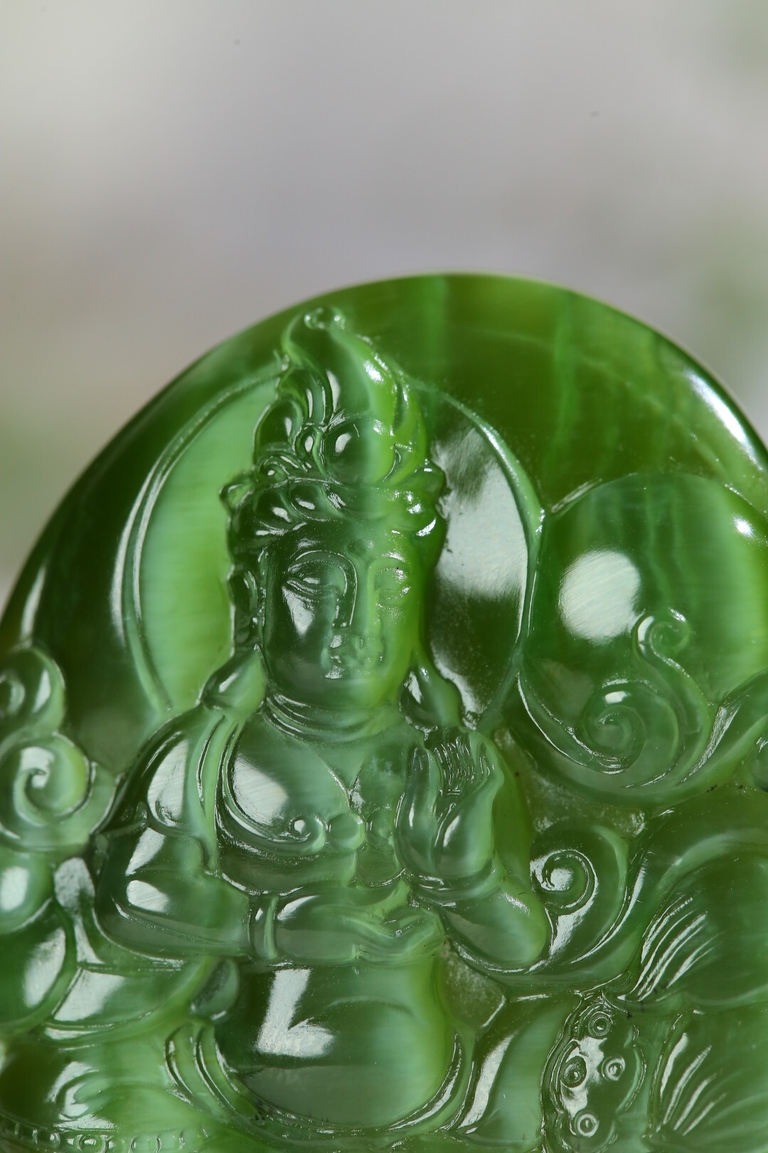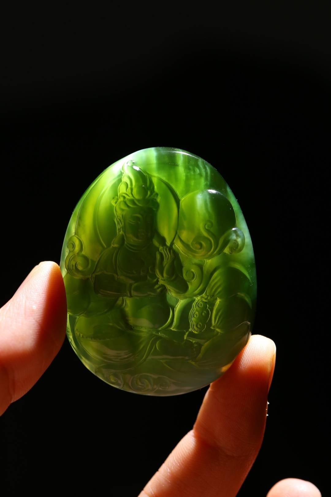 和田玉碧玉貓眼掛件,玉質細膩油潤,雕工精湛,線條柔美,觀音菩薩慈祥俊秀,威武端莊,佛光冉冉,意蘊悠悠,仙氣十足,使人望之心安。