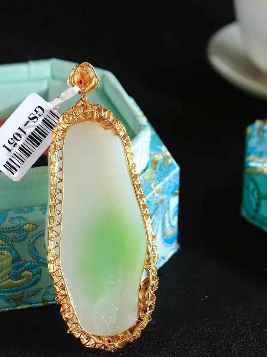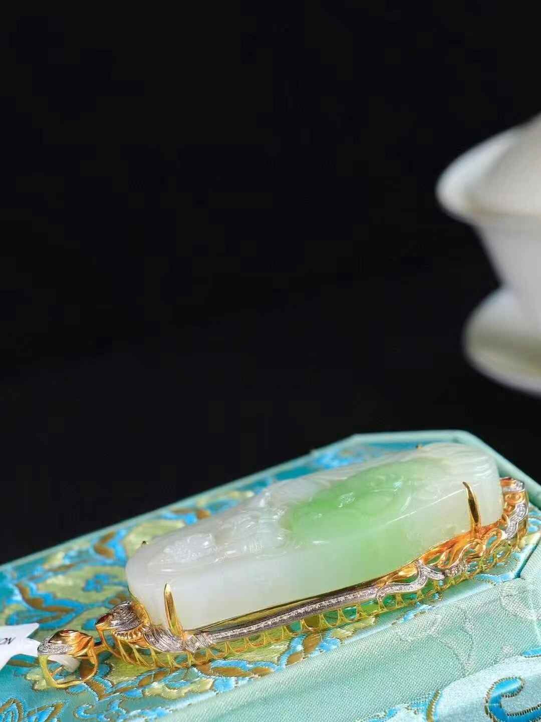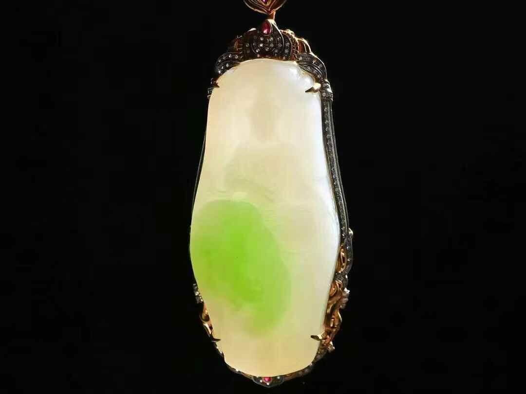 收藏傳家級臻品,和田玉翠青18K金鑲嵌普賢菩薩掛件,玉質溫潤細膩,油性十足。