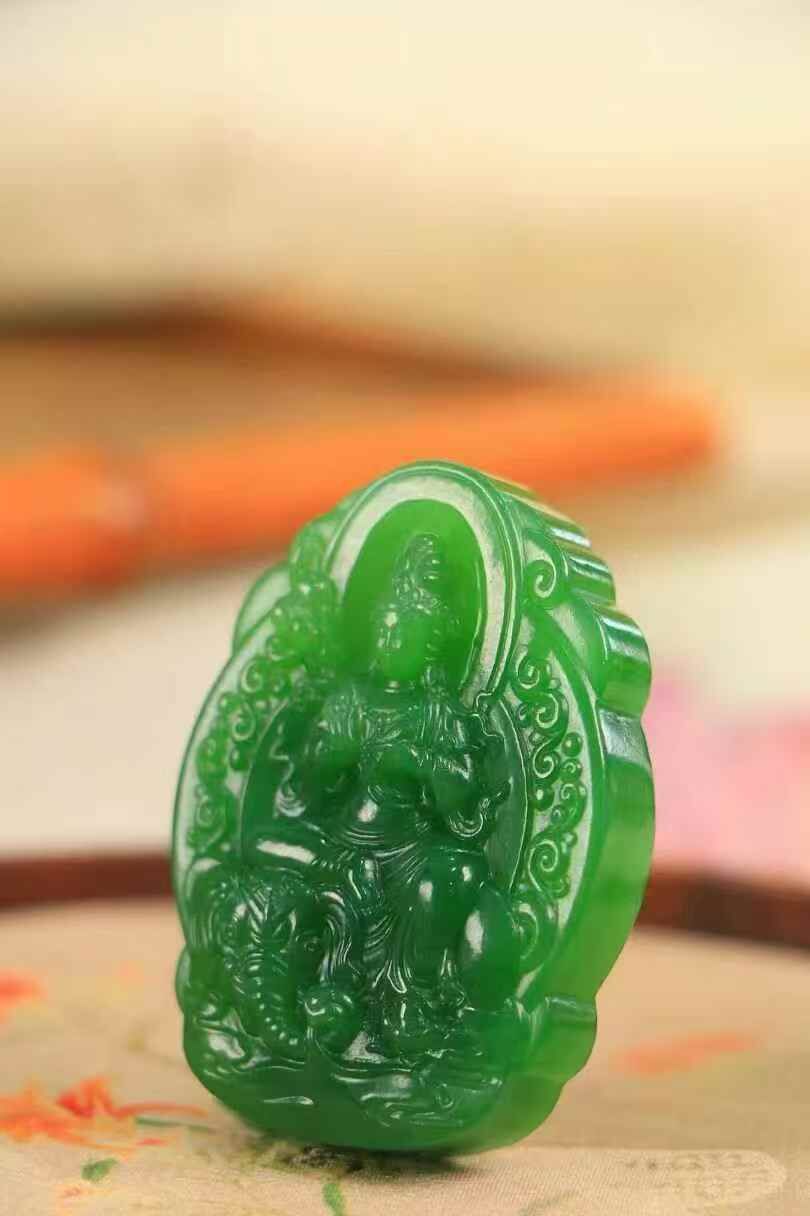 和田玉老坑碧玉,面容慈祥,隨有吉象,衣縷飄逸,普賢菩薩以獨特的智慧之光遍照世。