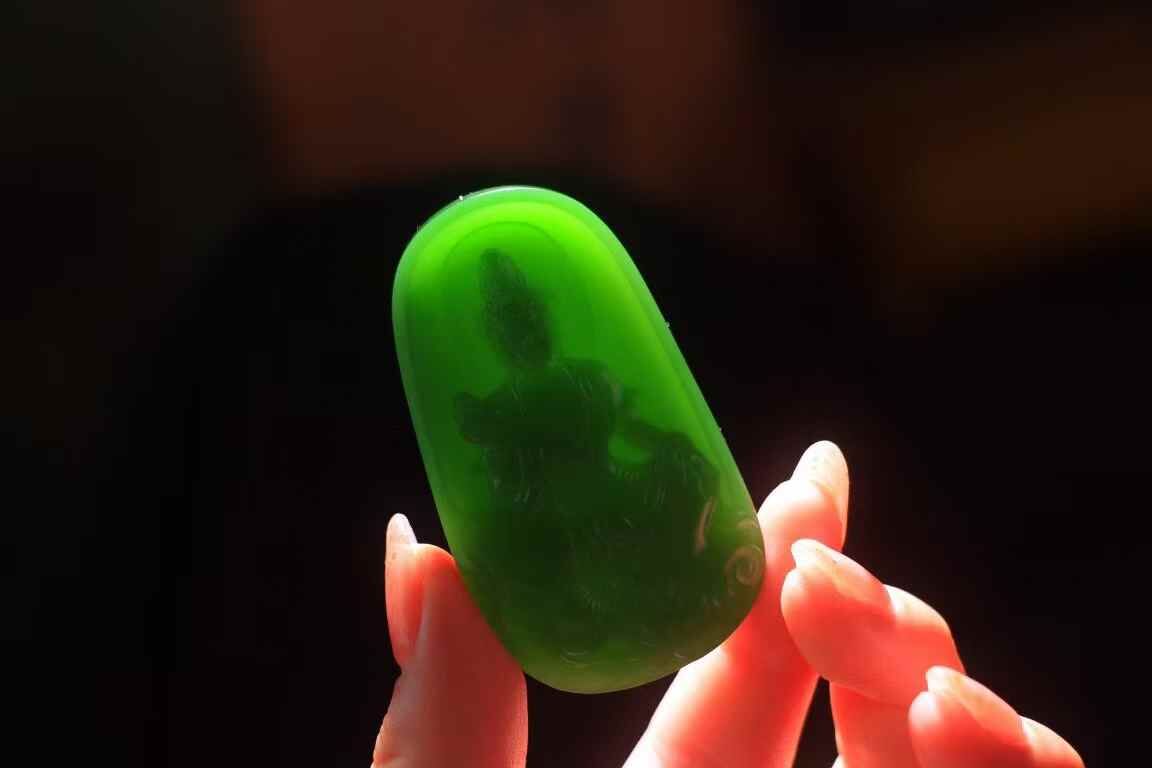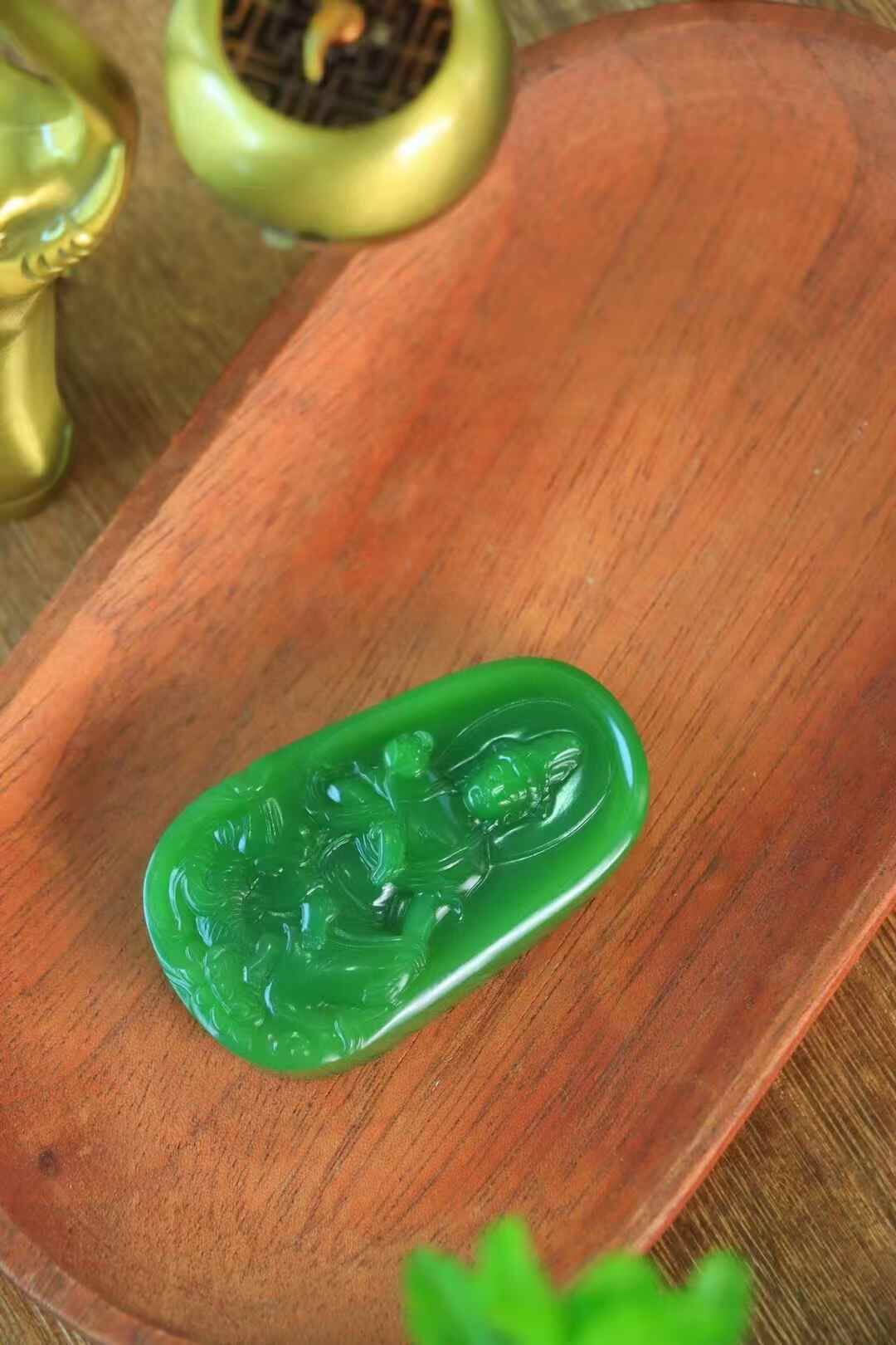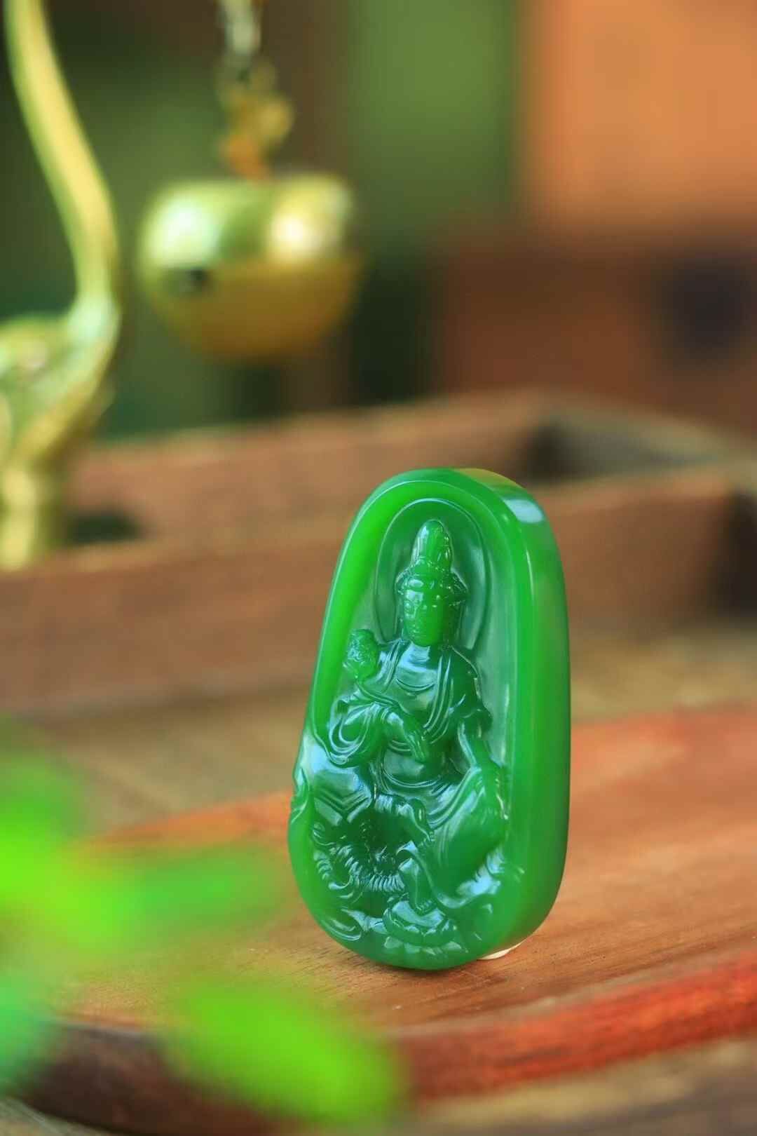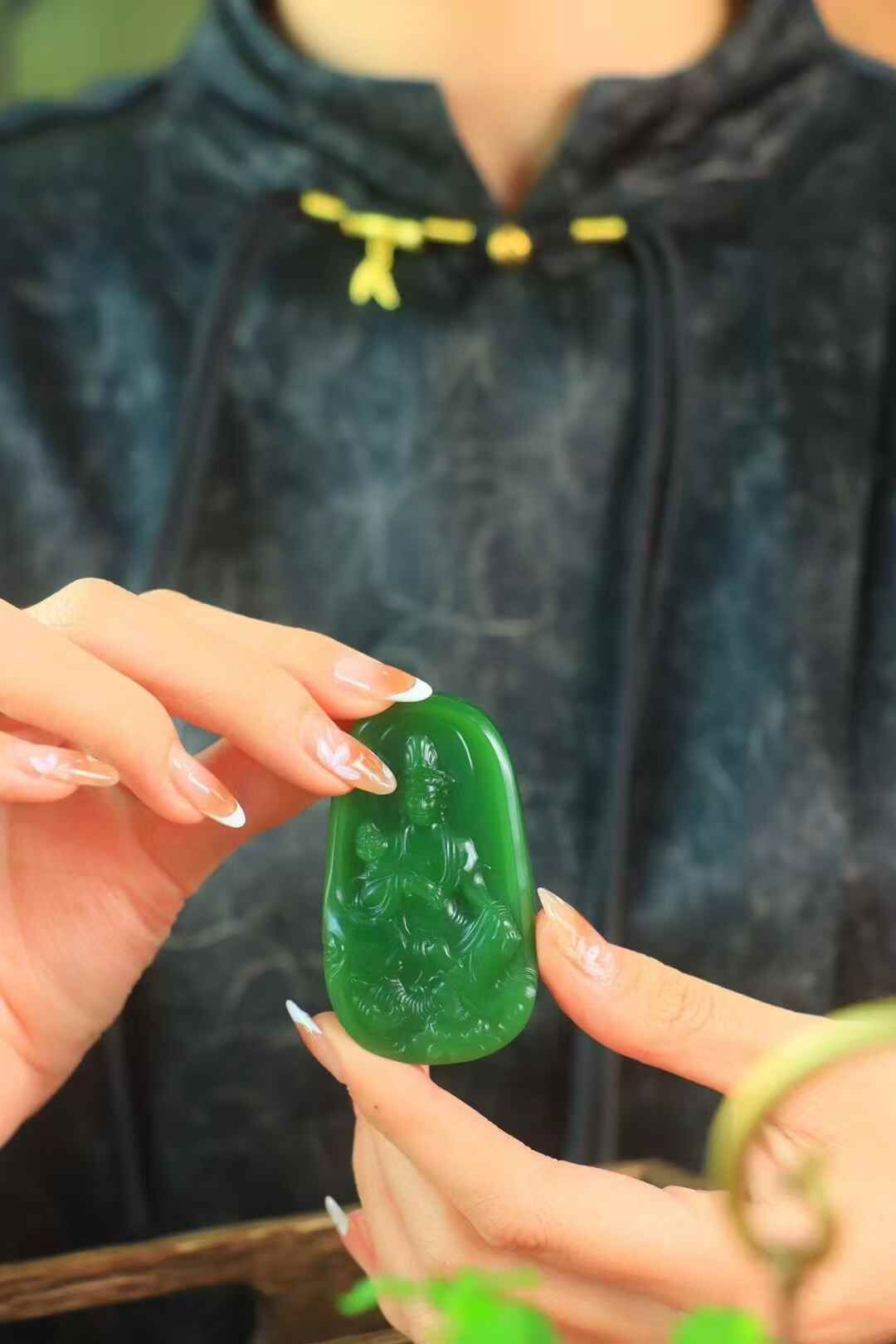 和田玉老坑料碧玉,臻品收藏,上手細潤出油,浮雕觀音法相,端莊慈祥,佛光普照,手持蓮花,安坐大象身上,做工精細,生動傳神,造型規整大氣,佩戴護佑平安,吉祥納福。
