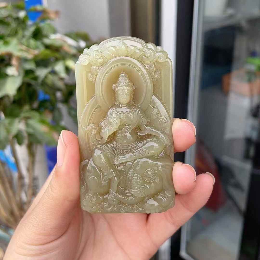 稀有普賢菩薩,和田玉冰底糖料,玉質細膩溫潤,密度油潤極佳!精雕普賢菩薩,佛光加持,端坐普法,身隨六牙白象。普賢菩薩是屬龍與屬蛇人的本命佛,寓意事事順心,心想事成!