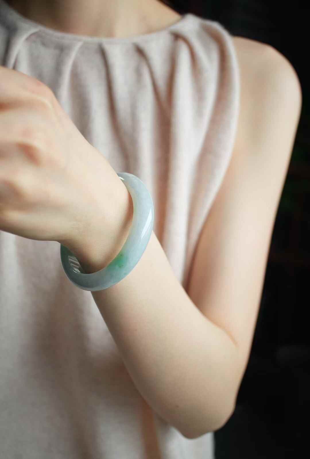 天然翡翠A玉,冰糯種飄陽綠,有這抹飄色上手就很吸睛,種老底子不錯,很細膩,寬版正裝,上手典雅大方!