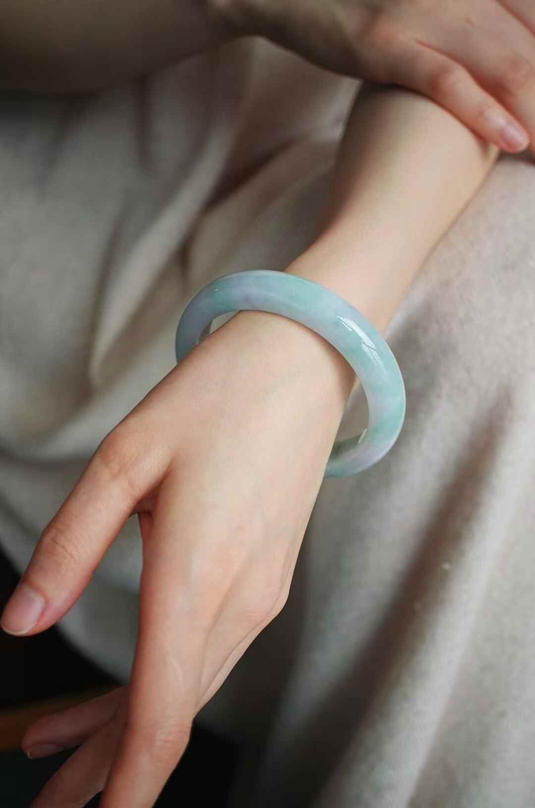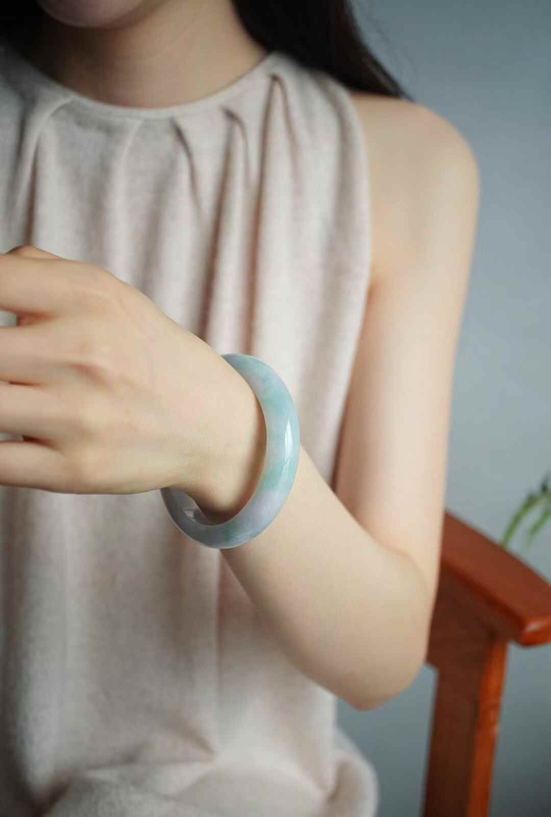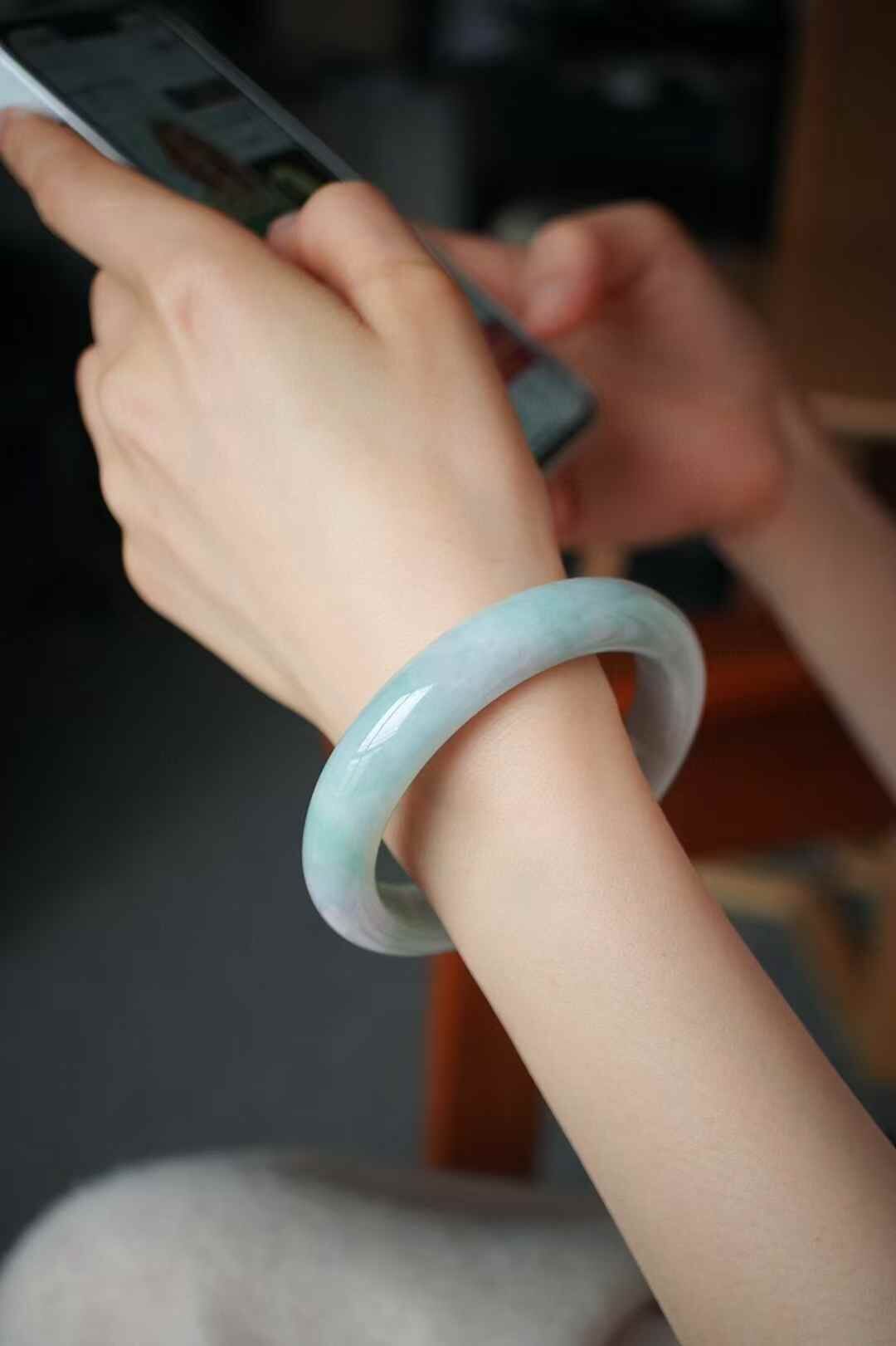 天然翡翠A玉,緬料老坑種,這條顏色漂亮啊,淡紫羅蘭底子很細膩,大段飄綠,太美了,還是難得59.8大圈口。