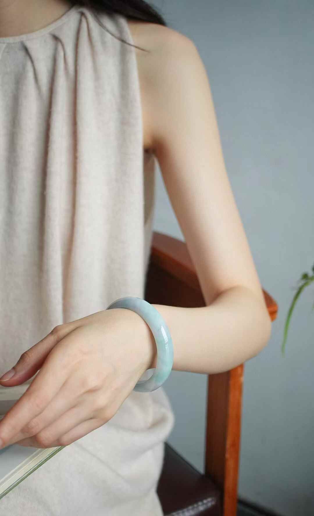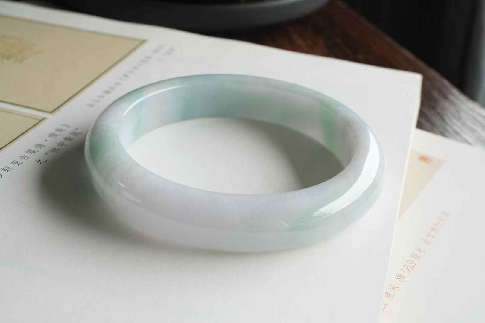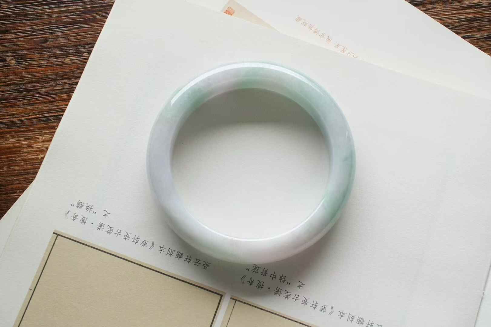 天然翡翠A玉,緬料老坑種,這條顏色漂亮啊,淡紫羅蘭底子很細膩,大段飄綠,太美了,還是難得59.8大圈口。