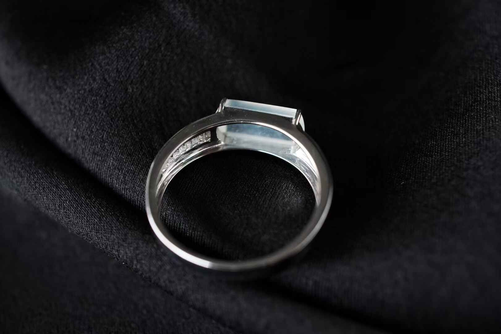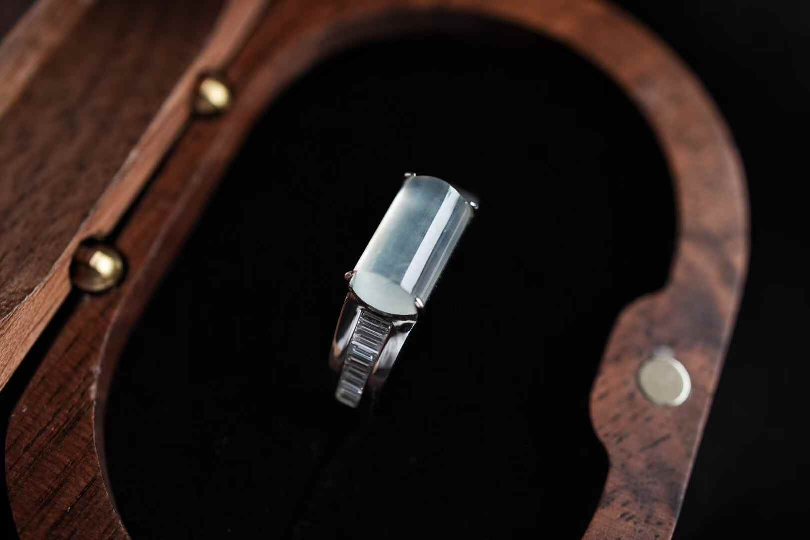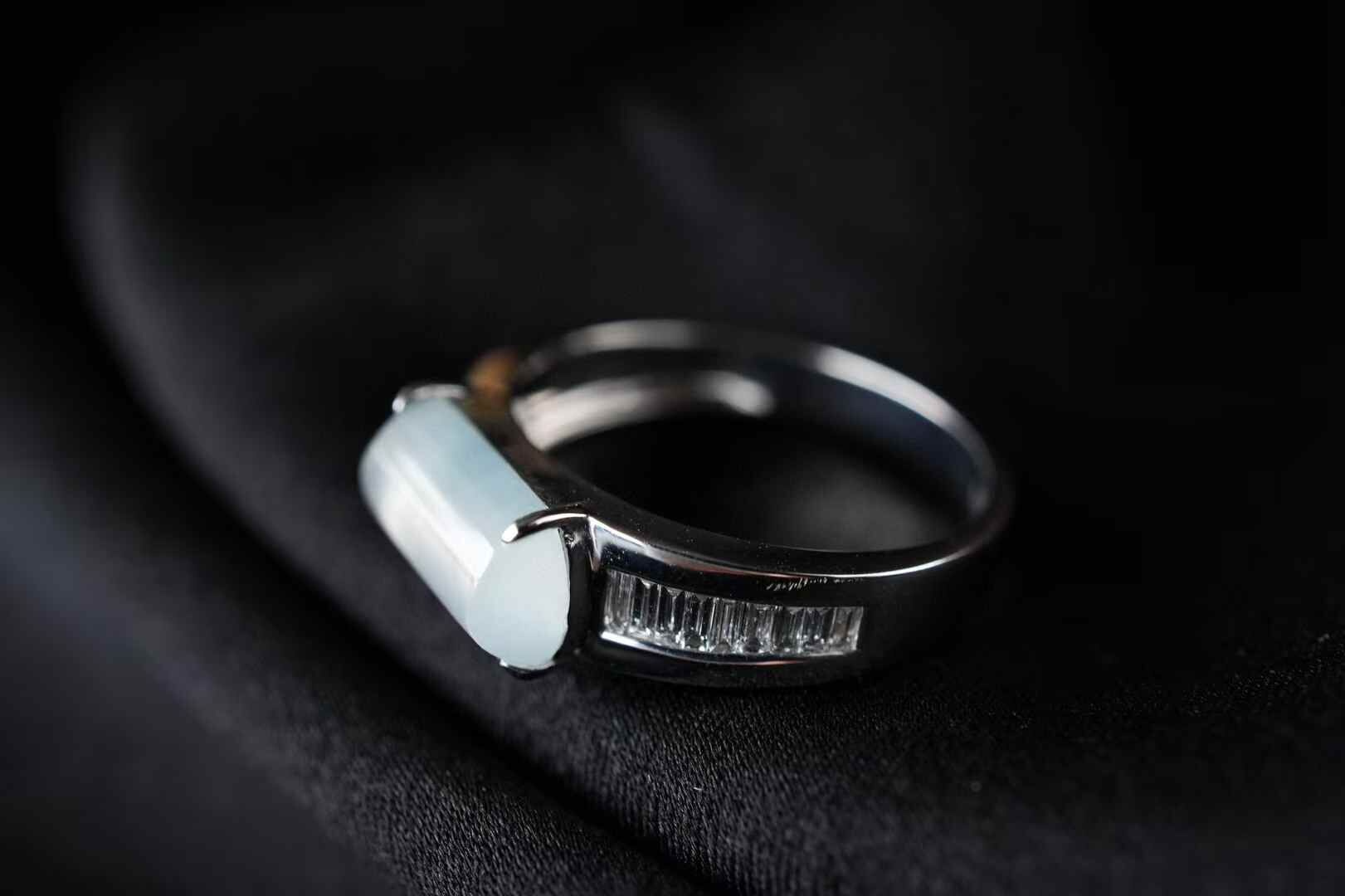 喜歡簡鑲設計,刪繁就簡,鬆弛時尚。天然翡翠A玉,18K金鑲嵌,戒臂一面磨砂,一面鑲鑽,裸石冰種起光,馬鞍戒的利落大方,很有獨特魅力。